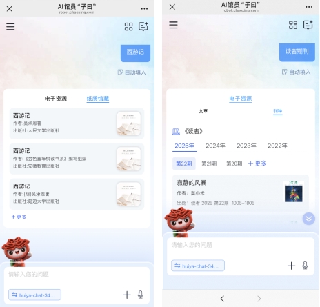 1.海量资源, 一键获取!支持一键式AI文献检索与获取,省去多平台查找的繁琐。对“子曰”说:我想看“西游记”,他会迅速为您推送相关的电子图书和纸质馆藏资源;如果您想查“读者期刊”,他会贴心地为您推送相关期刊。