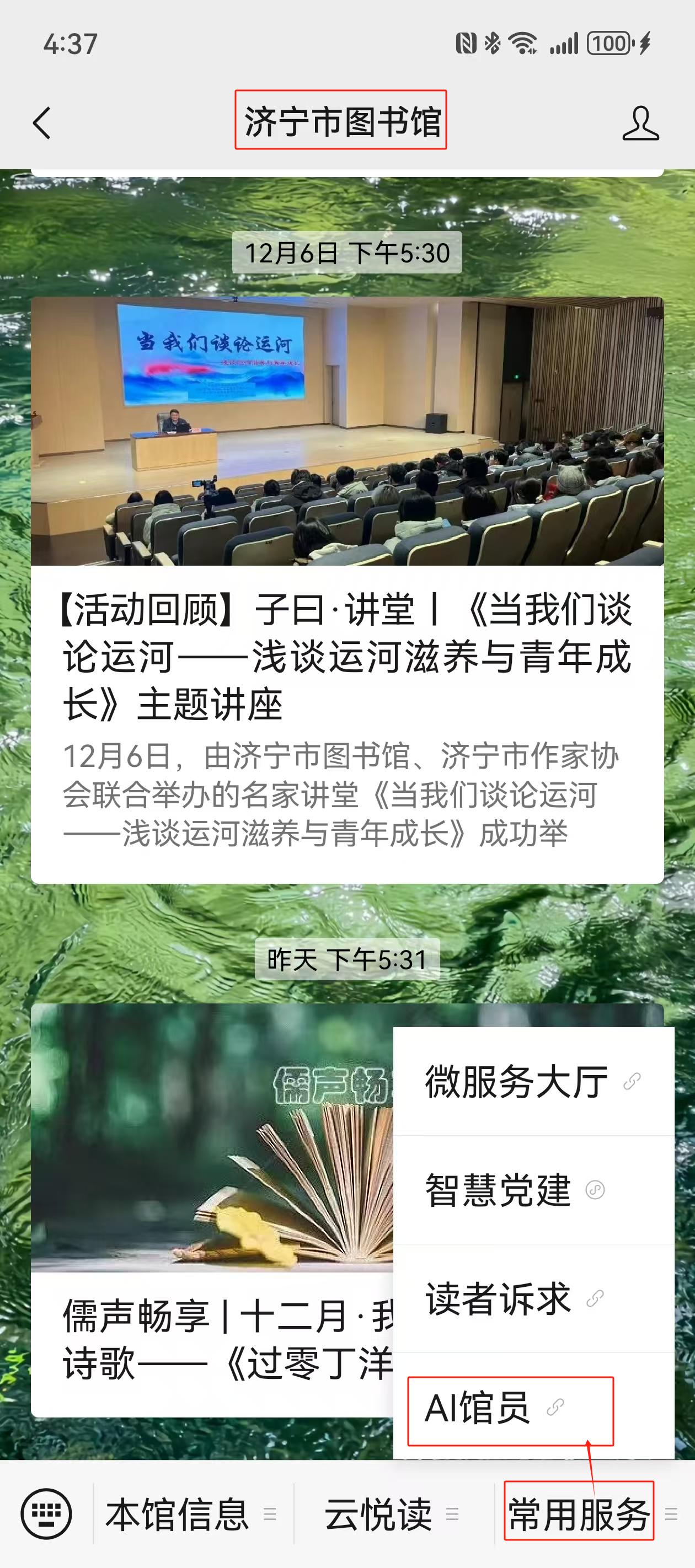 进入济宁市图书馆公众号,点击“ 常用服务 ”,选择“AI馆员”即可进入移动端对话界面。