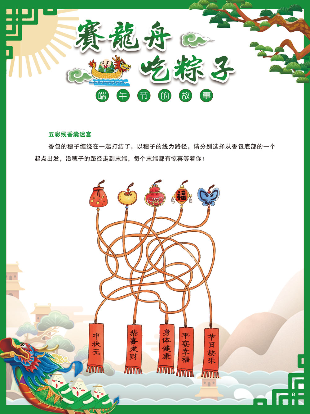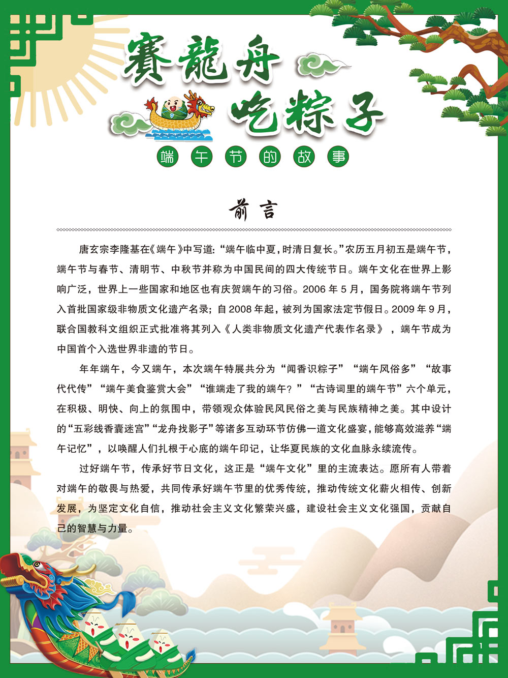 农历五月初五是端午节,本次端午特展共分为“闻香识粽子”“端午风俗多”“故事代代传”“端午美食鉴赏大会”“谁端走了我的端午?”“古诗词里的端午节”六个单元,在积极、明快、向上的氛围中,带领观众体验民风民俗之美与民族精神之美。其中设计的“五彩线香囊迷宫”“龙舟找影子”等诸多互动环节仿佛一道文化盛宴,能够高效滋养“端午记忆”,以唤醒人们扎根于心底的端午印记,让华夏民族的文化血脉永续流传。 过好端午节,传承好节日文化,这正是“端午文化”里的主流表达。愿所有人带着对端午的敬畏与热爱,共同传承好端午节里的优秀传统,推动传统文化薪火相传、创新发展,为坚定文化自信,推动社会主义文化繁荣兴盛,建设社会主义文化强国,贡献自己的智慧与力量。