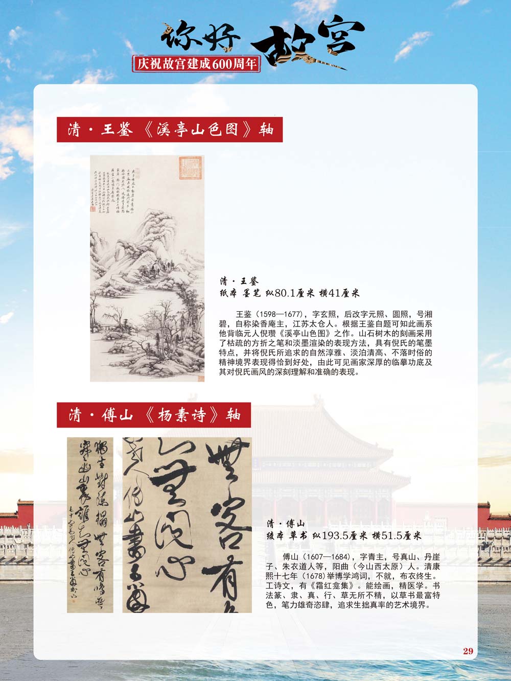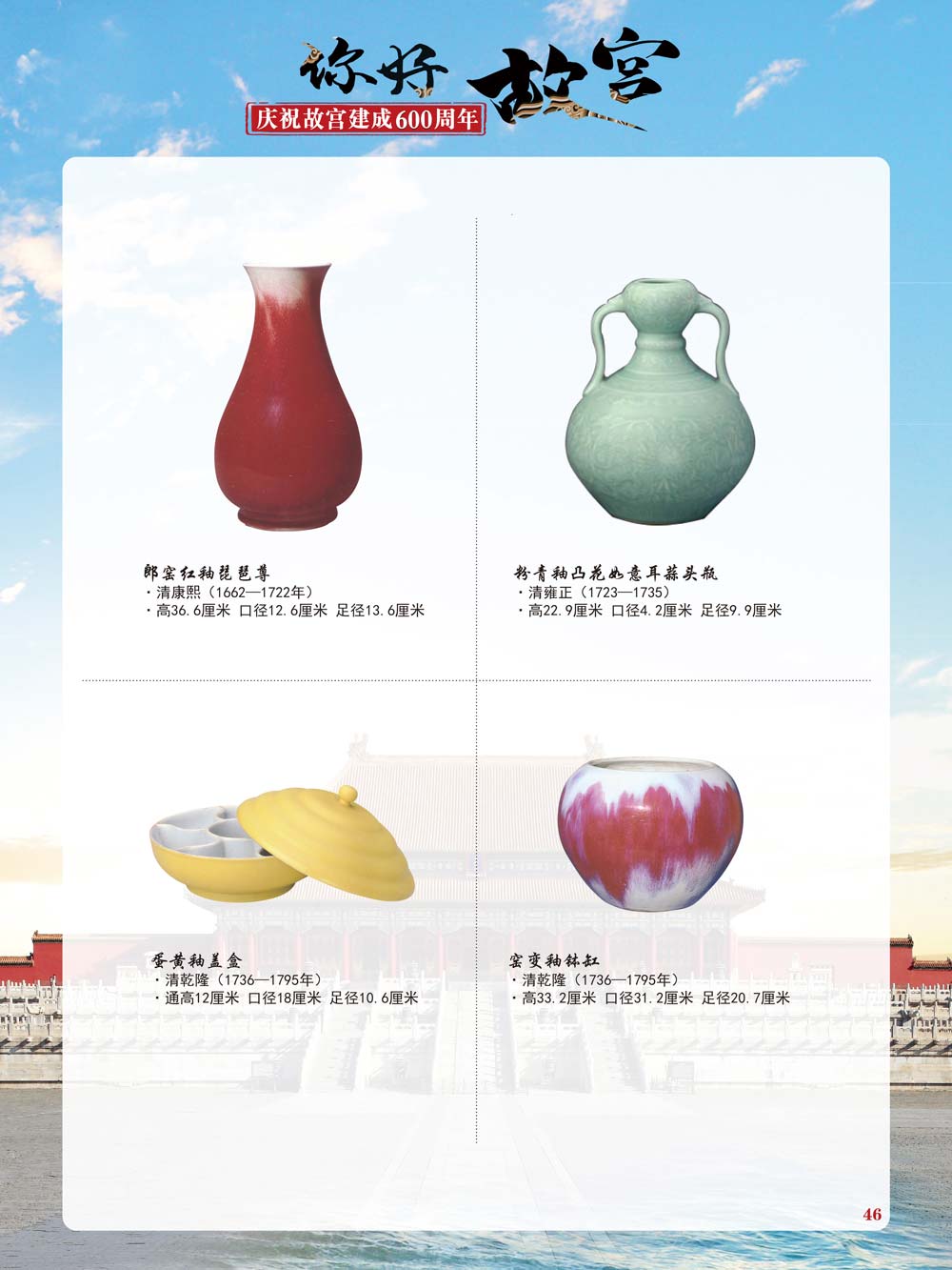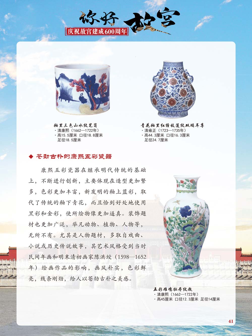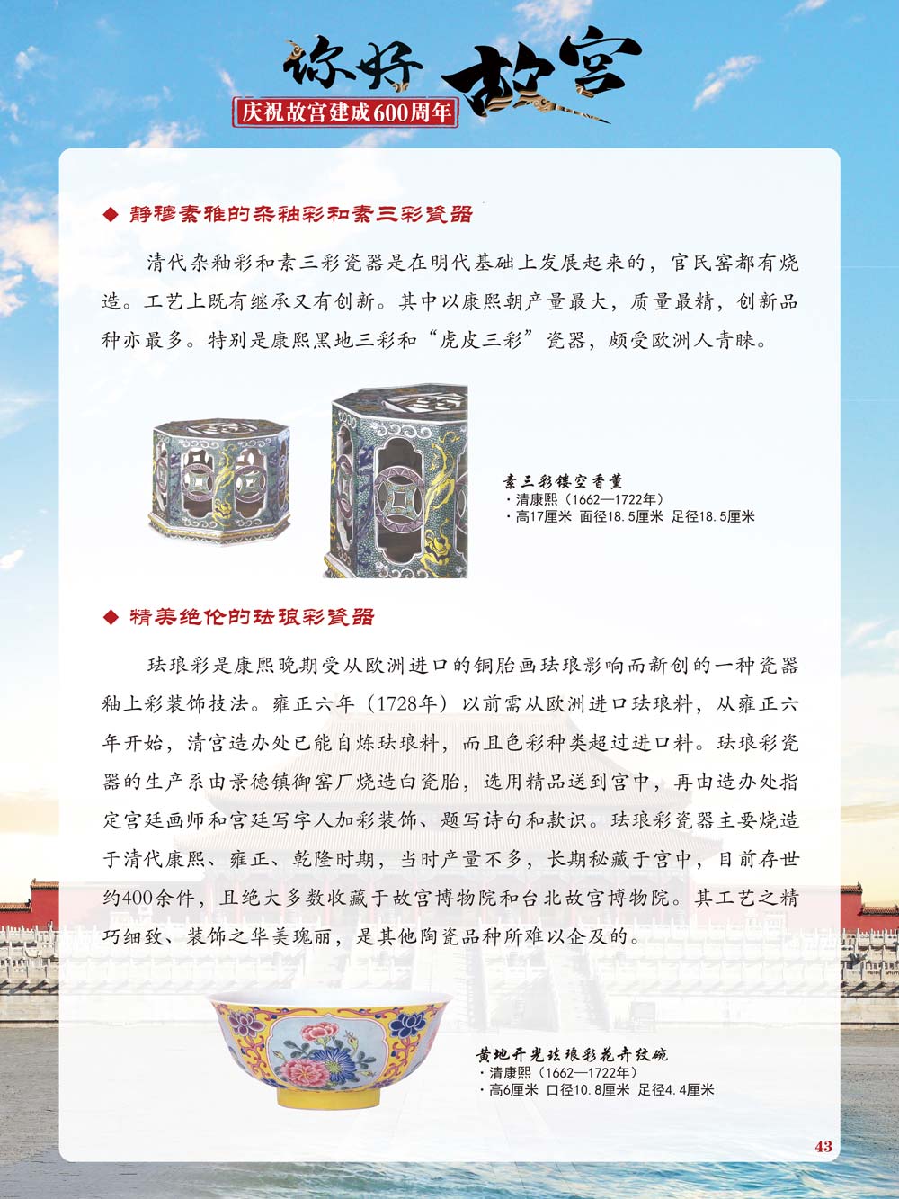 故宫是了解中国历史文化不可或缺的窗口。它其实有两个名字,一个名叫故宫博物院,90多岁了;一个名叫紫禁城,今年整整600岁了。 历史文物承载着一个民族的灿烂文明,本展览立足于故宫建成600周年,通过介绍故宫的建筑、字画、陶瓷,让观众不仅可以欣赏精美的文物,还可以在历史的氛围中徜徉传承和发扬中华优秀传统文化。故宫的每一座宫殿建筑、朱漆大门、院落桥梁、青砖黄瓦、宫廷陈设、梁枋彩画,承载着丰富的历史符号、文化内涵。书画藏品是故宫博物院艺术藏品的重中之重,阎立本《步辇图》,张择端《清明上河图》,王羲之、欧阳询等名家书法成为故宫镇院之宝。陶瓷,是文明的象征,每件作品背后的文化因素,让造型、釉色和装饰纹样呈现出丰富多元的面貌。陶瓷吸引人之处,在于它们呼应着源远流长的历史脉络,同时也反映出不同文化相互交流的现象。