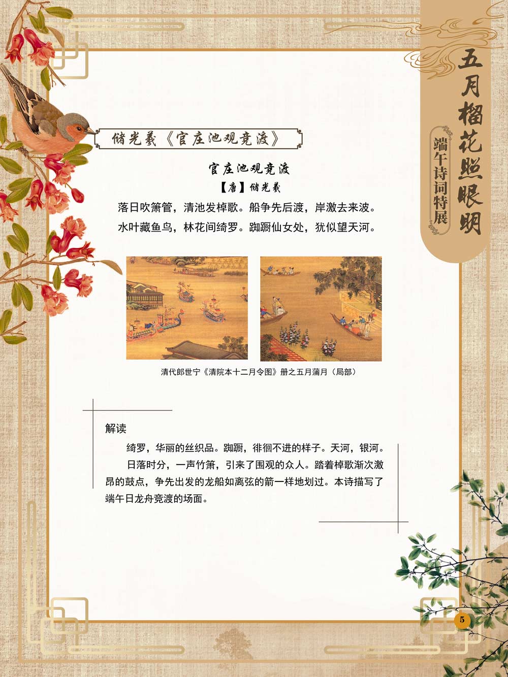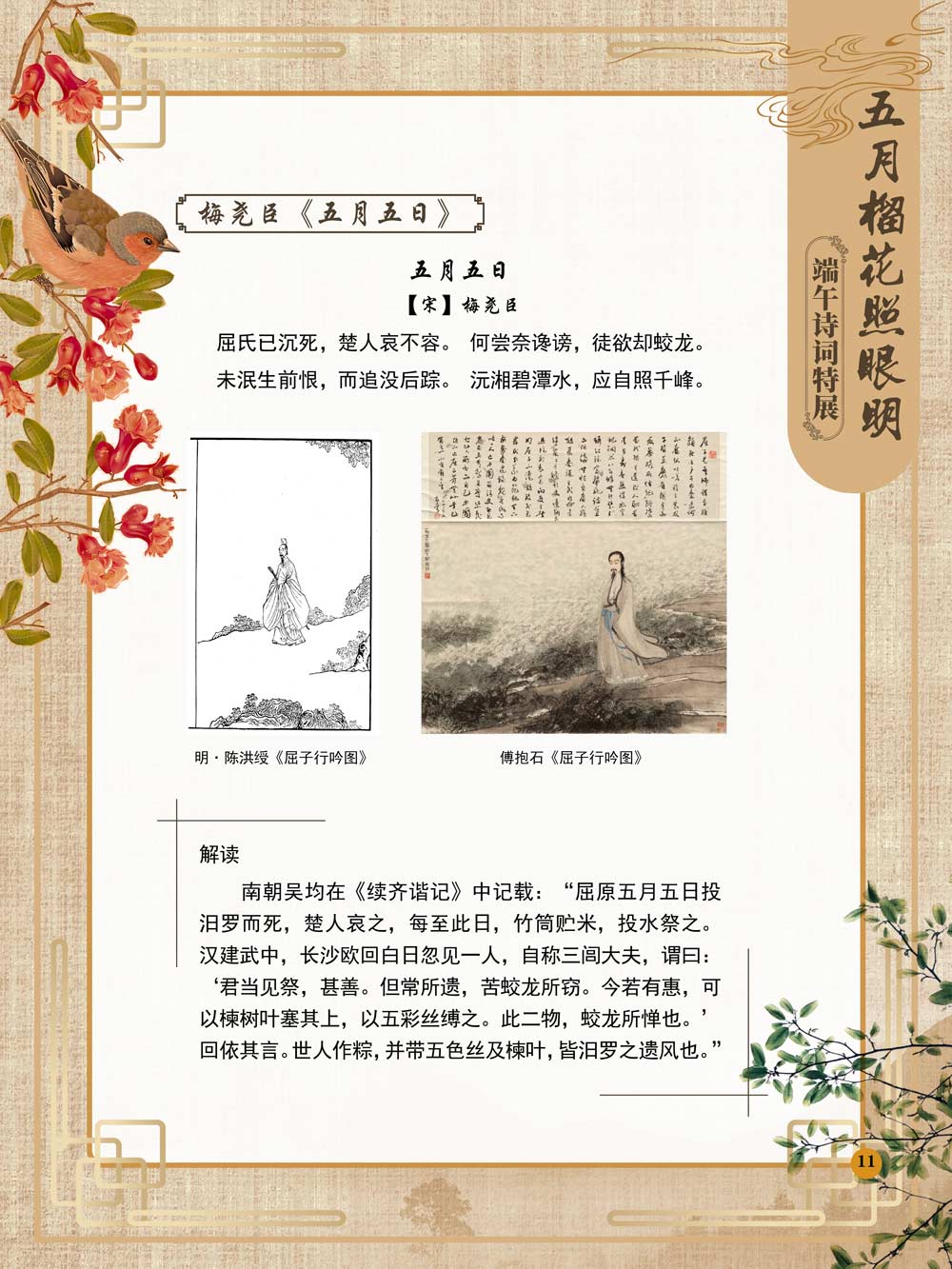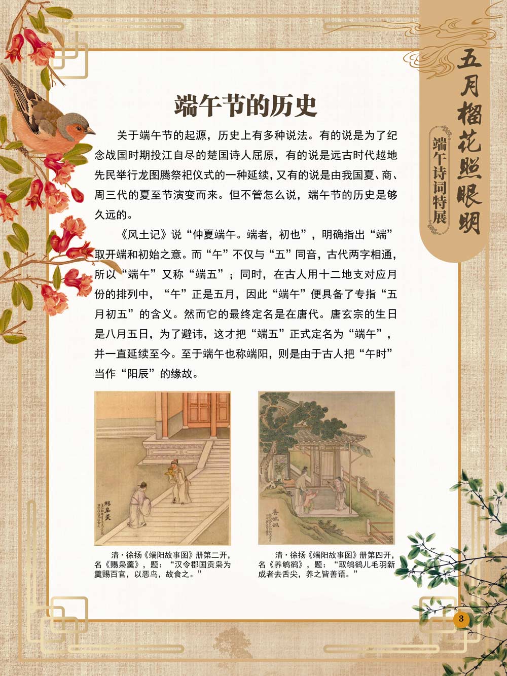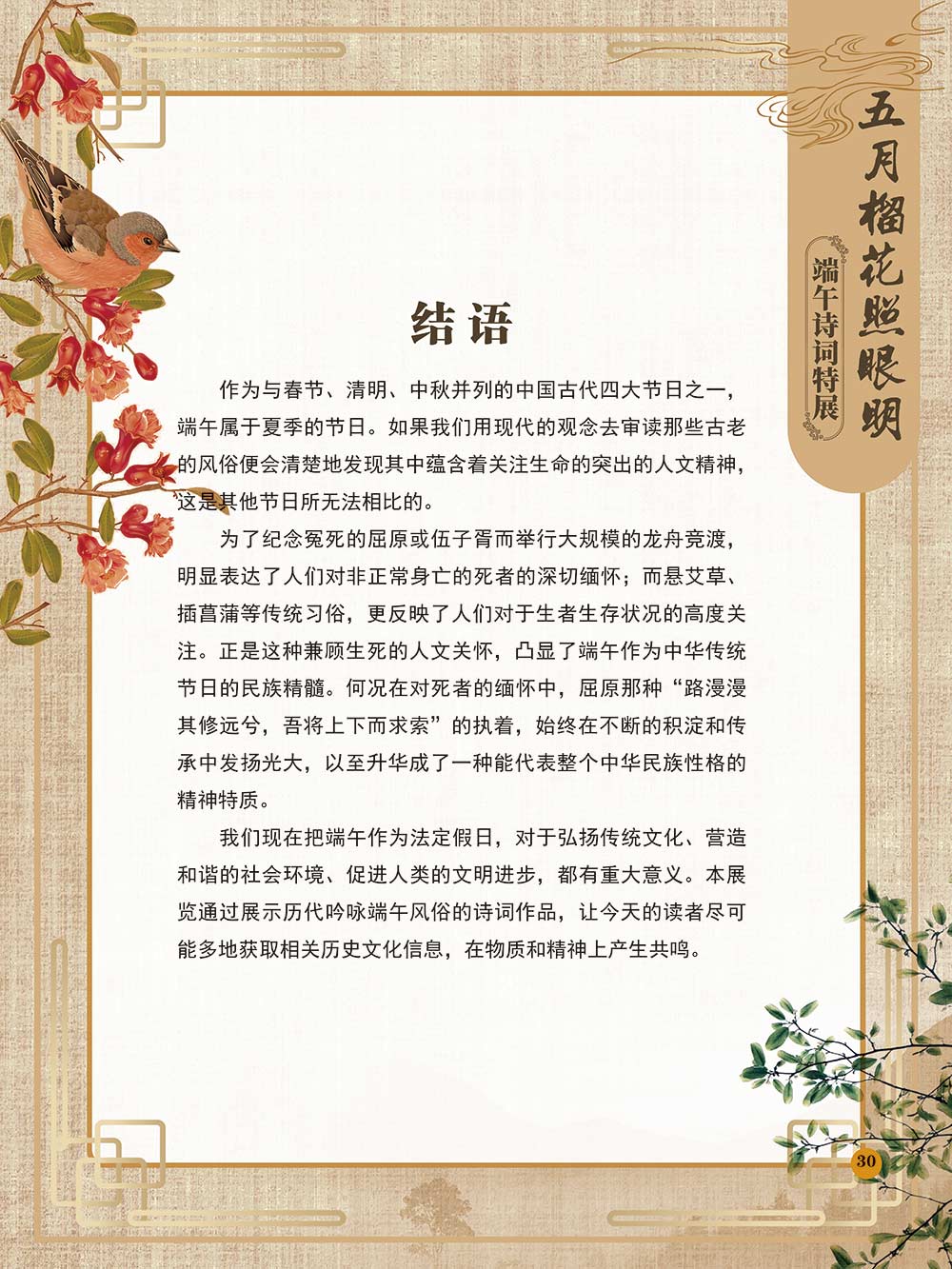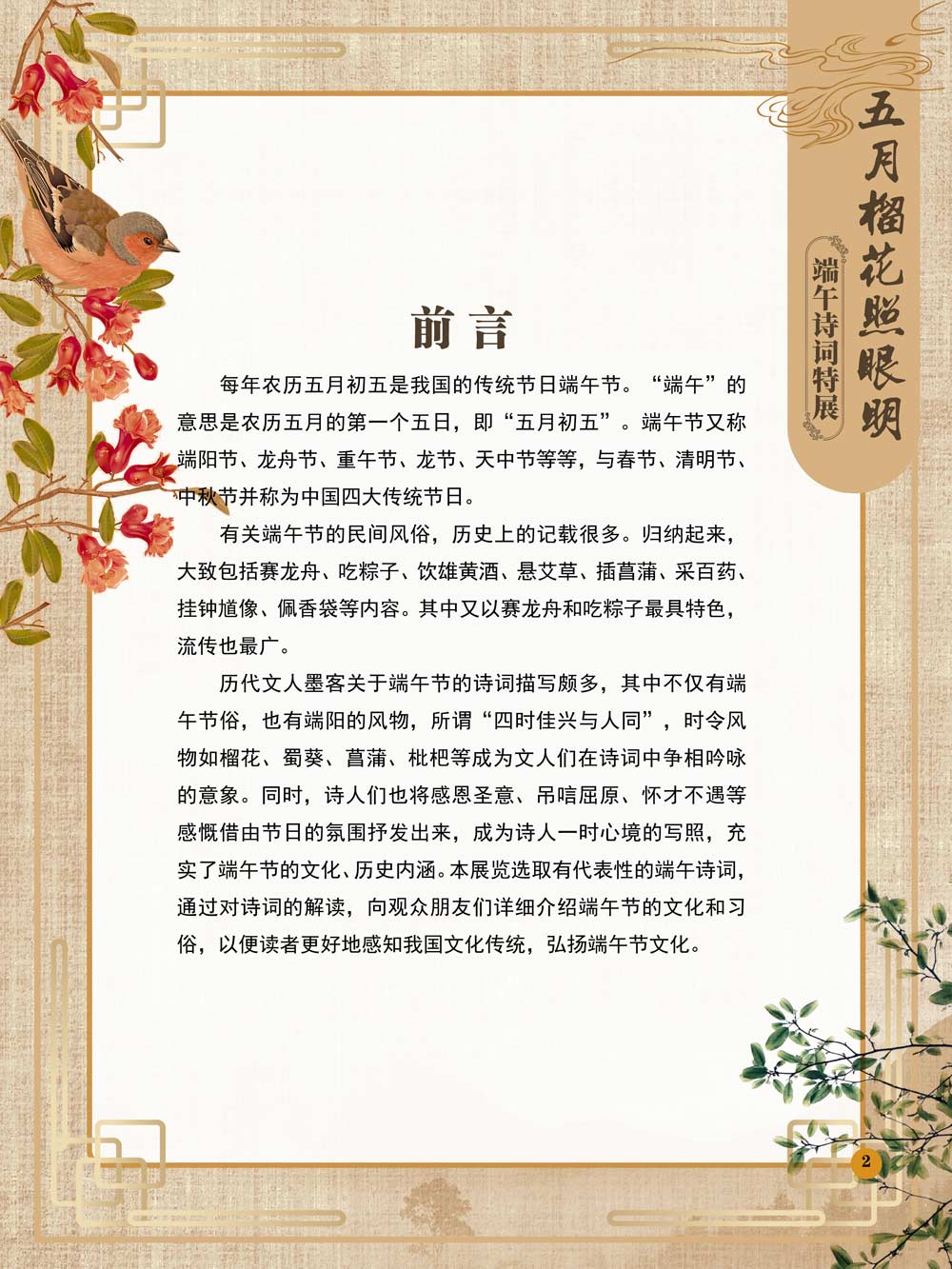 每年农历五月初五是我国的传统节日端午节。“端午”的意思是农历五月的第一个五日,即“五月初五”。端午节又称端阳节、龙舟节、重午节、龙节、天中节等等,与春节、清明节、中秋节并称为中国四大传统节日。 有关端午节的民间风俗,历史上的记载很多。归纳起来,大致包括赛龙舟、吃粽子、饮雄黄酒、悬艾草、插菖蒲、采百药、挂钟馗像、佩香袋等内容。其中又以赛龙舟和吃粽子最具特色,流传也最广。 历代文人墨客关于端午节的诗词描写颇多,其中不仅有端午节俗,也有端阳的风物,所谓“四时佳兴与人同”,时令风物如榴花、蜀葵、菖蒲、枇杷等成为文人们在诗词中争相吟咏的意象。同时,诗人们也将感恩圣意、吊唁屈原、怀才不遇等感慨借由节日的氛围抒发出来,成为诗人一时心境的写照,充实了端午节的文化、历史内涵。本展览选取有代表性的端午诗词,通过对诗词的解读,向观众朋友们详细介绍端午节的文化和习俗,以便读者更好地感知我国文化传统,弘扬端午节文化。