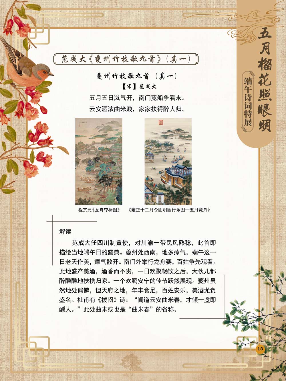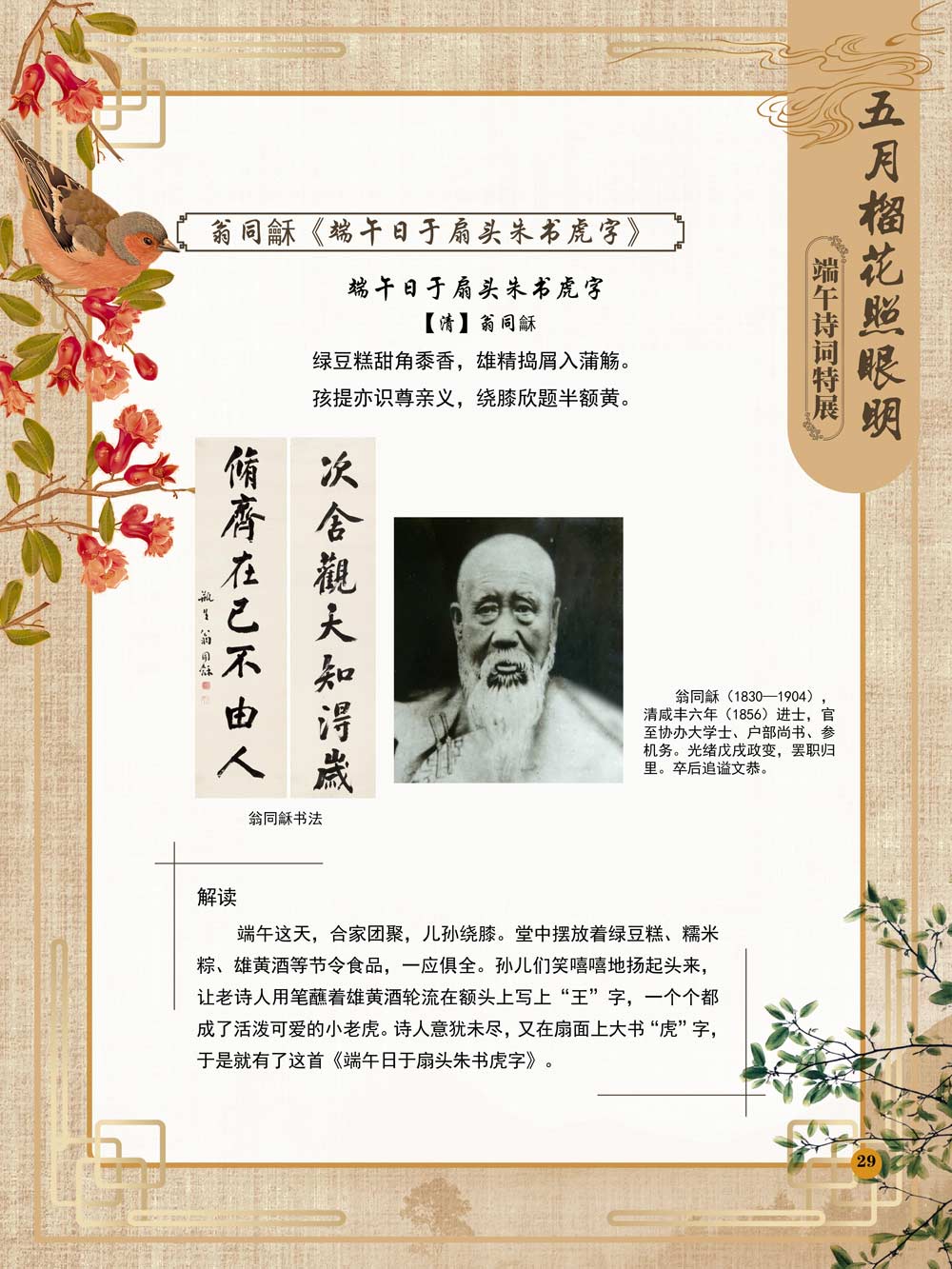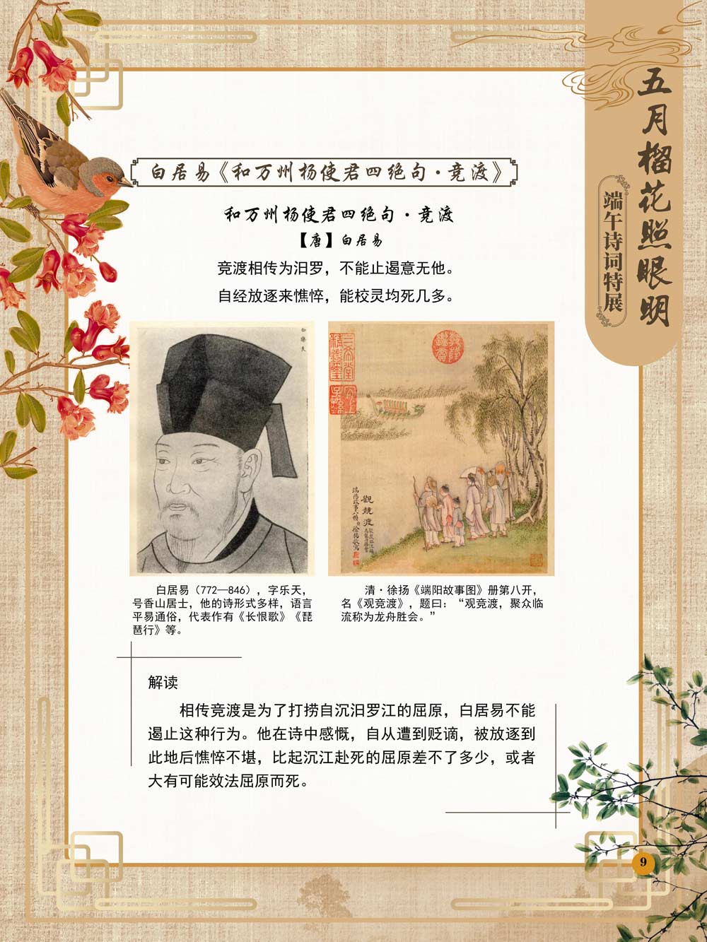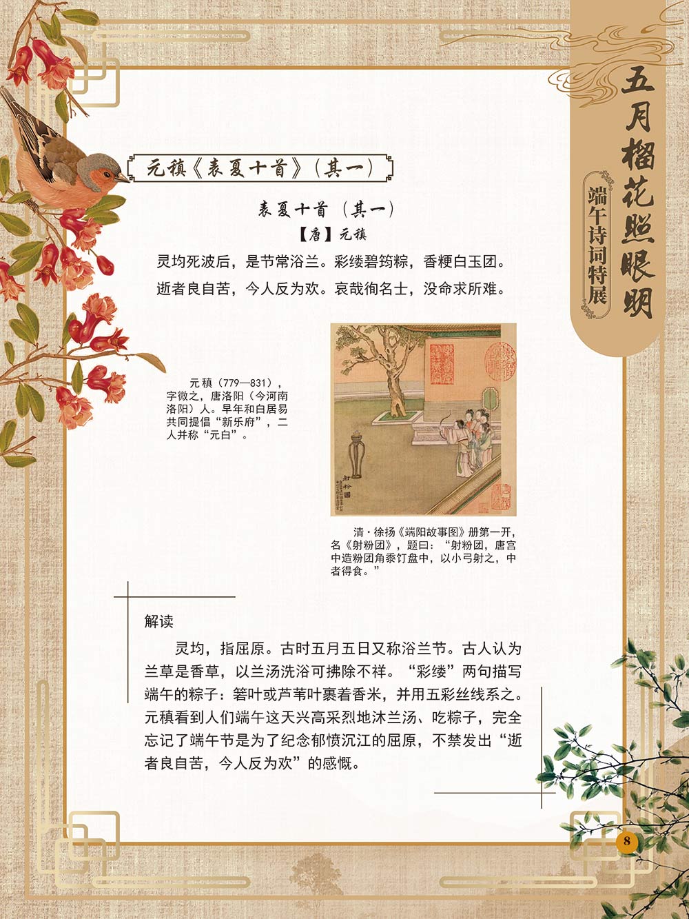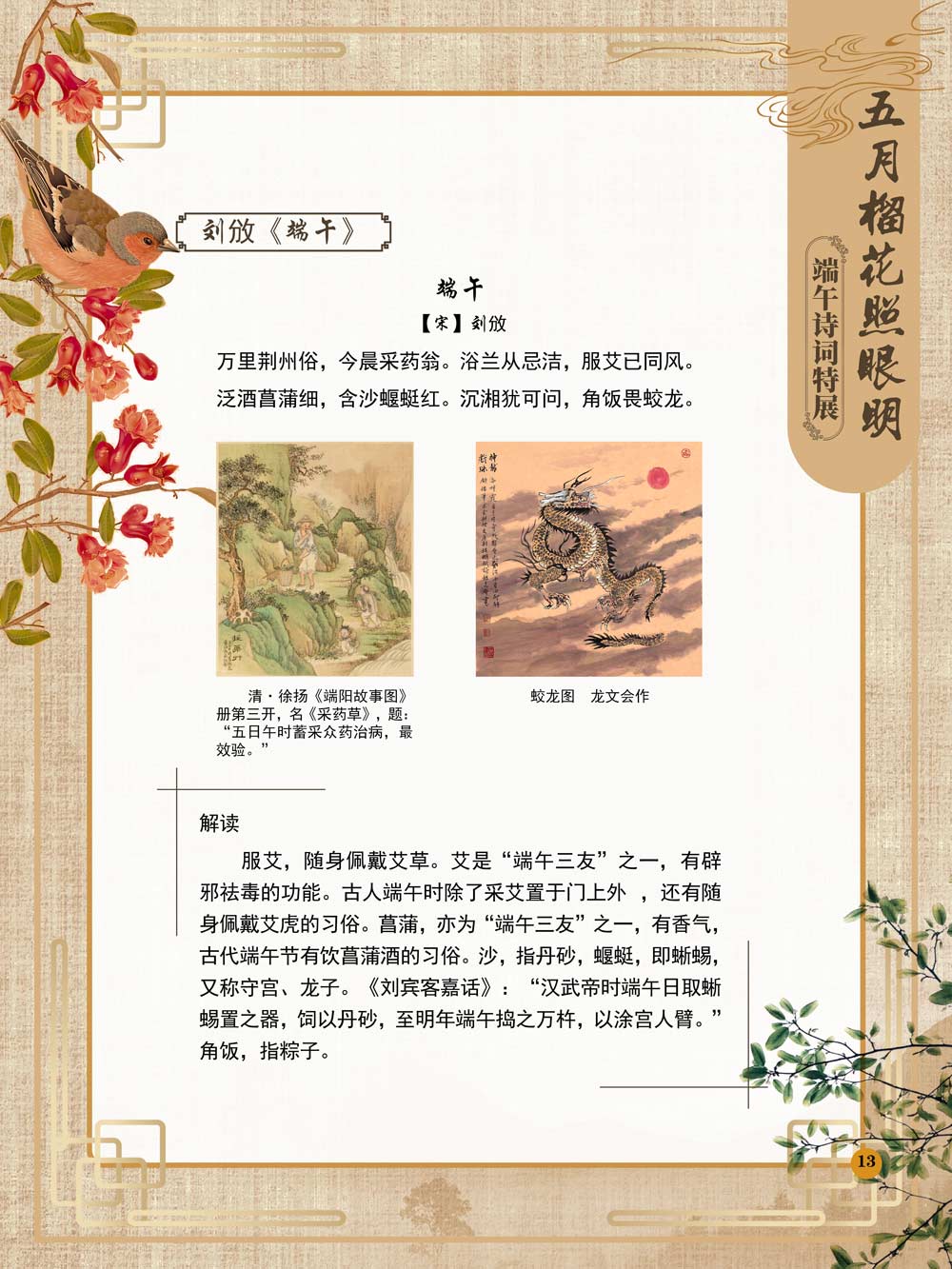每年农历五月初五是我国的传统节日端午节。“端午”的意思是农历五月的第一个五日,即“五月初五”。端午节又称端阳节、龙舟节、重午节、龙节、天中节等等,与春节、清明节、中秋节并称为中国四大传统节日。 有关端午节的民间风俗,历史上的记载很多。归纳起来,大致包括赛龙舟、吃粽子、饮雄黄酒、悬艾草、插菖蒲、采百药、挂钟馗像、佩香袋等内容。其中又以赛龙舟和吃粽子最具特色,流传也最广。 历代文人墨客关于端午节的诗词描写颇多,其中不仅有端午节俗,也有端阳的风物,所谓“四时佳兴与人同”,时令风物如榴花、蜀葵、菖蒲、枇杷等成为文人们在诗词中争相吟咏的意象。同时,诗人们也将感恩圣意、吊唁屈原、怀才不遇等感慨借由节日的氛围抒发出来,成为诗人一时心境的写照,充实了端午节的文化、历史内涵。本展览选取有代表性的端午诗词,通过对诗词的解读,向观众朋友们详细介绍端午节的文化和习俗,以便读者更好地感知我国文化传统,弘扬端午节文化。
