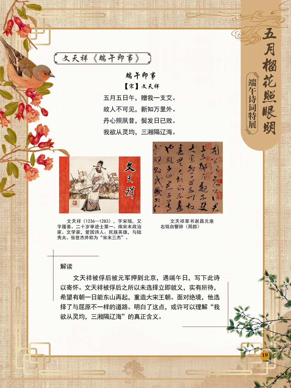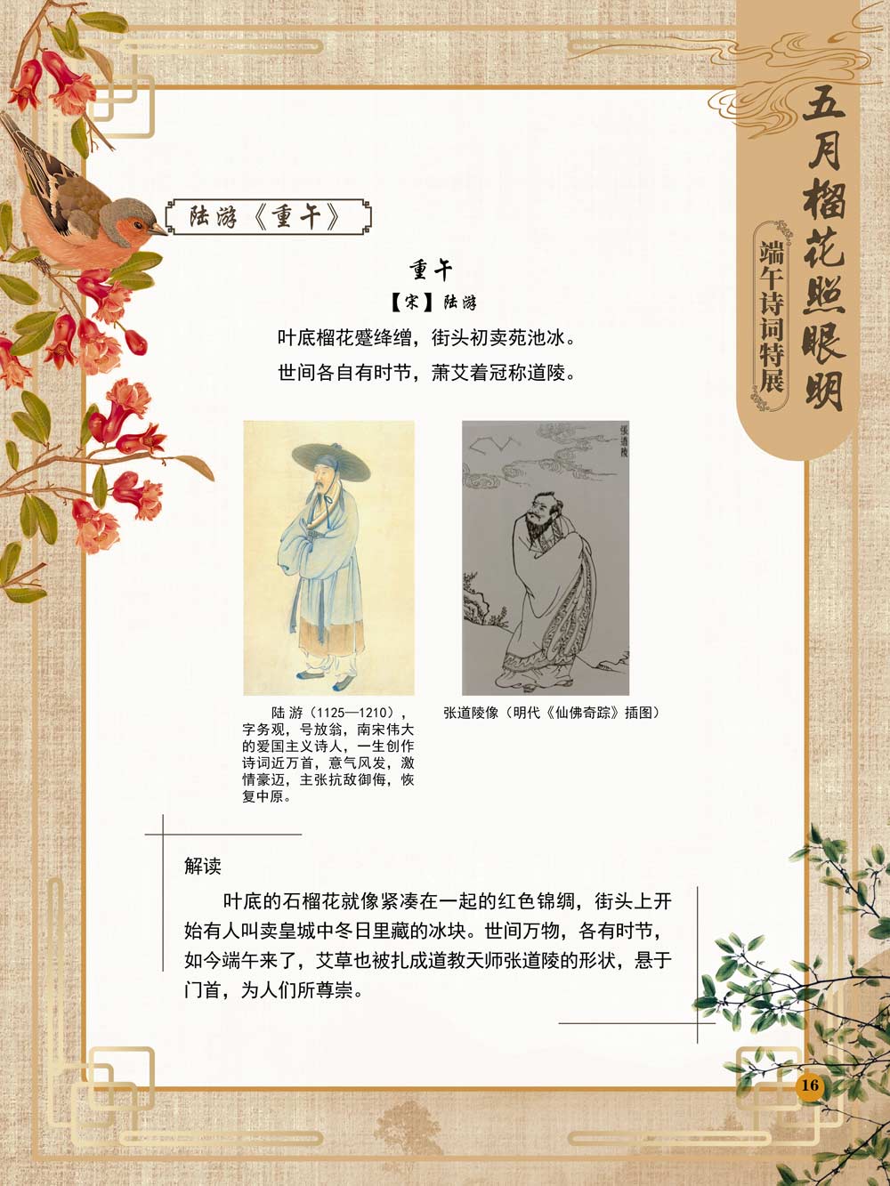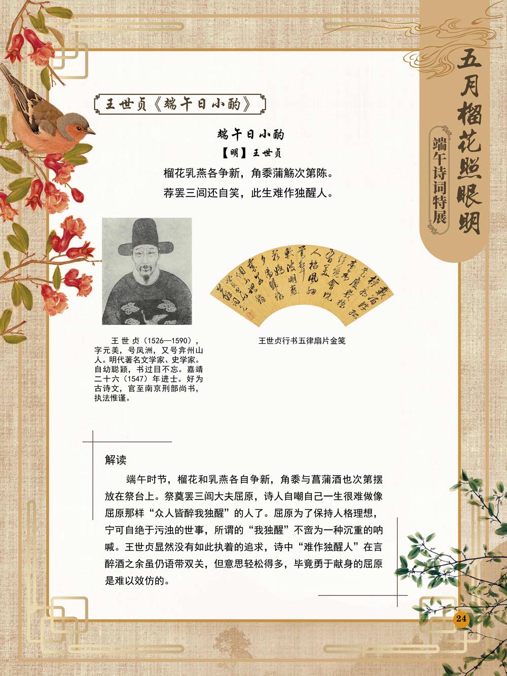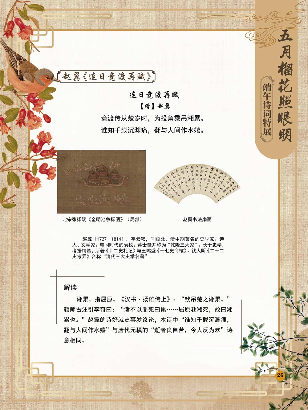每年农历五月初五是我国的传统节日端午节。“端午”的意思是农历五月的第一个五日,即“五月初五”。端午节又称端阳节、龙舟节、重午节、龙节、天中节等等,与春节、清明节、中秋节并称为中国四大传统节日。 有关端午节的民间风俗,历史上的记载很多。归纳起来,大致包括赛龙舟、吃粽子、饮雄黄酒、悬艾草、插菖蒲、采百药、挂钟馗像、佩香袋等内容。其中又以赛龙舟和吃粽子最具特色,流传也最广。 历代文人墨客关于端午节的诗词描写颇多,其中不仅有端午节俗,也有端阳的风物,所谓“四时佳兴与人同”,时令风物如榴花、蜀葵、菖蒲、枇杷等成为文人们在诗词中争相吟咏的意象。同时,诗人们也将感恩圣意、吊唁屈原、怀才不遇等感慨借由节日的氛围抒发出来,成为诗人一时心境的写照,充实了端午节的文化、历史内涵。本展览选取有代表性的端午诗词,通过对诗词的解读,向观众朋友们详细介绍端午节的文化和习俗,以便读者更好地感知我国文化传统,弘扬端午节文化。