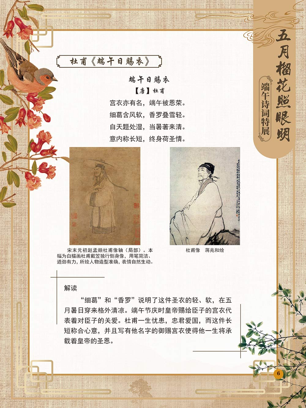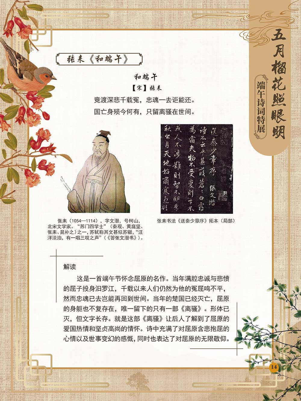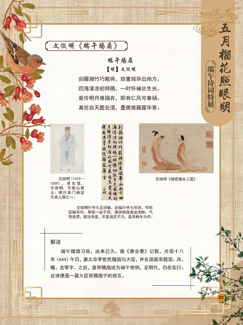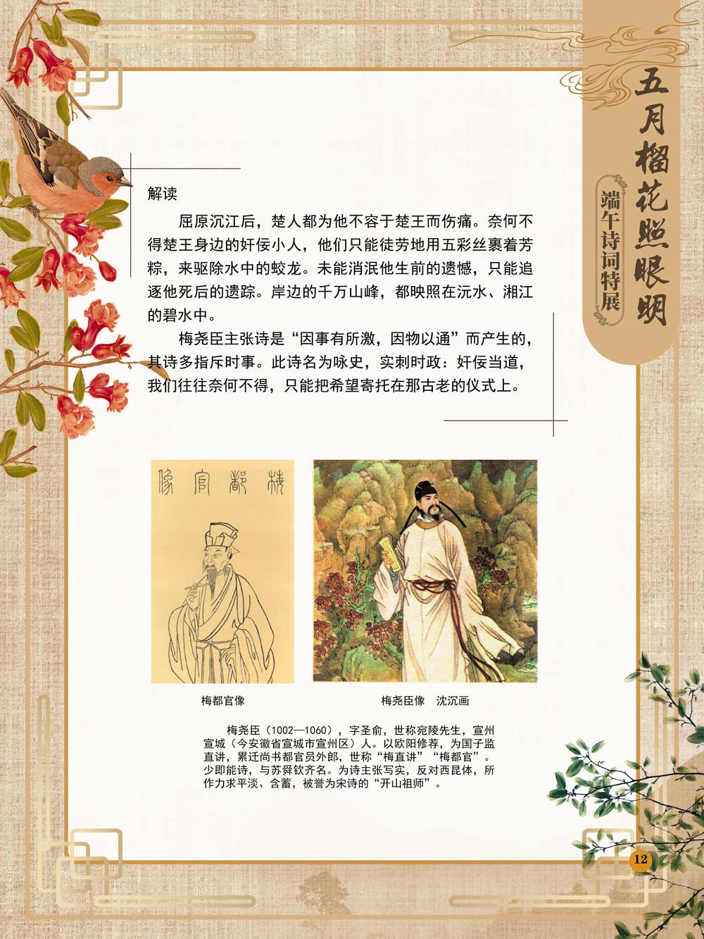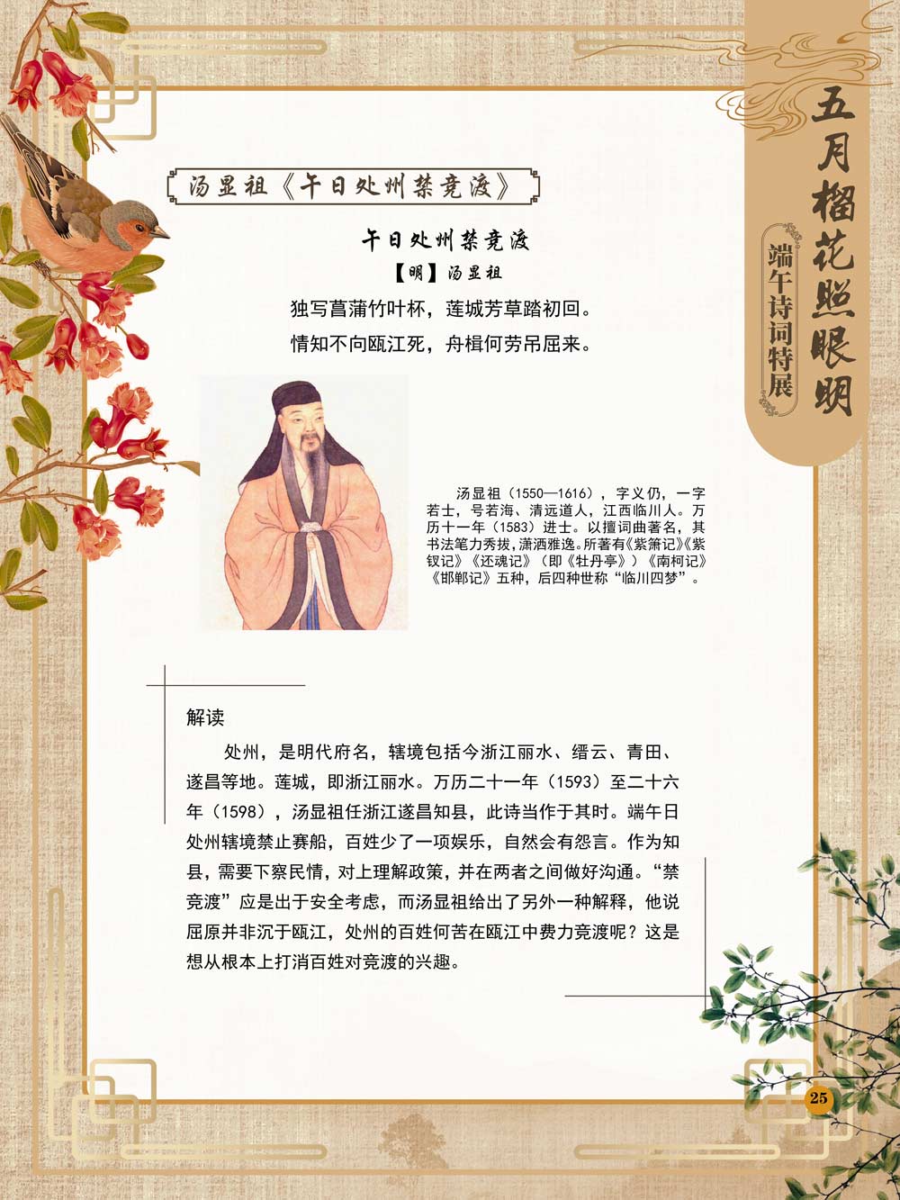 每年农历五月初五是我国的传统节日端午节。“端午”的意思是农历五月的第一个五日,即“五月初五”。端午节又称端阳节、龙舟节、重午节、龙节、天中节等等,与春节、清明节、中秋节并称为中国四大传统节日。 有关端午节的民间风俗,历史上的记载很多。归纳起来,大致包括赛龙舟、吃粽子、饮雄黄酒、悬艾草、插菖蒲、采百药、挂钟馗像、佩香袋等内容。其中又以赛龙舟和吃粽子最具特色,流传也最广。 历代文人墨客关于端午节的诗词描写颇多,其中不仅有端午节俗,也有端阳的风物,所谓“四时佳兴与人同”,时令风物如榴花、蜀葵、菖蒲、枇杷等成为文人们在诗词中争相吟咏的意象。同时,诗人们也将感恩圣意、吊唁屈原、怀才不遇等感慨借由节日的氛围抒发出来,成为诗人一时心境的写照,充实了端午节的文化、历史内涵。本展览选取有代表性的端午诗词,通过对诗词的解读,向观众朋友们详细介绍端午节的文化和习俗,以便读者更好地感知我国文化传统,弘扬端午节文化。