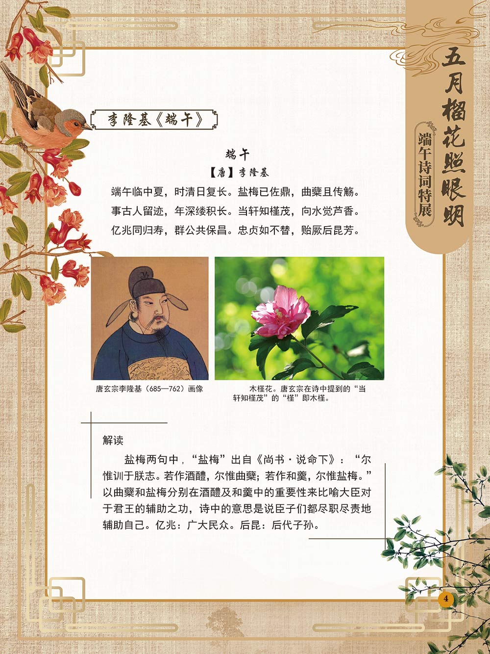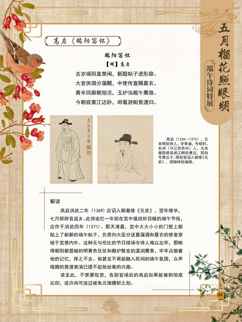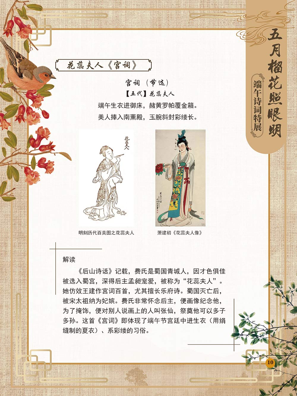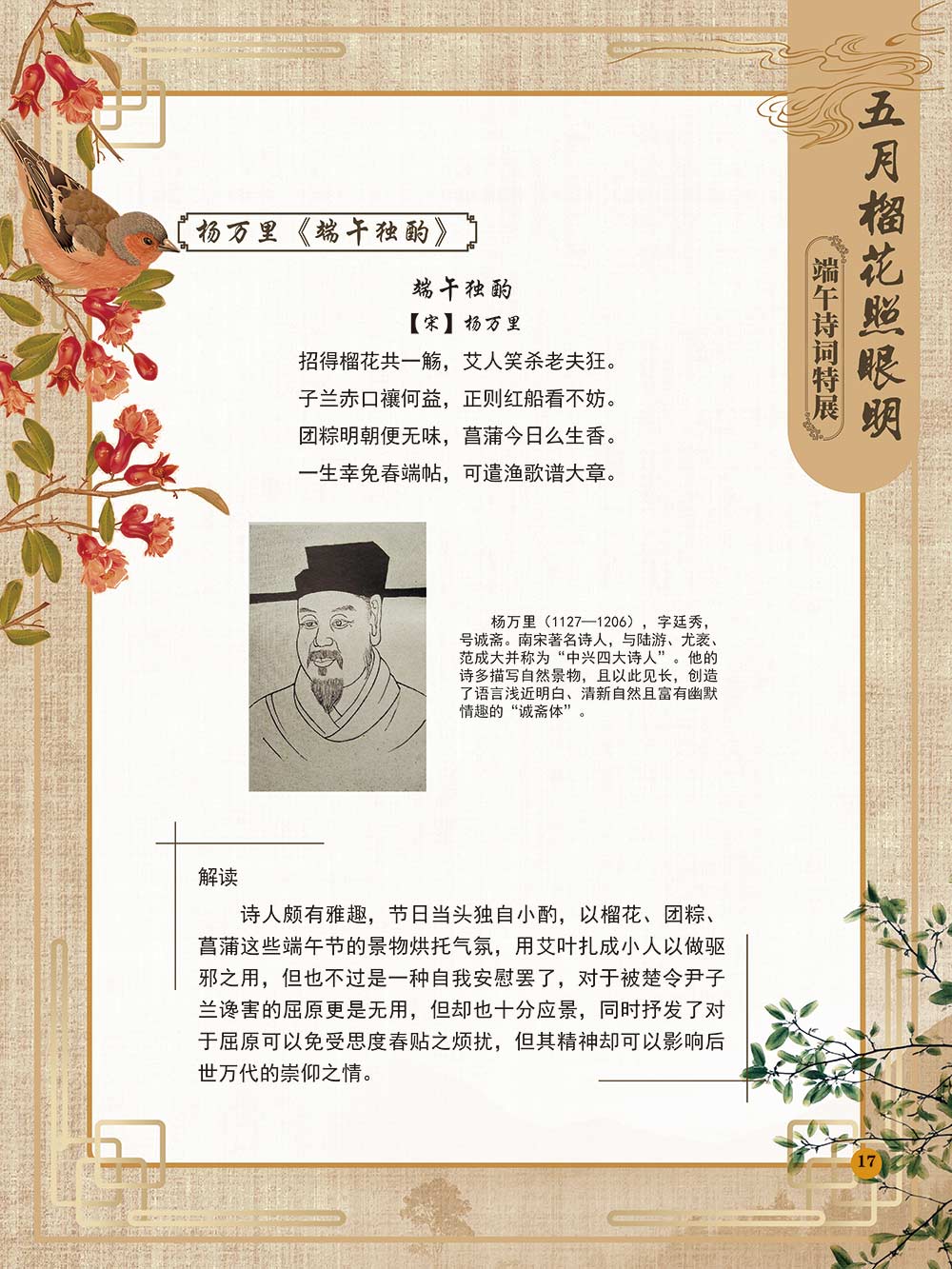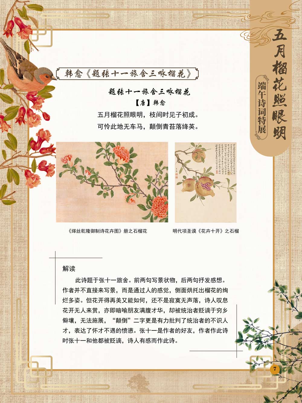 每年农历五月初五是我国的传统节日端午节。“端午”的意思是农历五月的第一个五日,即“五月初五”。端午节又称端阳节、龙舟节、重午节、龙节、天中节等等,与春节、清明节、中秋节并称为中国四大传统节日。 有关端午节的民间风俗,历史上的记载很多。归纳起来,大致包括赛龙舟、吃粽子、饮雄黄酒、悬艾草、插菖蒲、采百药、挂钟馗像、佩香袋等内容。其中又以赛龙舟和吃粽子最具特色,流传也最广。 历代文人墨客关于端午节的诗词描写颇多,其中不仅有端午节俗,也有端阳的风物,所谓“四时佳兴与人同”,时令风物如榴花、蜀葵、菖蒲、枇杷等成为文人们在诗词中争相吟咏的意象。同时,诗人们也将感恩圣意、吊唁屈原、怀才不遇等感慨借由节日的氛围抒发出来,成为诗人一时心境的写照,充实了端午节的文化、历史内涵。本展览选取有代表性的端午诗词,通过对诗词的解读,向观众朋友们详细介绍端午节的文化和习俗,以便读者更好地感知我国文化传统,弘扬端午节文化。