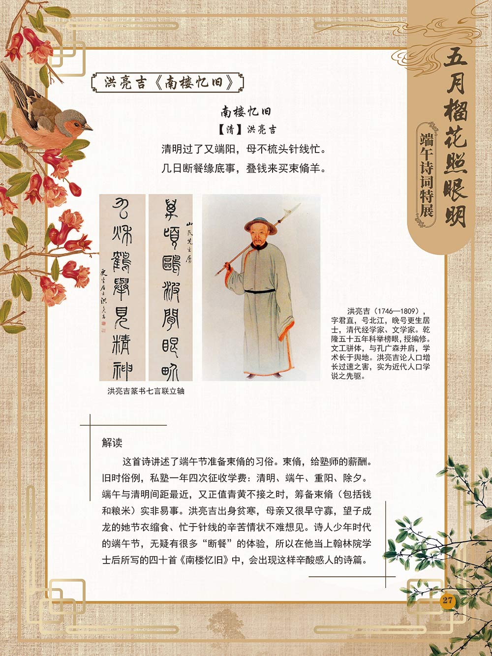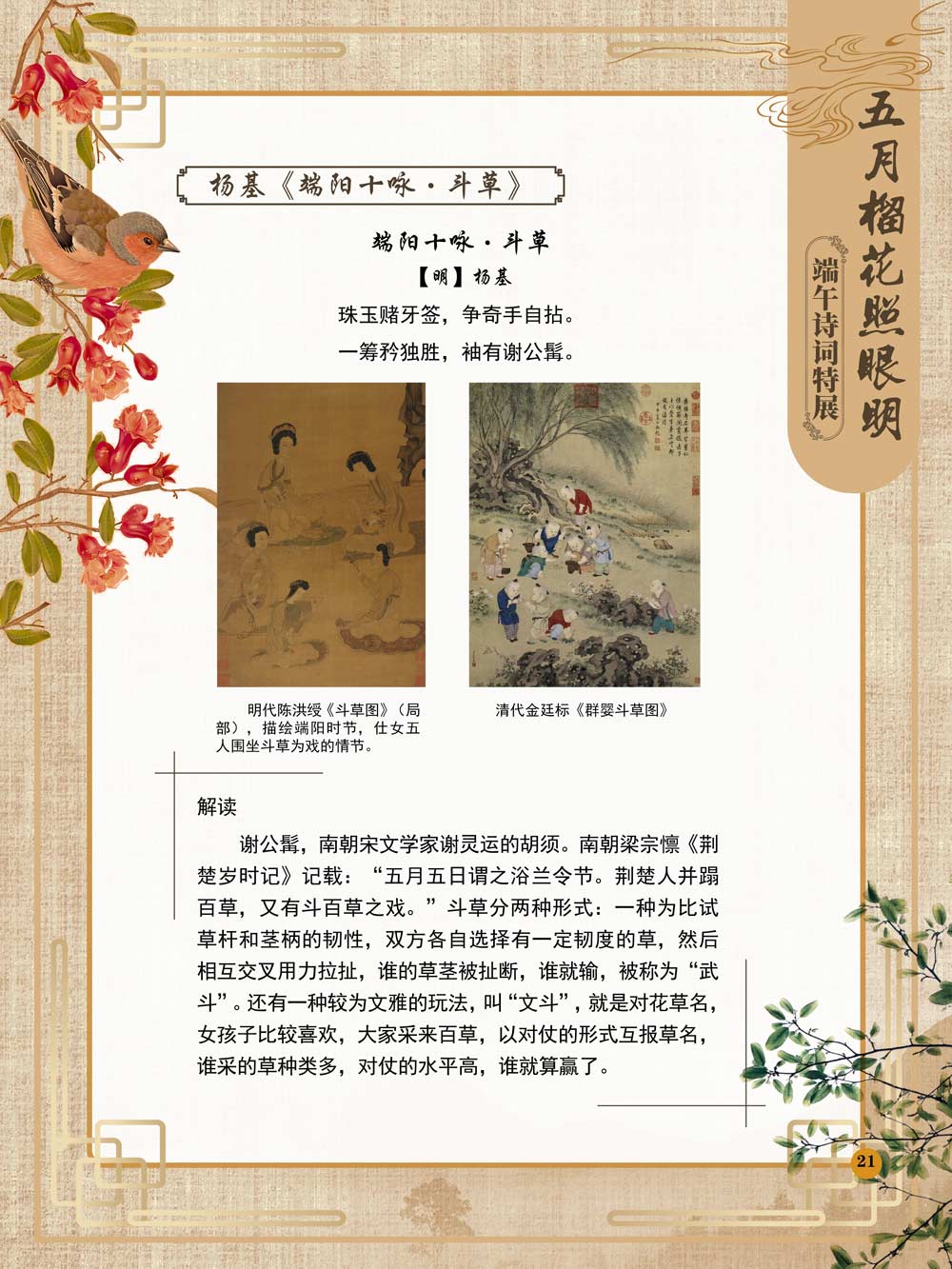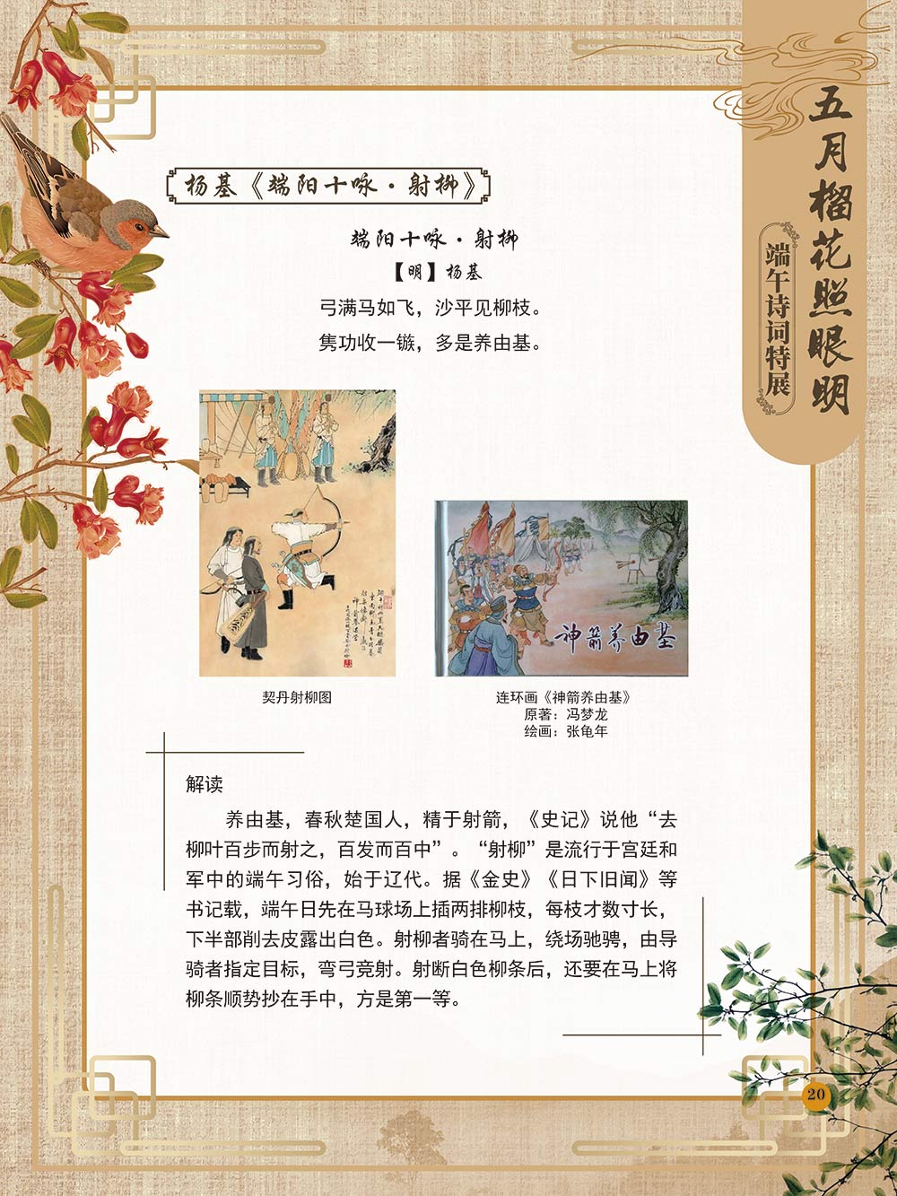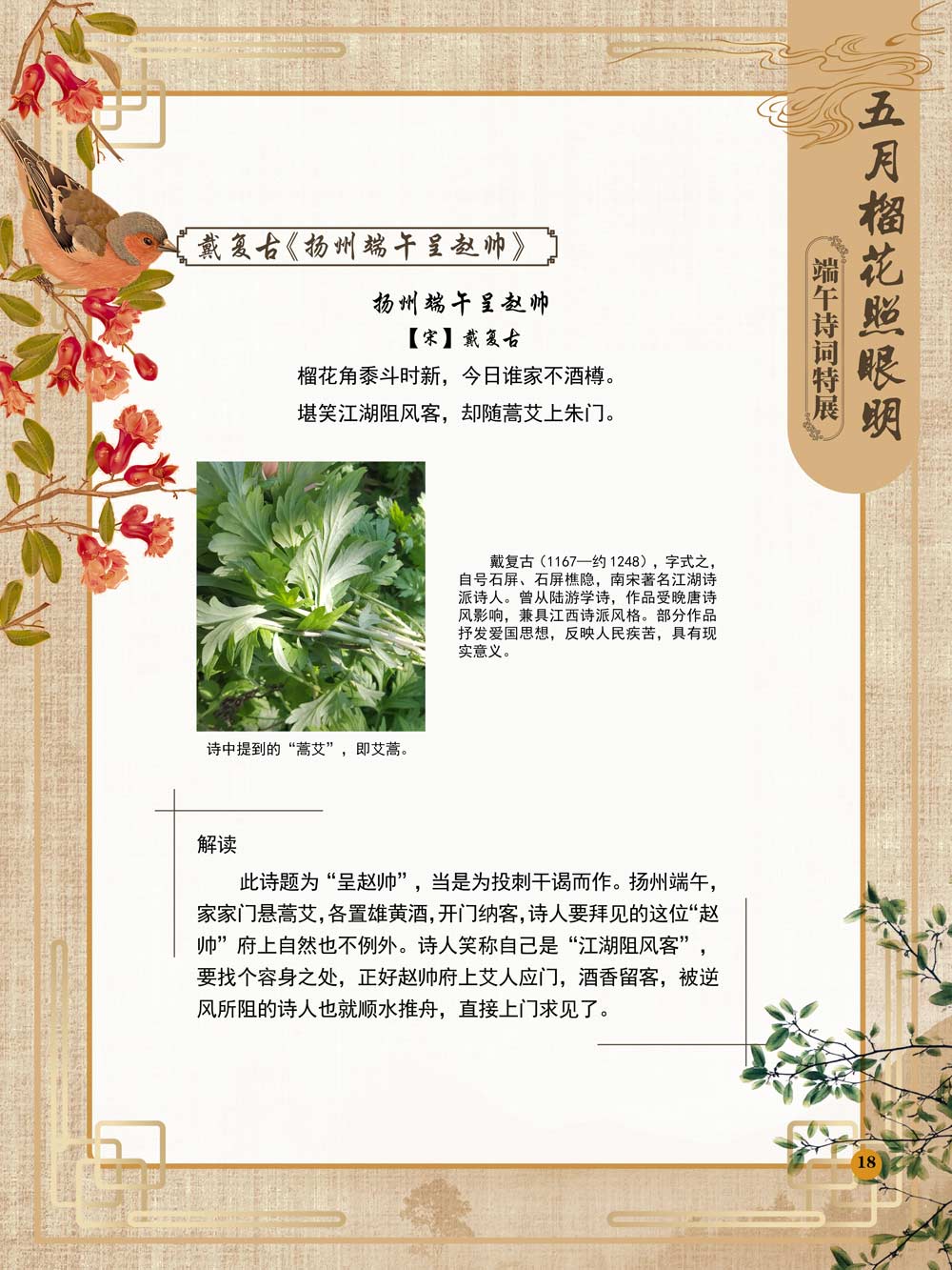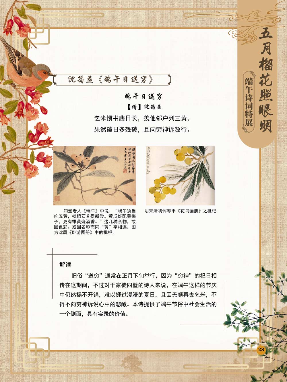 每年农历五月初五是我国的传统节日端午节。“端午”的意思是农历五月的第一个五日,即“五月初五”。端午节又称端阳节、龙舟节、重午节、龙节、天中节等等,与春节、清明节、中秋节并称为中国四大传统节日。 有关端午节的民间风俗,历史上的记载很多。归纳起来,大致包括赛龙舟、吃粽子、饮雄黄酒、悬艾草、插菖蒲、采百药、挂钟馗像、佩香袋等内容。其中又以赛龙舟和吃粽子最具特色,流传也最广。 历代文人墨客关于端午节的诗词描写颇多,其中不仅有端午节俗,也有端阳的风物,所谓“四时佳兴与人同”,时令风物如榴花、蜀葵、菖蒲、枇杷等成为文人们在诗词中争相吟咏的意象。同时,诗人们也将感恩圣意、吊唁屈原、怀才不遇等感慨借由节日的氛围抒发出来,成为诗人一时心境的写照,充实了端午节的文化、历史内涵。本展览选取有代表性的端午诗词,通过对诗词的解读,向观众朋友们详细介绍端午节的文化和习俗,以便读者更好地感知我国文化传统,弘扬端午节文化。