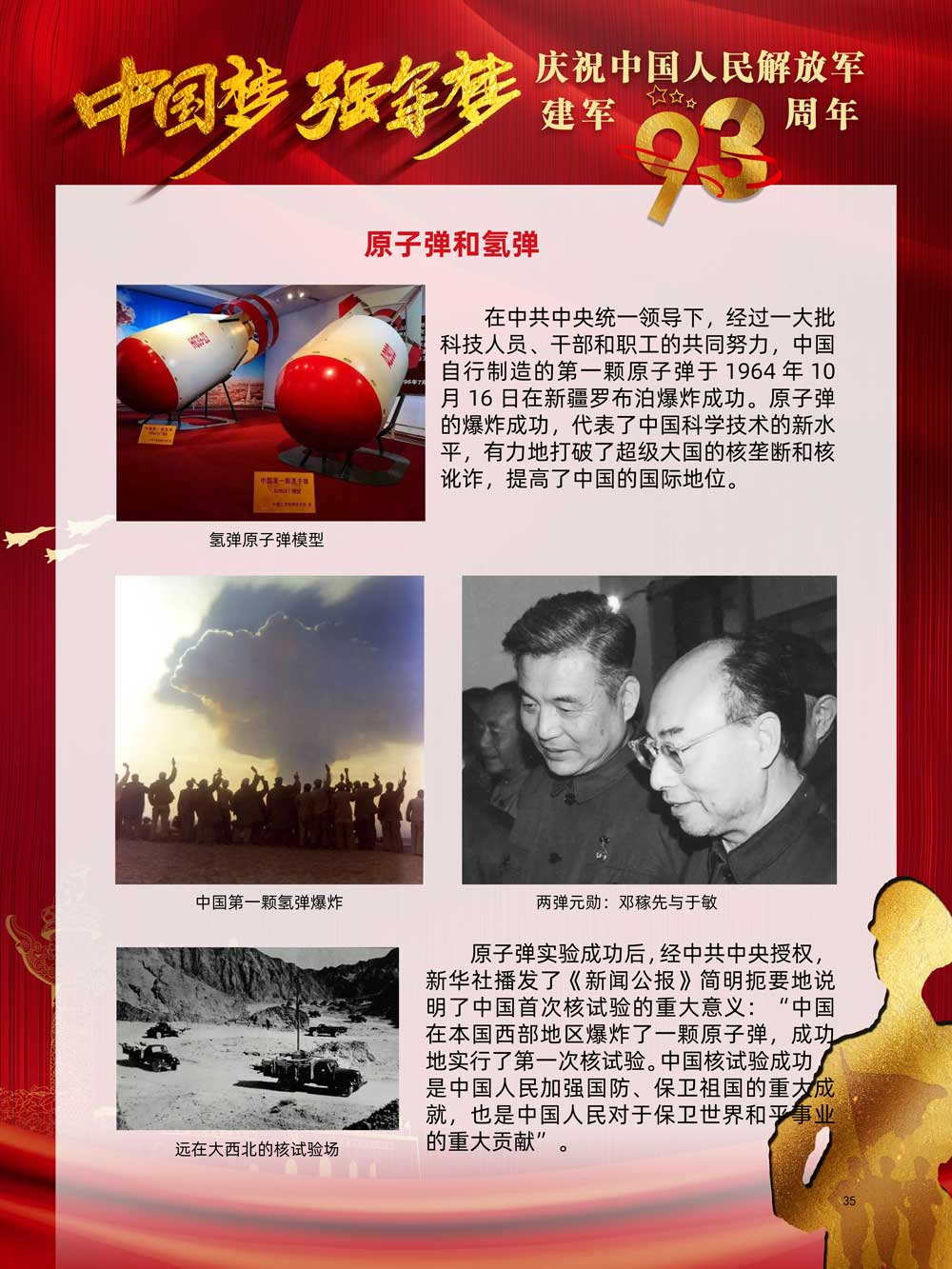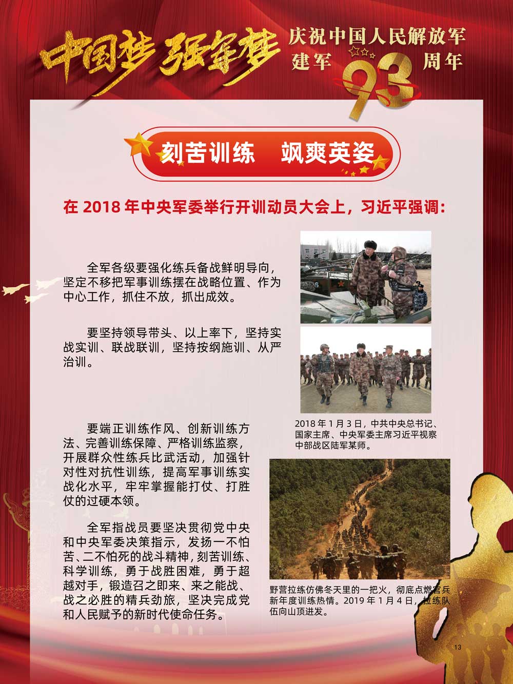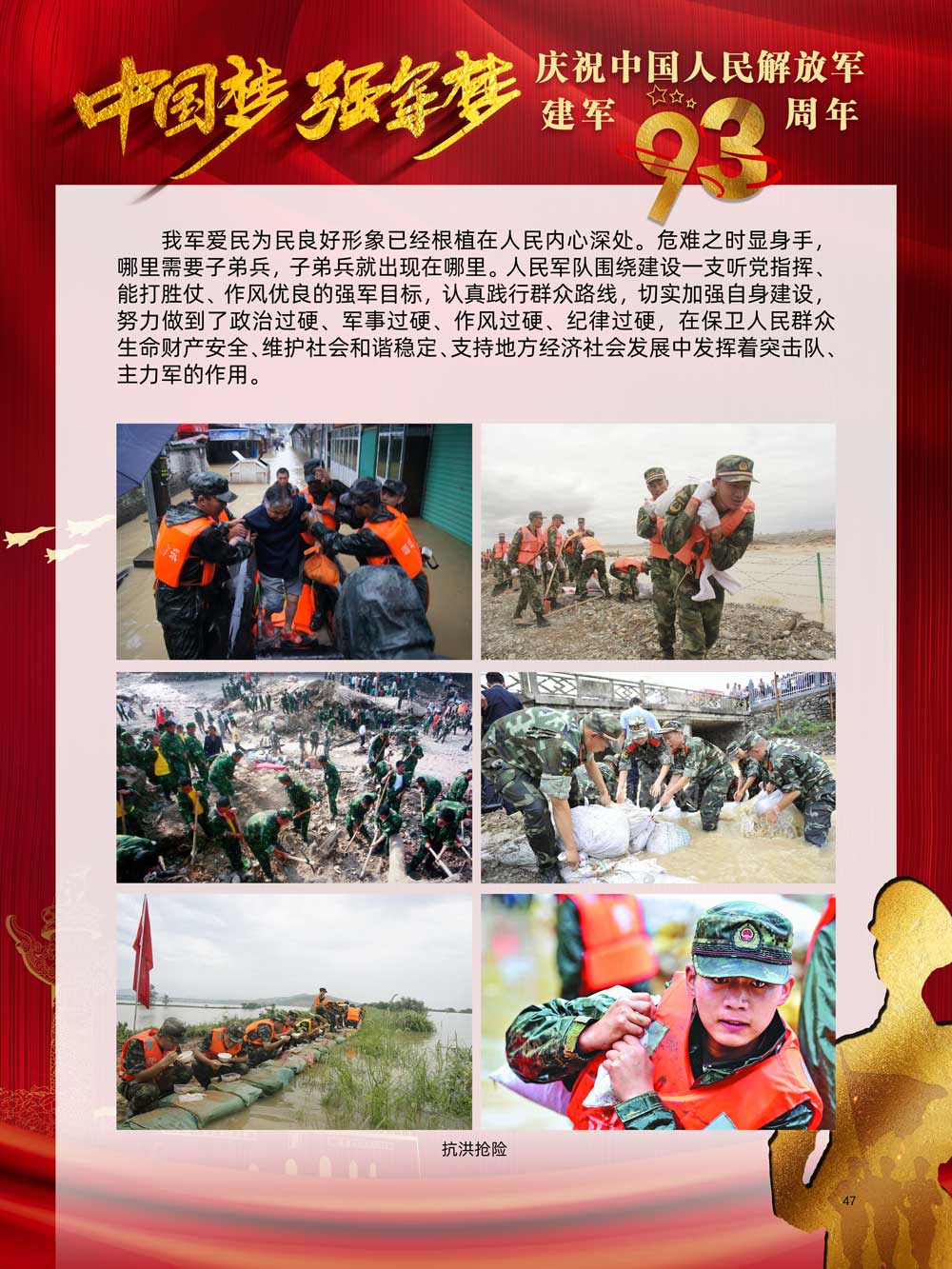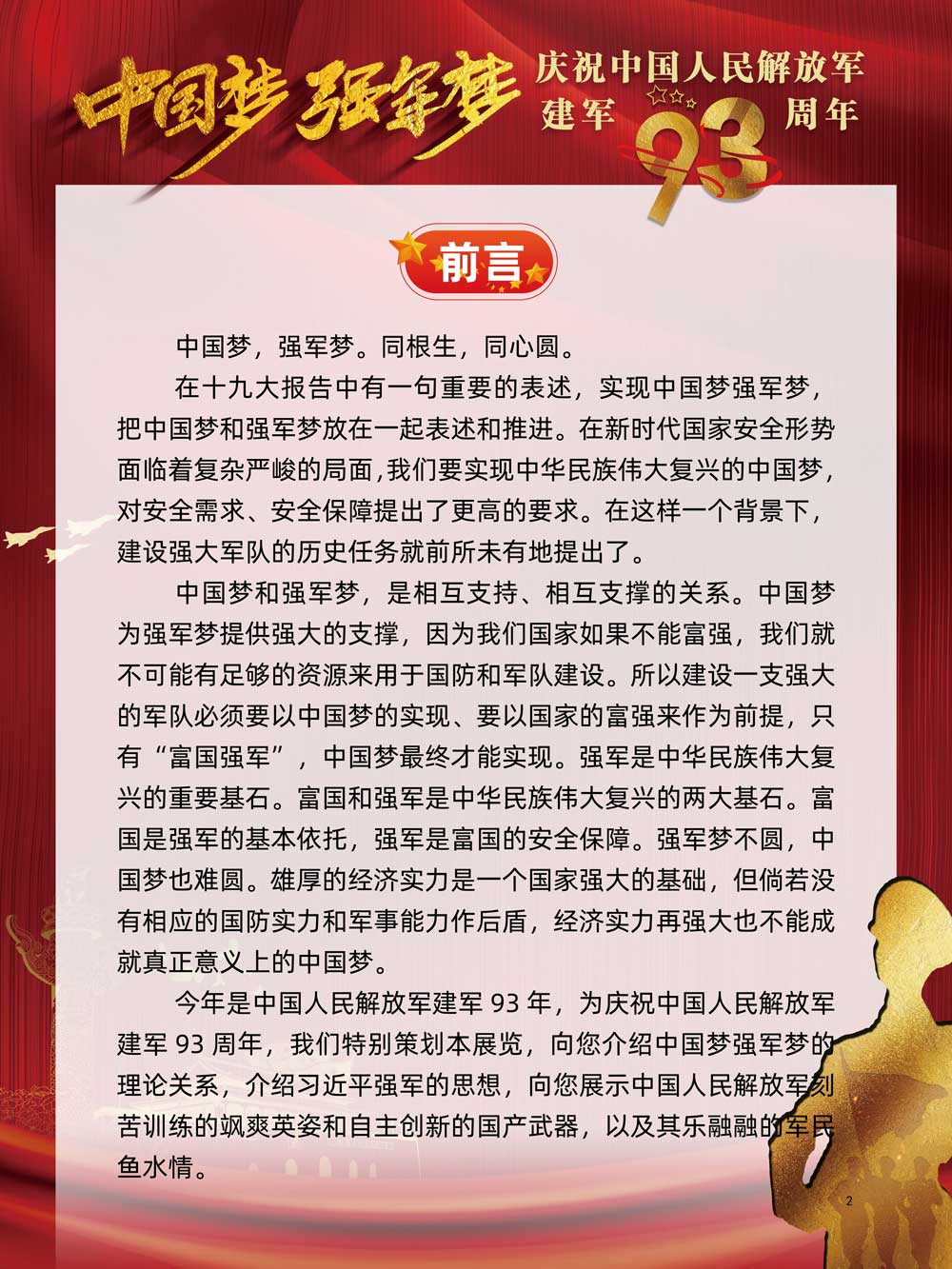 中国梦,强军梦。同根生,同心圆。 在十九大报告中有一句重要的表述,实现中国梦强军梦,把中国梦和强军梦放在一起表述和推进。在新时代国家安全形势面临着复杂严峻的局面,我们要实现中华民族伟大复兴的中国梦,对安全需求、安全保障提出了更高的要求。在这样一个背景下,建设强大军队的历史任务就前所未有地提出了。 中国梦和强军梦,是相互支持、相互支撑的关系。中国梦为强军梦提供强大的支撑,因为我们国家如果不能富强,我们就不可能有足够的资源来用于国防和军队建设。所以建设一支强大的军队必须要以中国梦的实现、要以国家的富强来作为前提,只有“富国强军”,中国梦最终才能实现。强军是中华民族伟大复兴的重要基石。富国和强军是中华民族伟大复兴的两大基石。富国是强军的基本依托,强军是富国的安全保障。强军梦不圆,中国梦也难圆。雄厚的经济实力是一个国家强大的基础,但倘若没有相应的国防实力和军事能力作后盾,经济实力再强大也不能成就真正意义上的中国梦。 今年是中国人民解放军建军93年,为庆祝中国人民解放军建军93周年,我们特别策划本展览,向您介绍中国梦强军梦的理论关系,介绍习近平强军的思想,向您展示中国人民解放军刻苦训练的飒爽英姿和自主创新的国产武器,以及其乐融融的军民鱼水情。