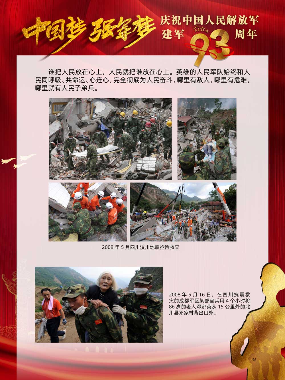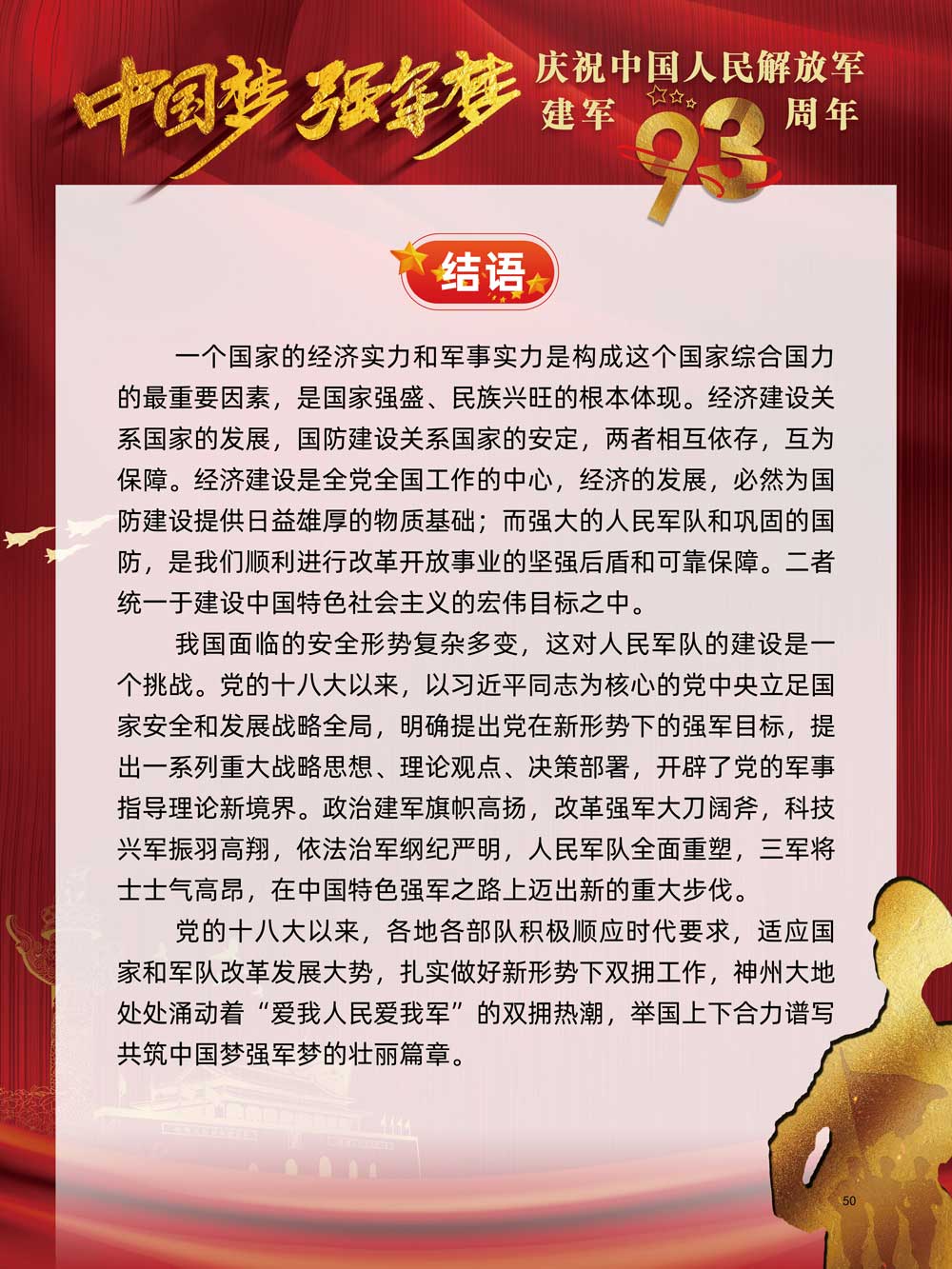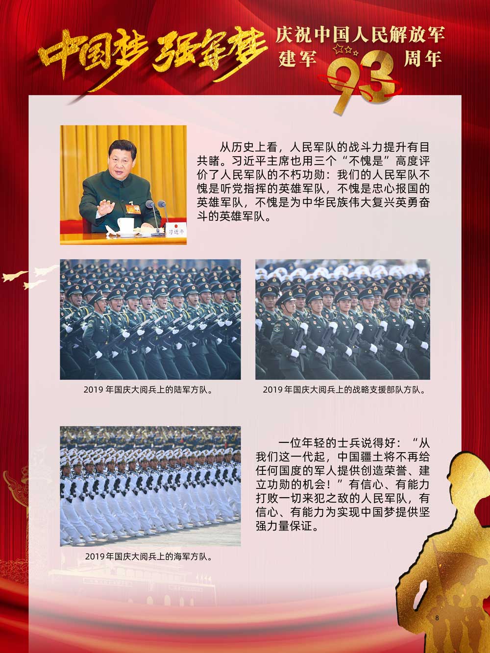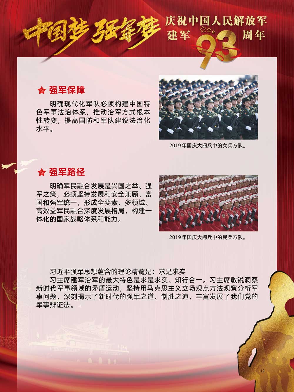 中国梦,强军梦。同根生,同心圆。 在十九大报告中有一句重要的表述,实现中国梦强军梦,把中国梦和强军梦放在一起表述和推进。在新时代国家安全形势面临着复杂严峻的局面,我们要实现中华民族伟大复兴的中国梦,对安全需求、安全保障提出了更高的要求。在这样一个背景下,建设强大军队的历史任务就前所未有地提出了。 中国梦和强军梦,是相互支持、相互支撑的关系。中国梦为强军梦提供强大的支撑,因为我们国家如果不能富强,我们就不可能有足够的资源来用于国防和军队建设。所以建设一支强大的军队必须要以中国梦的实现、要以国家的富强来作为前提,只有“富国强军”,中国梦最终才能实现。强军是中华民族伟大复兴的重要基石。富国和强军是中华民族伟大复兴的两大基石。富国是强军的基本依托,强军是富国的安全保障。强军梦不圆,中国梦也难圆。雄厚的经济实力是一个国家强大的基础,但倘若没有相应的国防实力和军事能力作后盾,经济实力再强大也不能成就真正意义上的中国梦。 今年是中国人民解放军建军93年,为庆祝中国人民解放军建军93周年,我们特别策划本展览,向您介绍中国梦强军梦的理论关系,介绍习近平强军的思想,向您展示中国人民解放军刻苦训练的飒爽英姿和自主创新的国产武器,以及其乐融融的军民鱼水情。