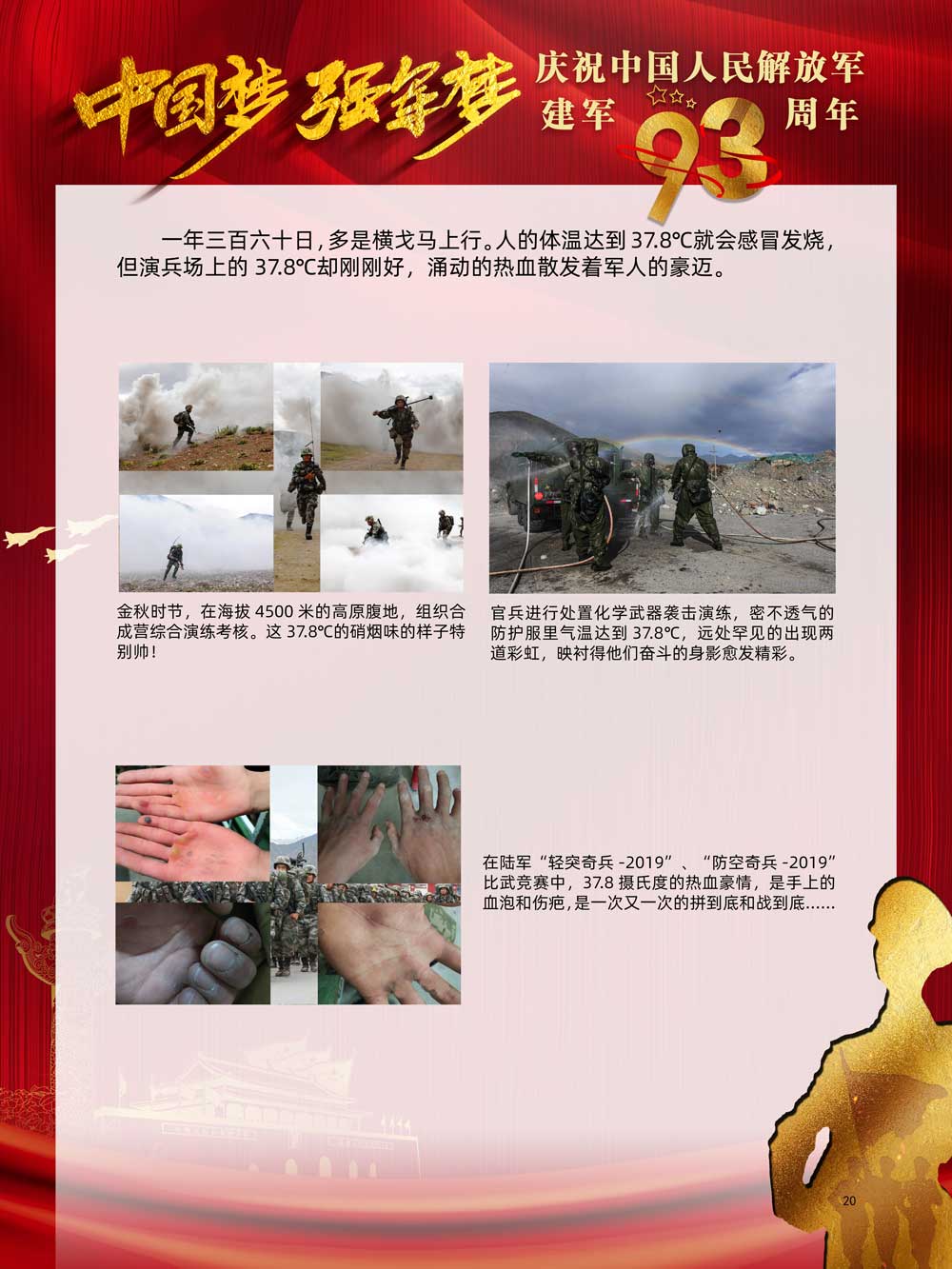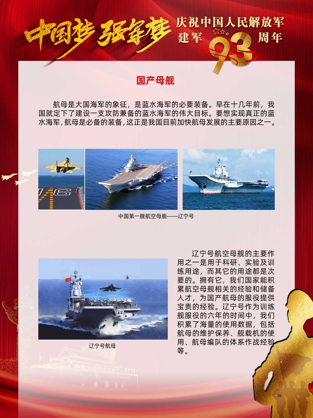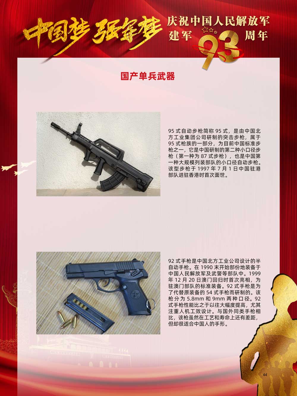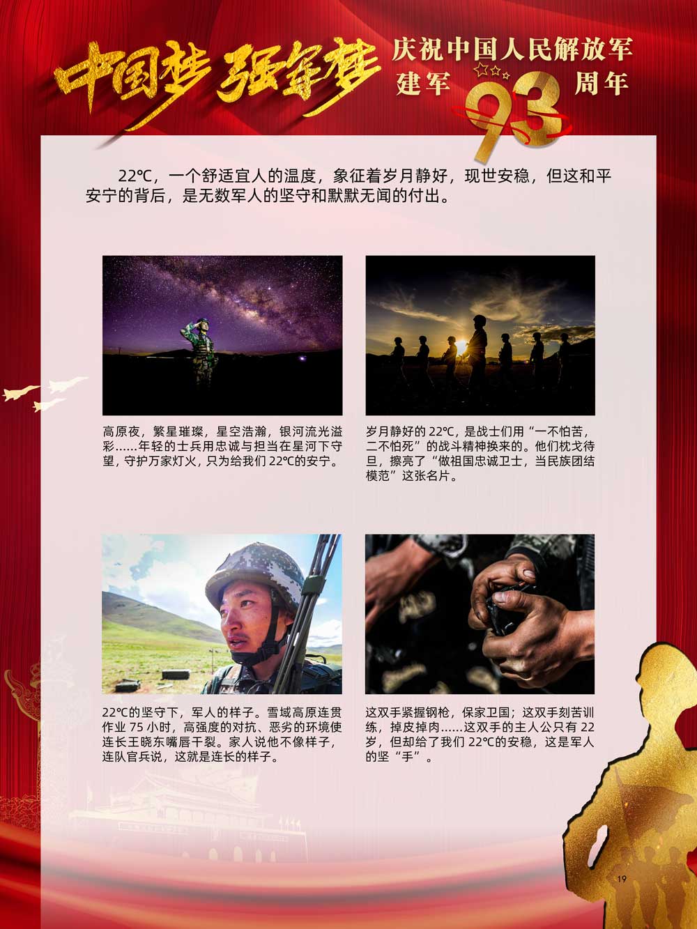 中国梦,强军梦。同根生,同心圆。 在十九大报告中有一句重要的表述,实现中国梦强军梦,把中国梦和强军梦放在一起表述和推进。在新时代国家安全形势面临着复杂严峻的局面,我们要实现中华民族伟大复兴的中国梦,对安全需求、安全保障提出了更高的要求。在这样一个背景下,建设强大军队的历史任务就前所未有地提出了。 中国梦和强军梦,是相互支持、相互支撑的关系。中国梦为强军梦提供强大的支撑,因为我们国家如果不能富强,我们就不可能有足够的资源来用于国防和军队建设。所以建设一支强大的军队必须要以中国梦的实现、要以国家的富强来作为前提,只有“富国强军”,中国梦最终才能实现。强军是中华民族伟大复兴的重要基石。富国和强军是中华民族伟大复兴的两大基石。富国是强军的基本依托,强军是富国的安全保障。强军梦不圆,中国梦也难圆。雄厚的经济实力是一个国家强大的基础,但倘若没有相应的国防实力和军事能力作后盾,经济实力再强大也不能成就真正意义上的中国梦。 今年是中国人民解放军建军93年,为庆祝中国人民解放军建军93周年,我们特别策划本展览,向您介绍中国梦强军梦的理论关系,介绍习近平强军的思想,向您展示中国人民解放军刻苦训练的飒爽英姿和自主创新的国产武器,以及其乐融融的军民鱼水情。