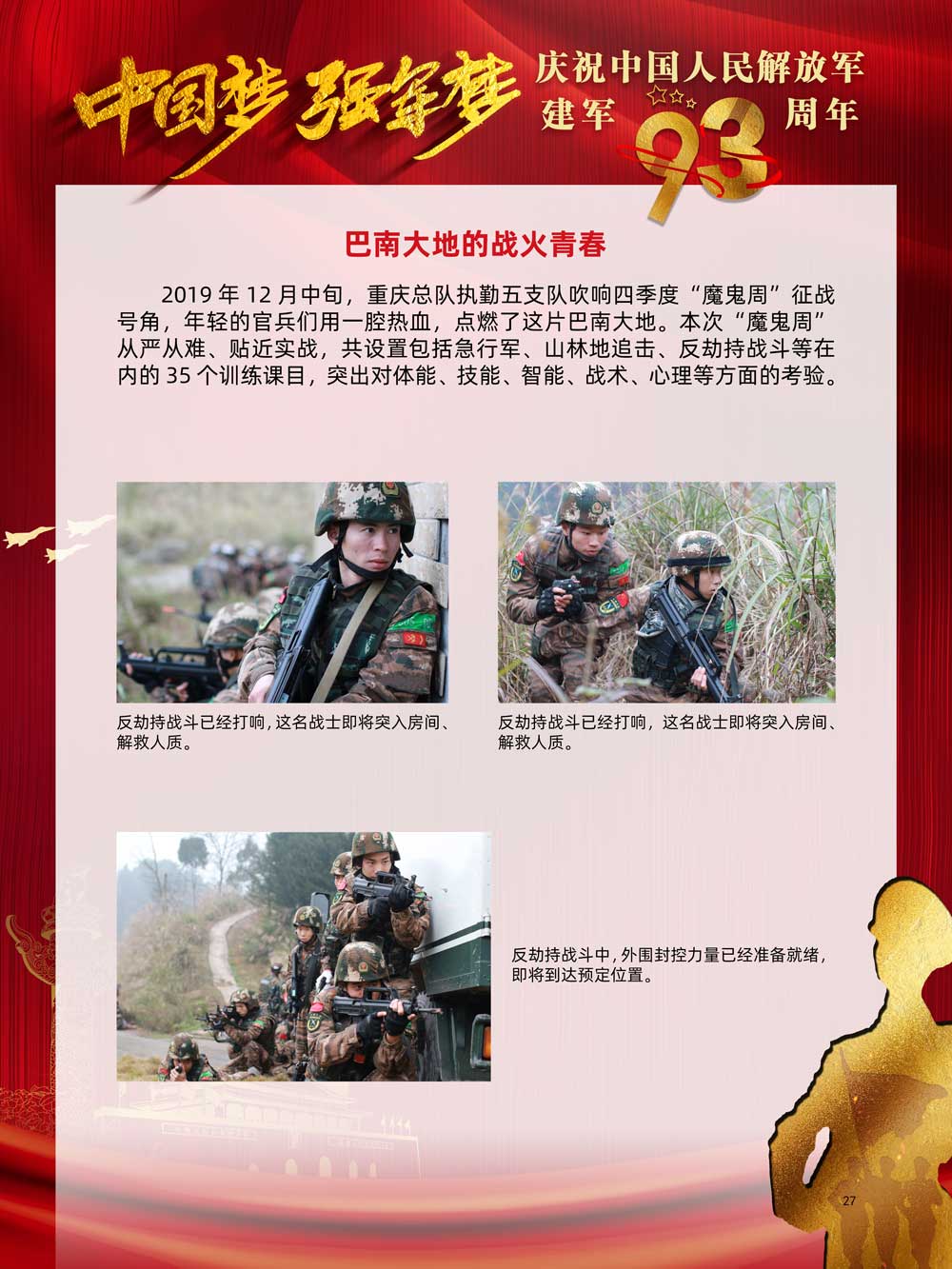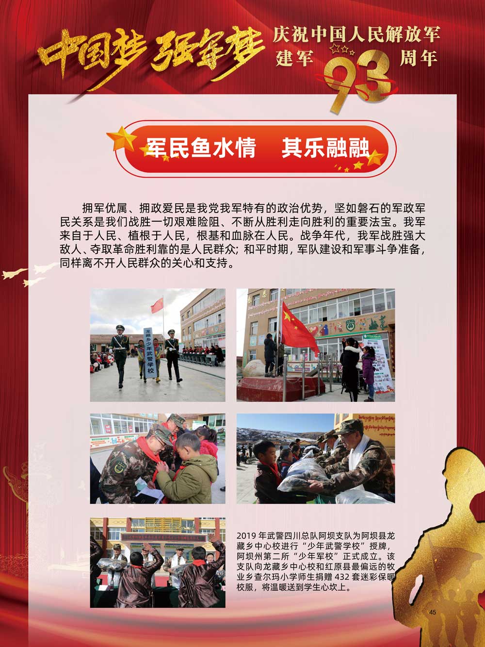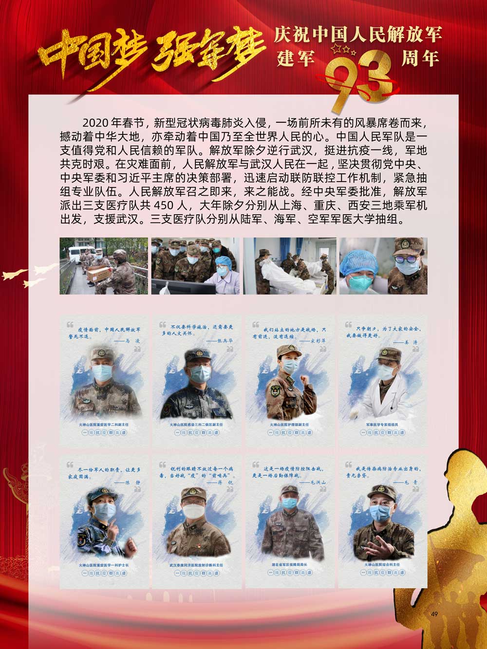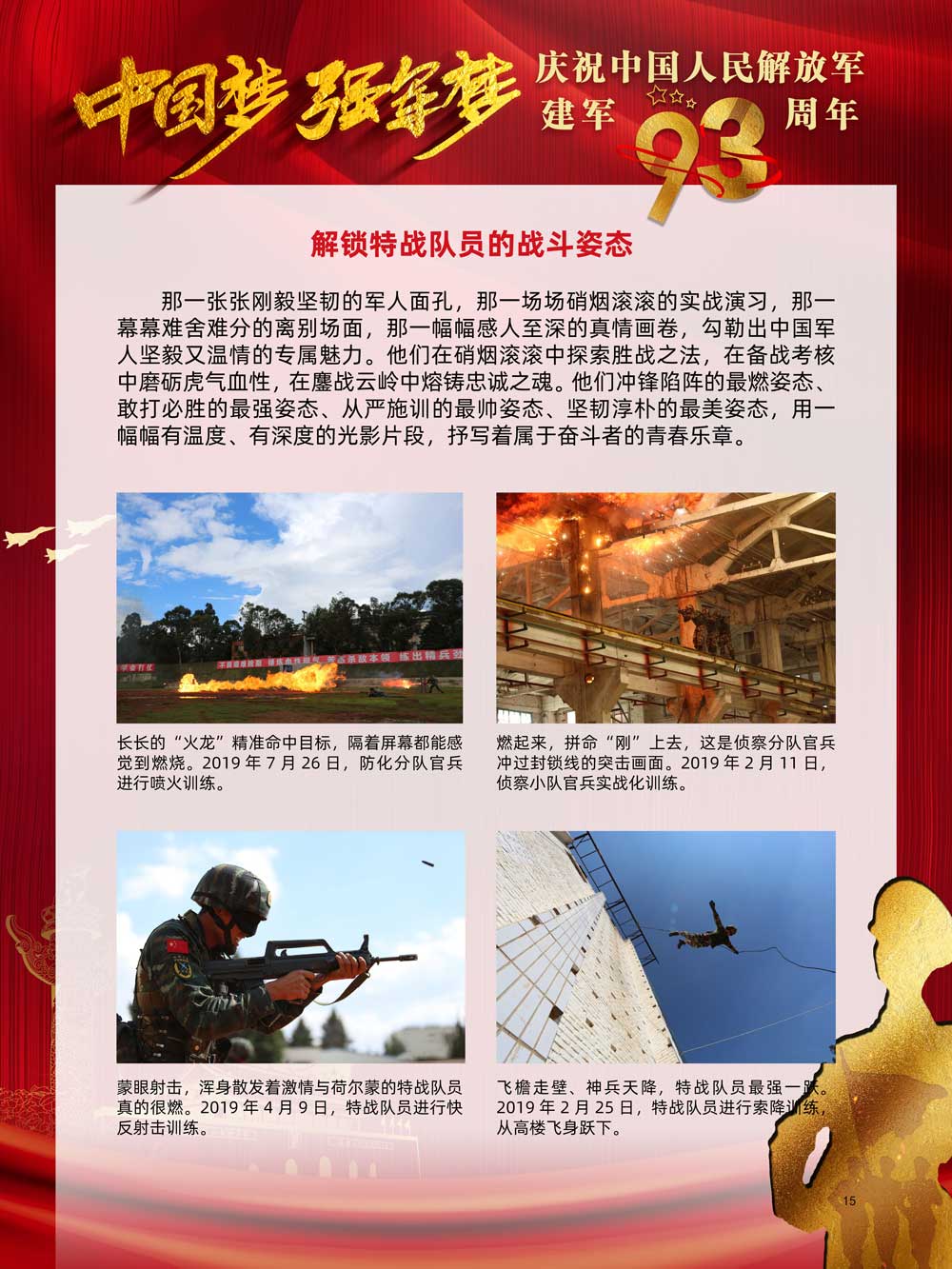 中国梦,强军梦。同根生,同心圆。 在十九大报告中有一句重要的表述,实现中国梦强军梦,把中国梦和强军梦放在一起表述和推进。在新时代国家安全形势面临着复杂严峻的局面,我们要实现中华民族伟大复兴的中国梦,对安全需求、安全保障提出了更高的要求。在这样一个背景下,建设强大军队的历史任务就前所未有地提出了。 中国梦和强军梦,是相互支持、相互支撑的关系。中国梦为强军梦提供强大的支撑,因为我们国家如果不能富强,我们就不可能有足够的资源来用于国防和军队建设。所以建设一支强大的军队必须要以中国梦的实现、要以国家的富强来作为前提,只有“富国强军”,中国梦最终才能实现。强军是中华民族伟大复兴的重要基石。富国和强军是中华民族伟大复兴的两大基石。富国是强军的基本依托,强军是富国的安全保障。强军梦不圆,中国梦也难圆。雄厚的经济实力是一个国家强大的基础,但倘若没有相应的国防实力和军事能力作后盾,经济实力再强大也不能成就真正意义上的中国梦。 今年是中国人民解放军建军93年,为庆祝中国人民解放军建军93周年,我们特别策划本展览,向您介绍中国梦强军梦的理论关系,介绍习近平强军的思想,向您展示中国人民解放军刻苦训练的飒爽英姿和自主创新的国产武器,以及其乐融融的军民鱼水情。