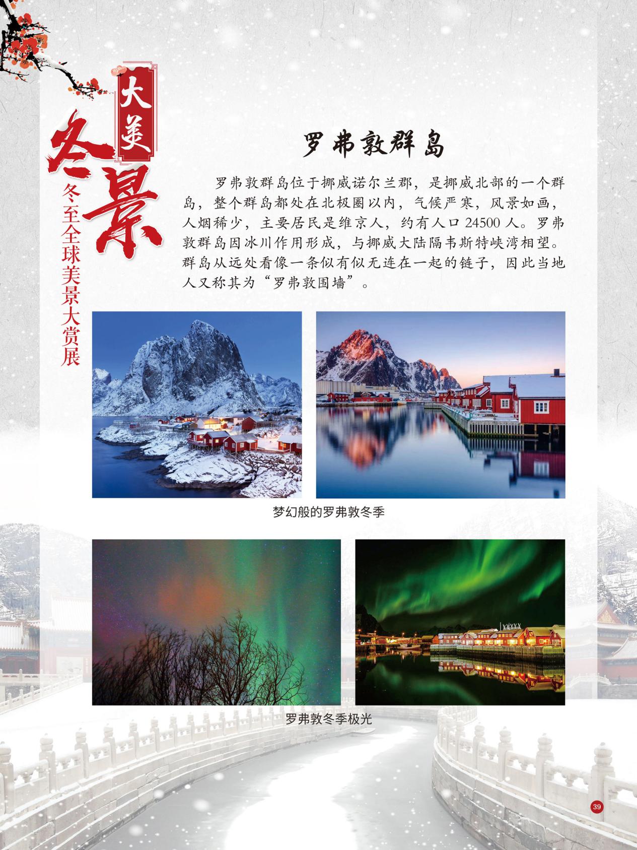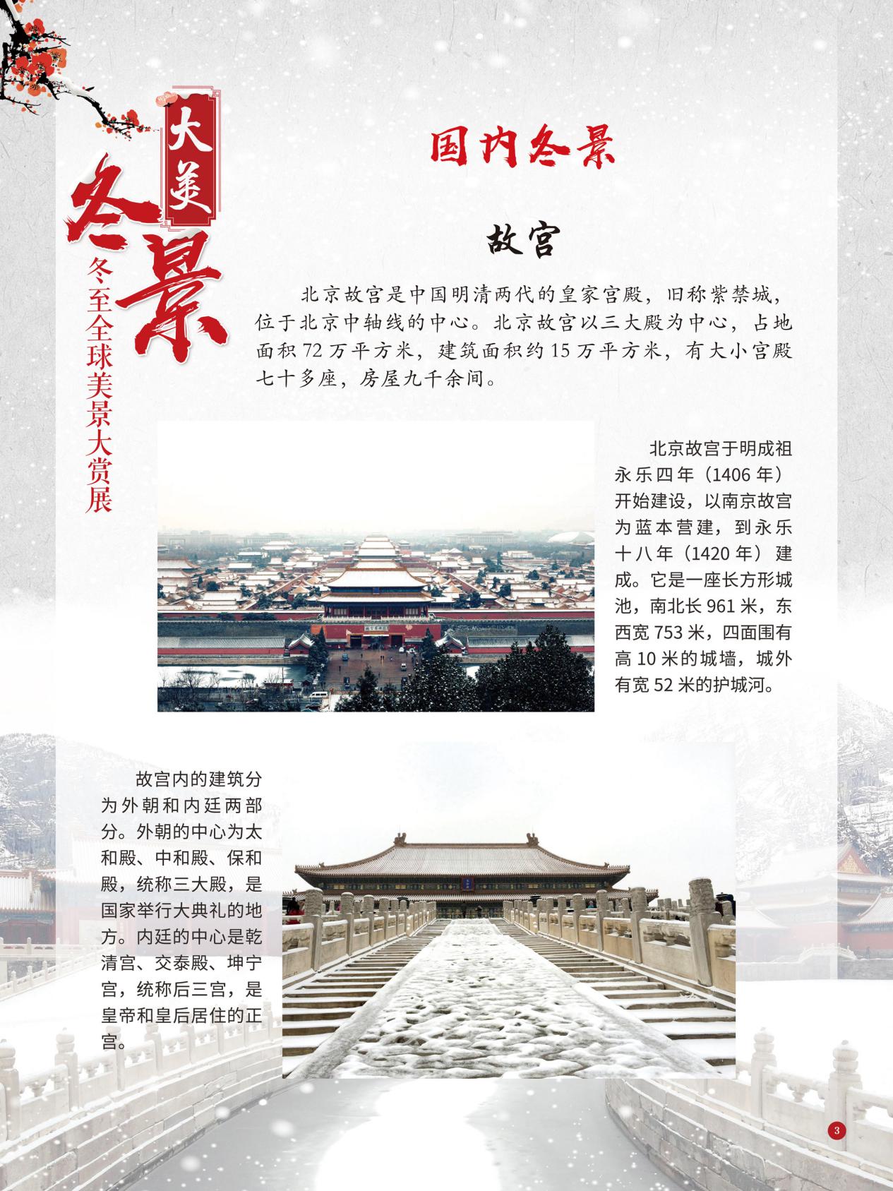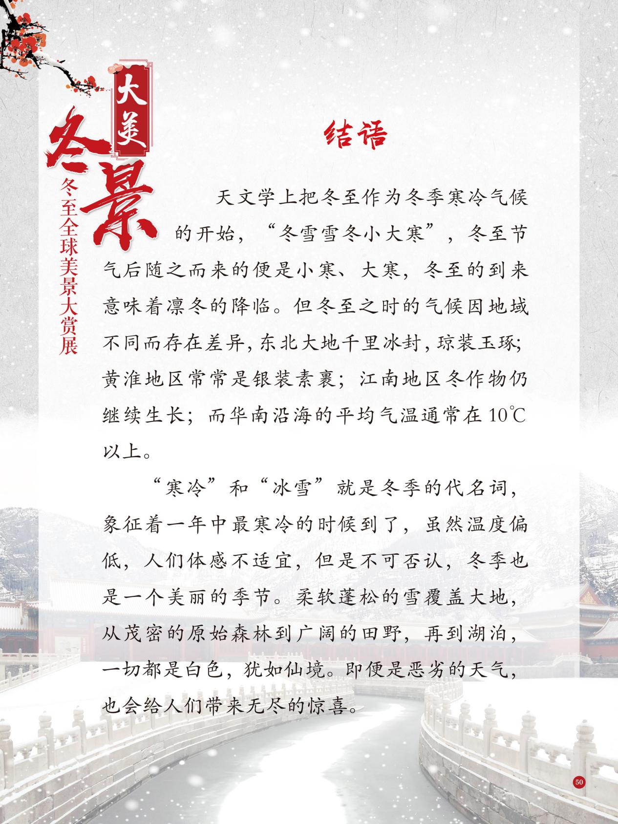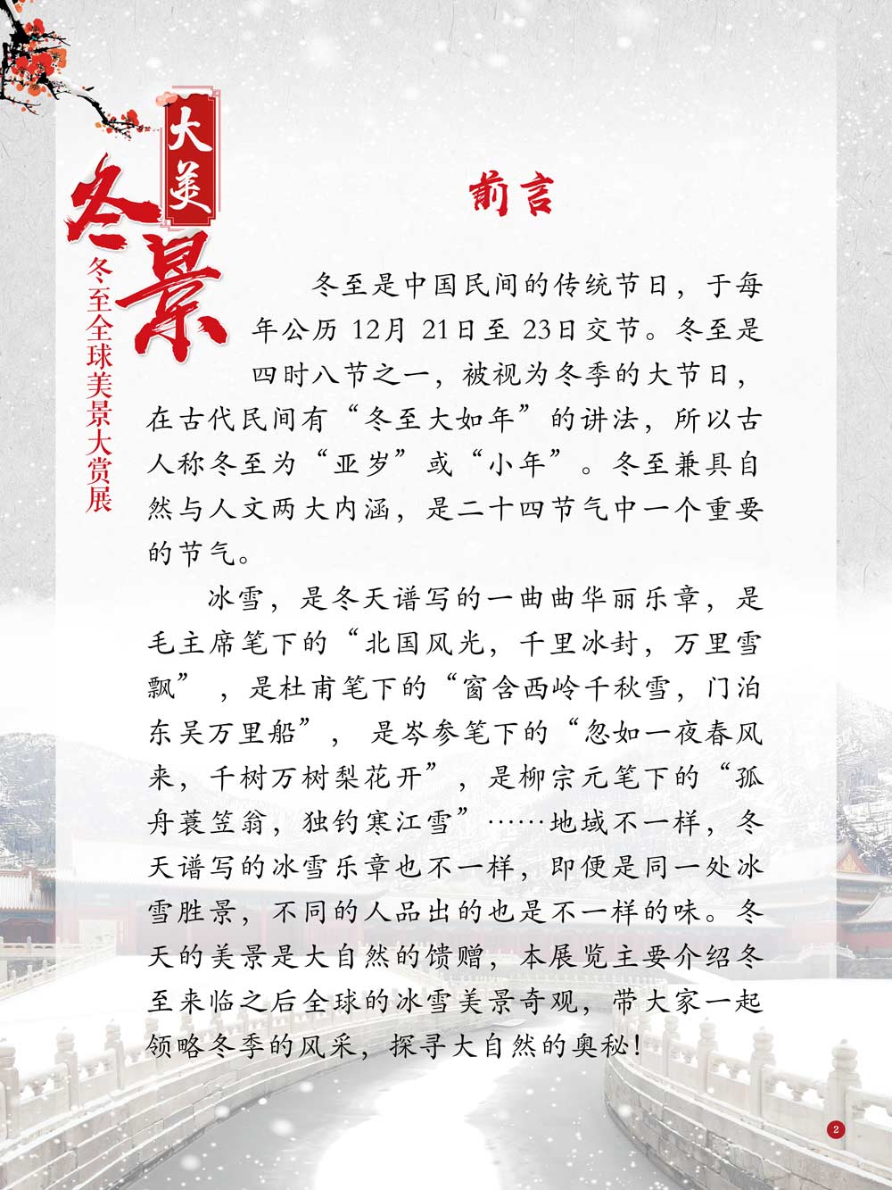 冬至是中国民间的传统节日,于每年公历12月21日至23日交节。冬至是四时八节之一,被视为冬季的大节日,在古代民间有“冬至大如年”的讲法,所以古人称冬至为“亚岁”或“小年”。冬至兼具自然与人文两大内涵,是二十四节气中一个重要的节气。 冰雪,是冬天谱写的一曲曲华丽乐章,是毛主席笔下的“北国风光,千里冰封,万里雪飘” ,是杜甫笔下的“窗含西岭千秋雪,门泊东吴万里船”, 是岑参笔下的“忽如一夜春风来,千树万树梨花开”,是柳宗元笔下的“孤舟蓑笠翁,独钓寒江雪”……地域不一样,冬天谱写的冰雪乐章也不一样,即便是同一处冰雪胜景,不同的人品出的也是不一样的味。冬天的美景是大自然的馈赠,本展览主要介绍冬至来临之后全球的冰雪美景奇观,带大家一起领略冬季的风采,探寻大自然的奥秘!