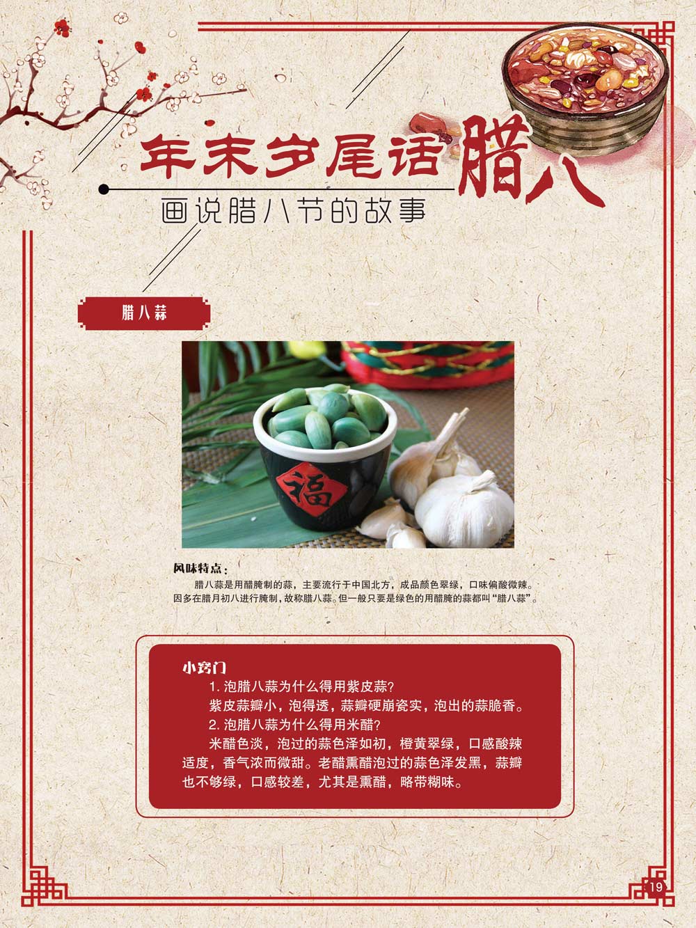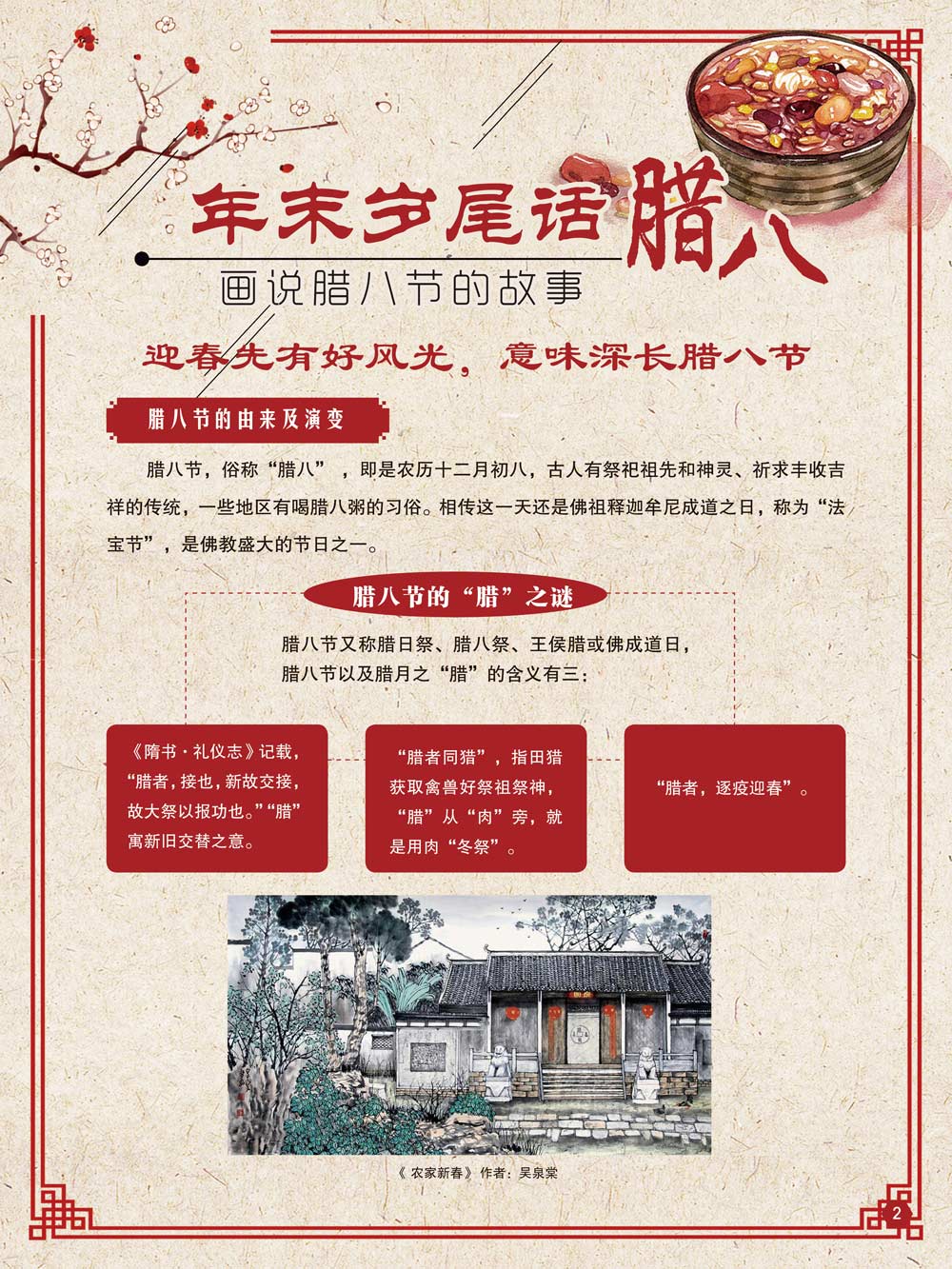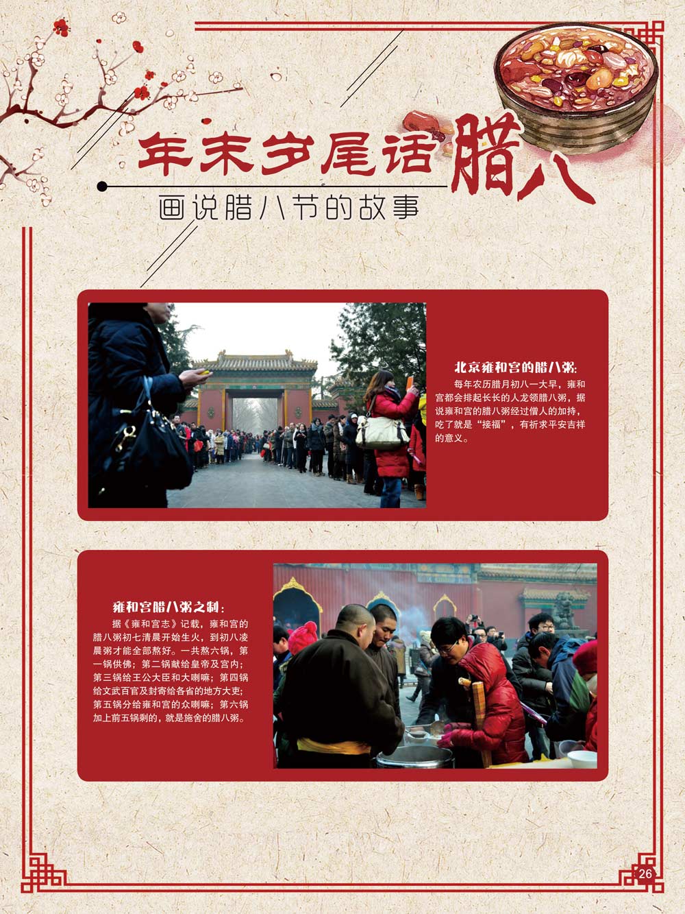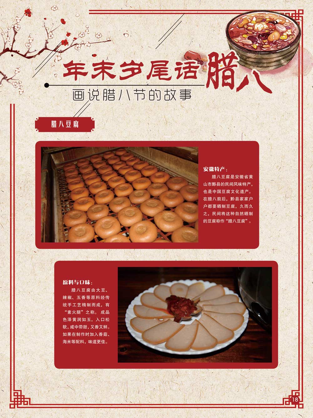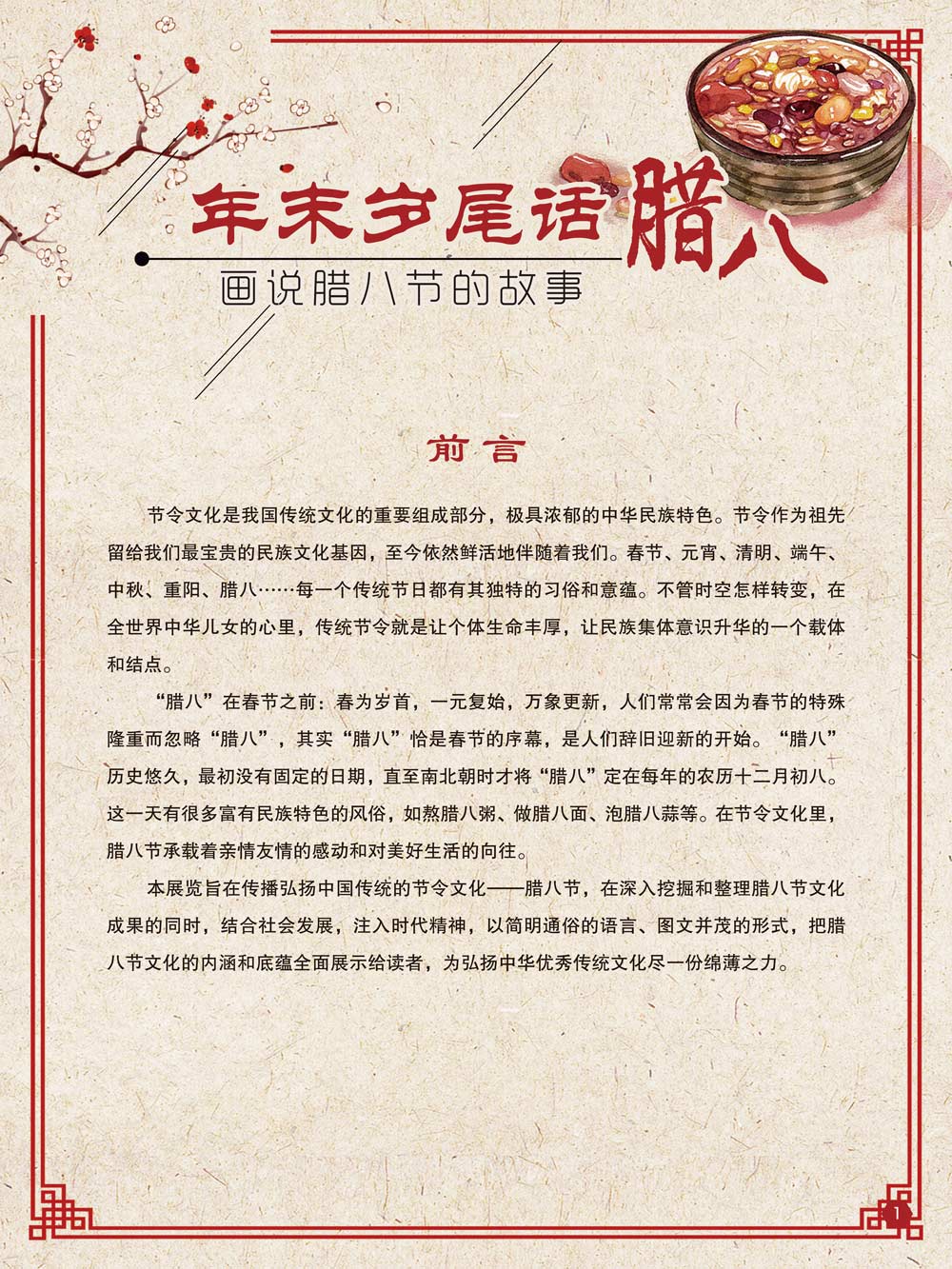 节令文化是我国传统文化的重要组成部分,极具浓郁的中华民族特色。节令作为祖先留给我们最宝贵的民族文化基因,至今依然鲜活地伴随着我们。春节、元宵、清明、端午、中秋、重阳、腊八……每一个传统节日都有其独特的习俗和意蕴。不管时空怎样转变,在全世界中华儿女的心里,传统节令就是让个体生命丰厚,让民族集体意识升华的一个载体和结点。 “腊八”在春节之前:春为岁首,一元复始,万象更新,人们常常会因为春节的特殊隆重而忽略“腊八”,其实“腊八”恰是春节的序幕,是人们辞旧迎新的开始。“腊八”历史悠久,最初没有固定的日期,直至南北朝时才将“腊八”定在每年的农历十二月初八。这一天有很多富有民族特色的风俗,如熬腊八粥、做腊八面、泡腊八蒜等。在节令文化里,腊八节承载着亲情友情的感动和对美好生活的向往。 本展览旨在传播弘扬中国传统的节令文化——腊八节,在深入挖掘和整理腊八节文化成果的同时,结合社会发展,注入时代精神,以简明通俗的语言、图文并茂的形式,把腊八节文化的内涵和底蕴全面展示给读者,为弘扬中华优秀传统文化尽一份绵薄之力。
