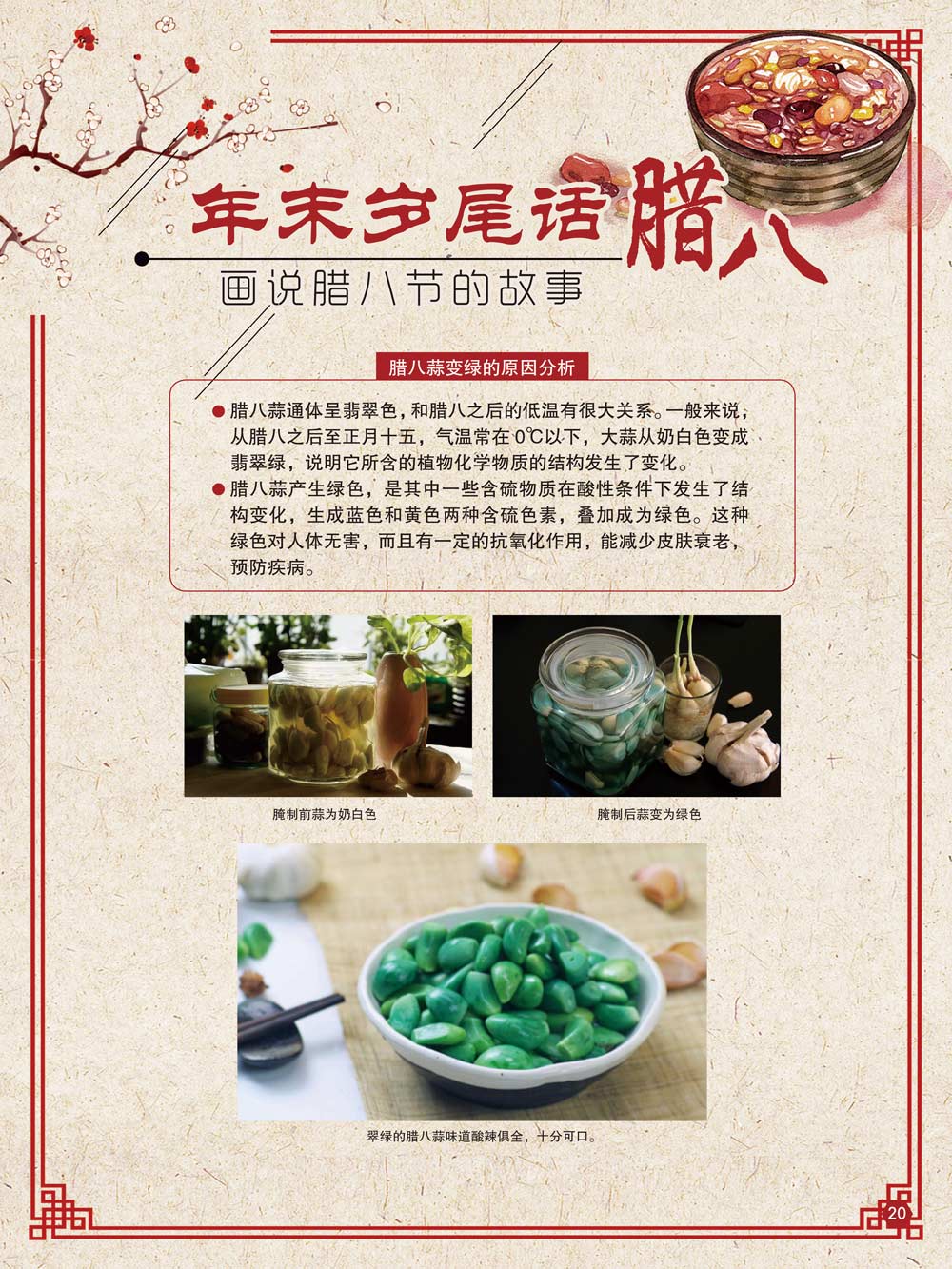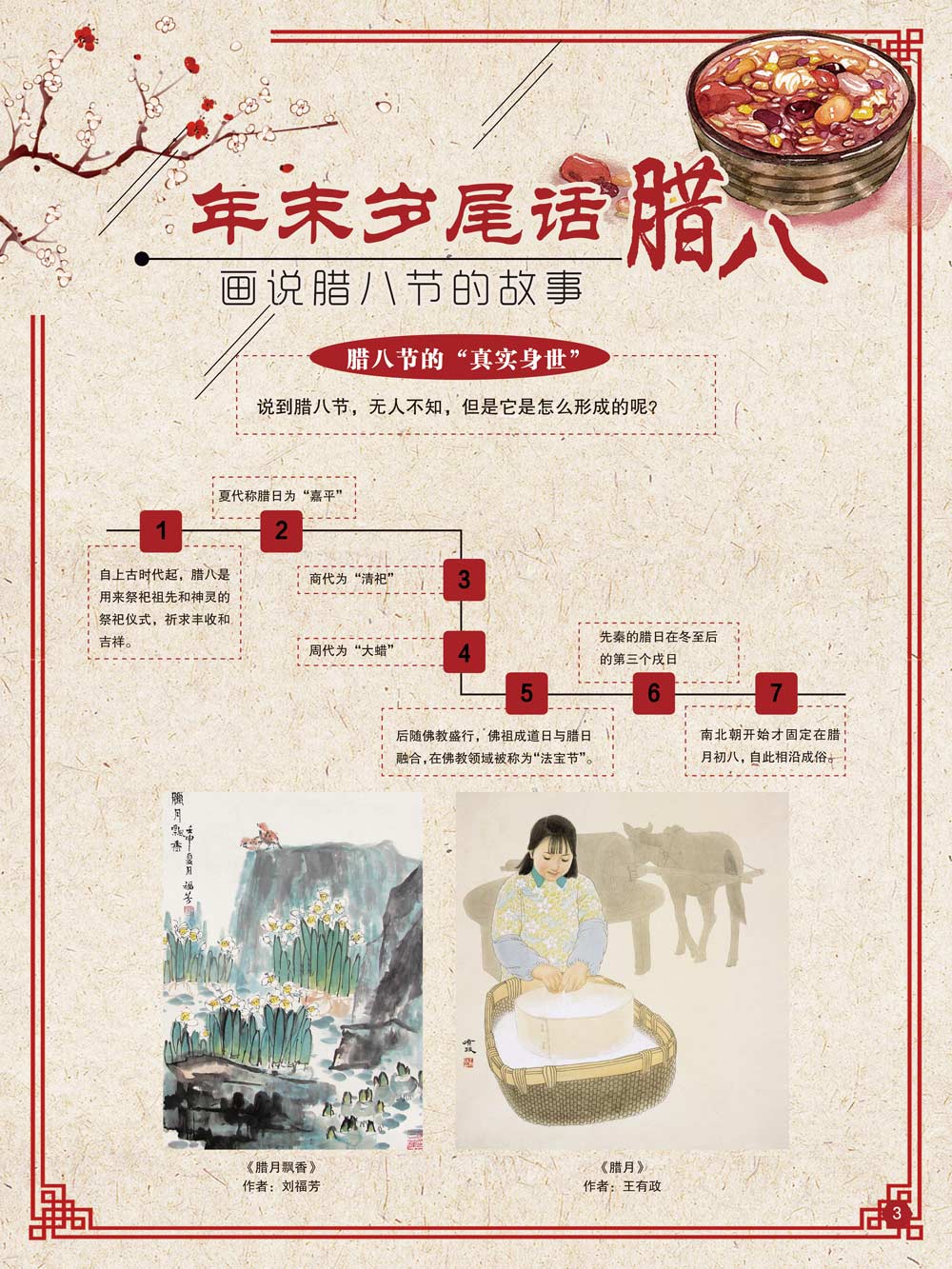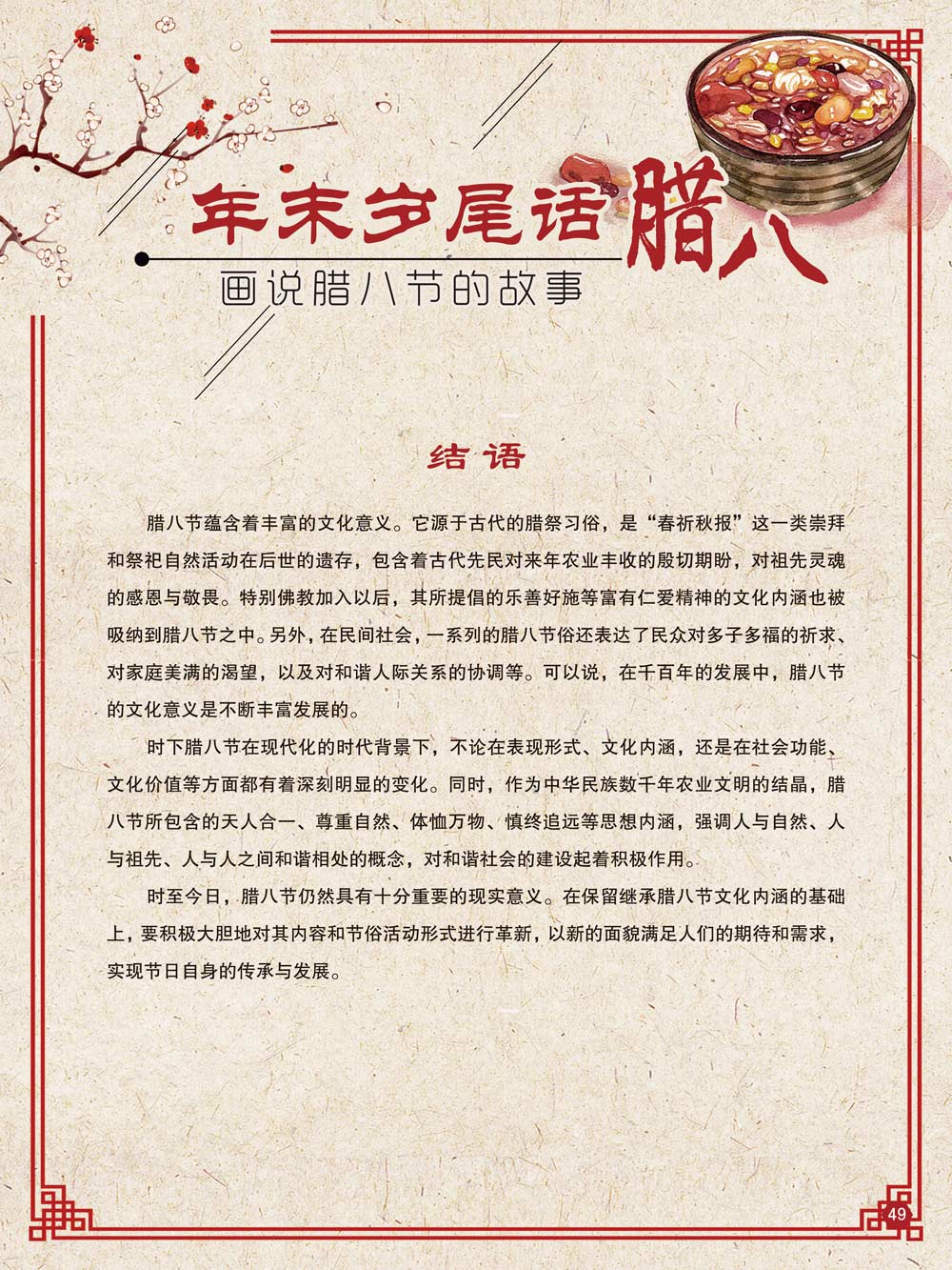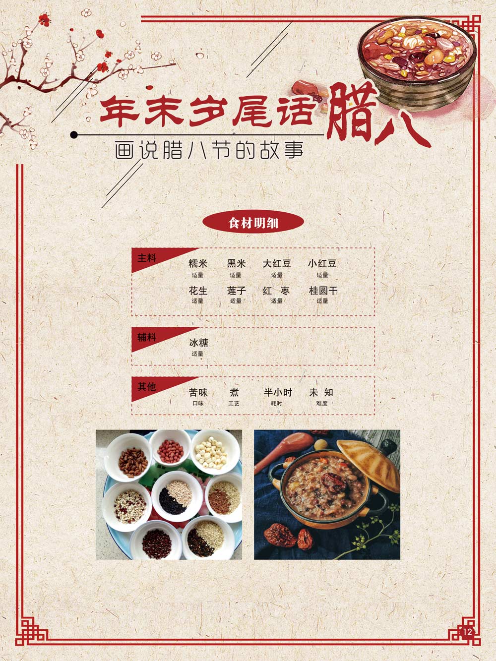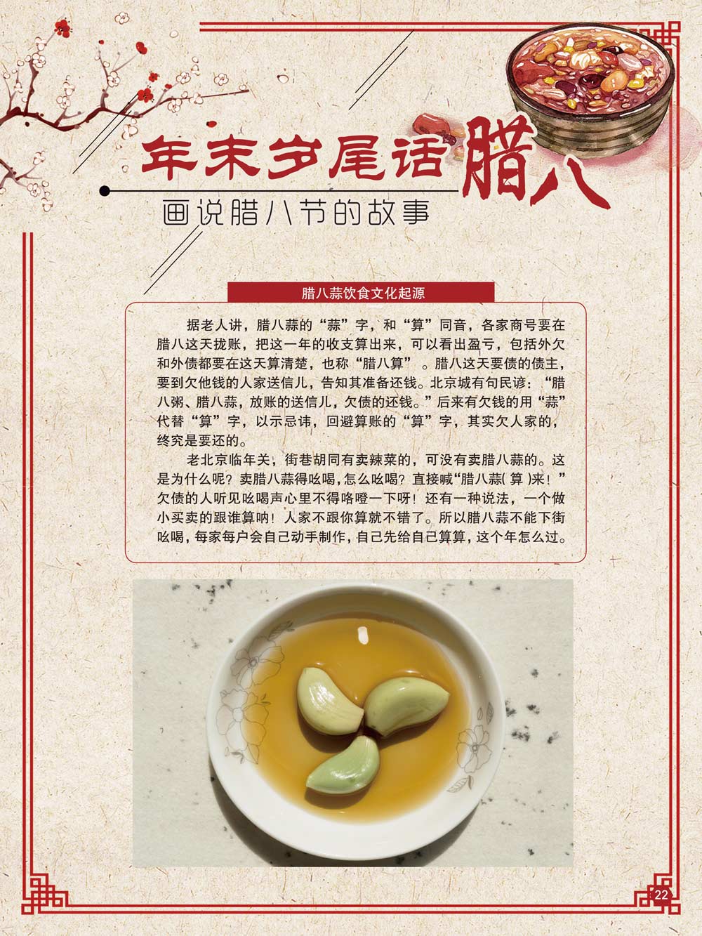 节令文化是我国传统文化的重要组成部分,极具浓郁的中华民族特色。节令作为祖先留给我们最宝贵的民族文化基因,至今依然鲜活地伴随着我们。春节、元宵、清明、端午、中秋、重阳、腊八……每一个传统节日都有其独特的习俗和意蕴。不管时空怎样转变,在全世界中华儿女的心里,传统节令就是让个体生命丰厚,让民族集体意识升华的一个载体和结点。 “腊八”在春节之前:春为岁首,一元复始,万象更新,人们常常会因为春节的特殊隆重而忽略“腊八”,其实“腊八”恰是春节的序幕,是人们辞旧迎新的开始。“腊八”历史悠久,最初没有固定的日期,直至南北朝时才将“腊八”定在每年的农历十二月初八。这一天有很多富有民族特色的风俗,如熬腊八粥、做腊八面、泡腊八蒜等。在节令文化里,腊八节承载着亲情友情的感动和对美好生活的向往。 本展览旨在传播弘扬中国传统的节令文化——腊八节,在深入挖掘和整理腊八节文化成果的同时,结合社会发展,注入时代精神,以简明通俗的语言、图文并茂的形式,把腊八节文化的内涵和底蕴全面展示给读者,为弘扬中华优秀传统文化尽一份绵薄之力。