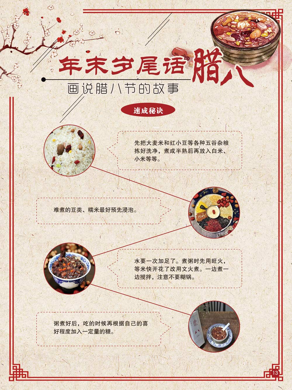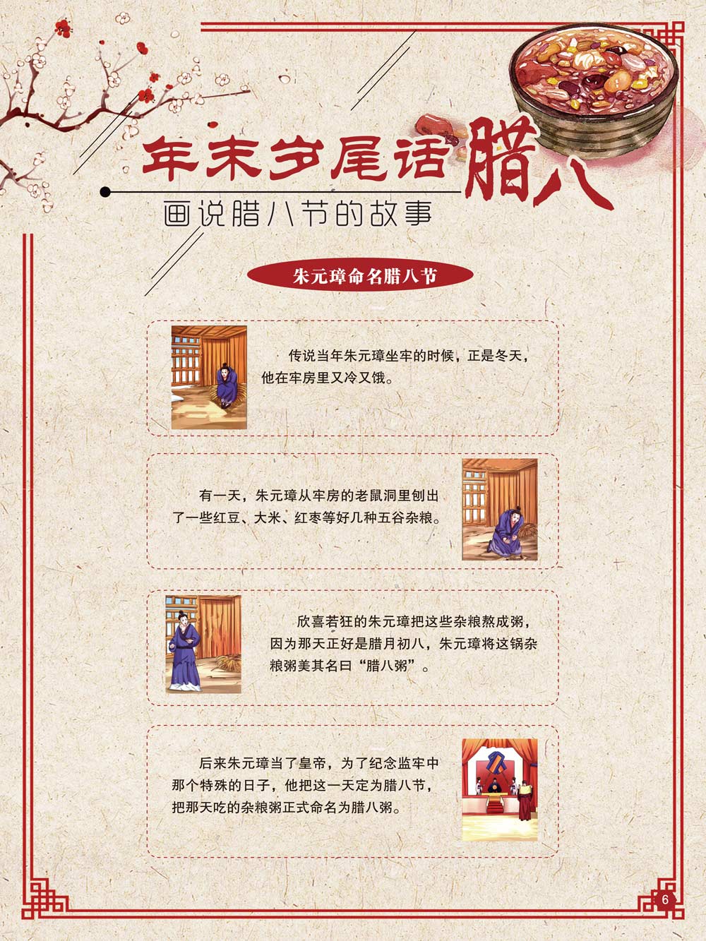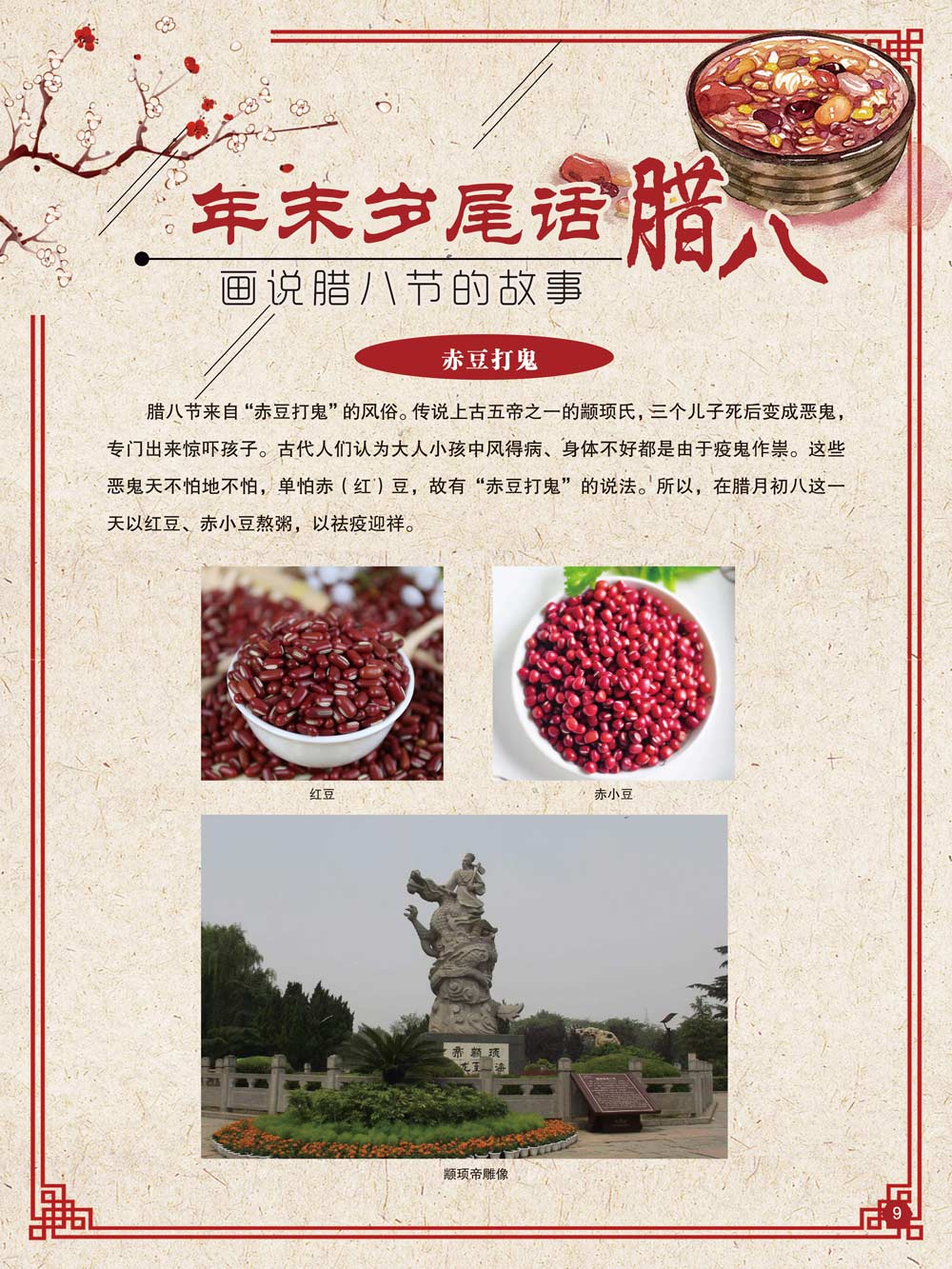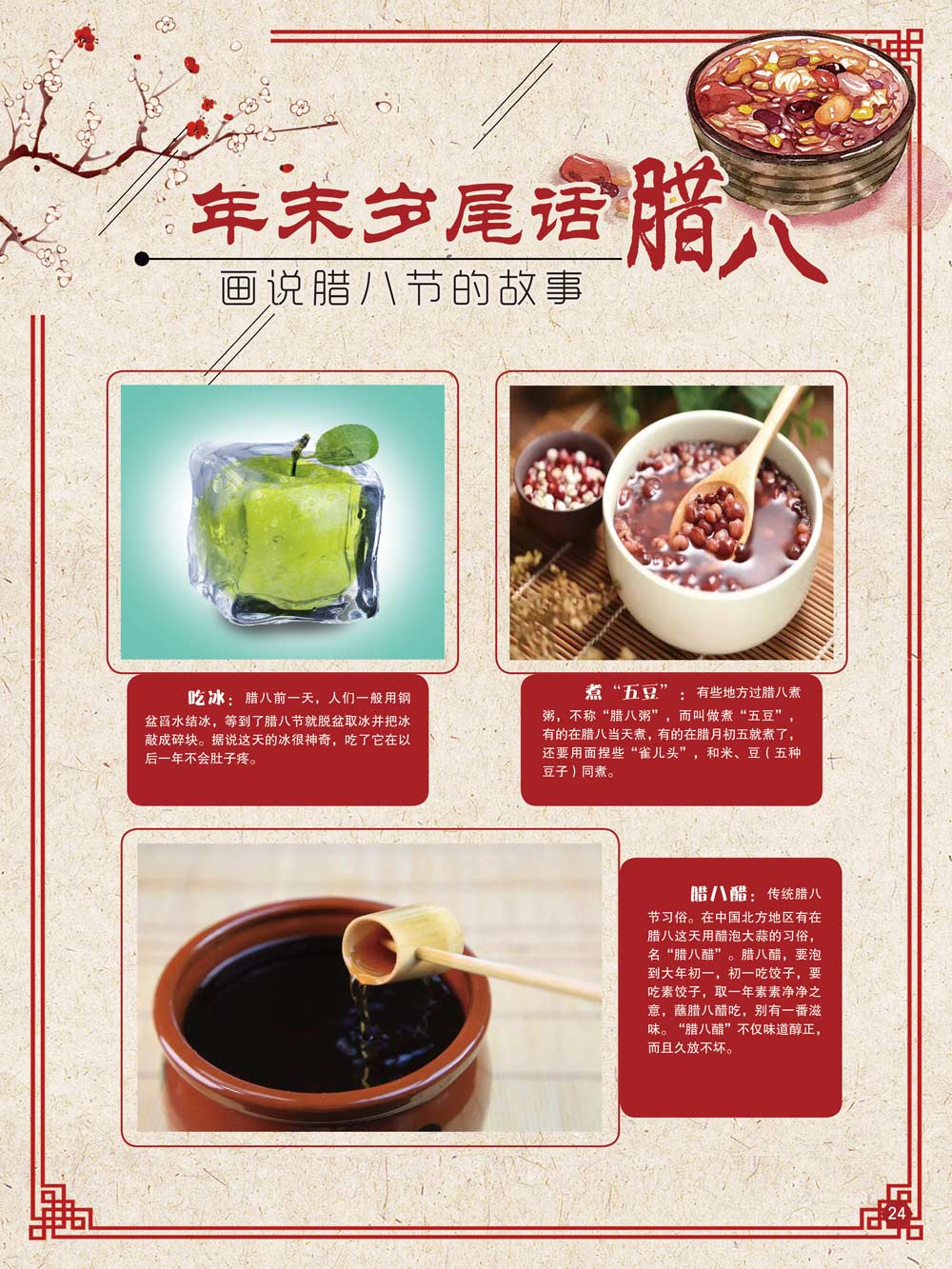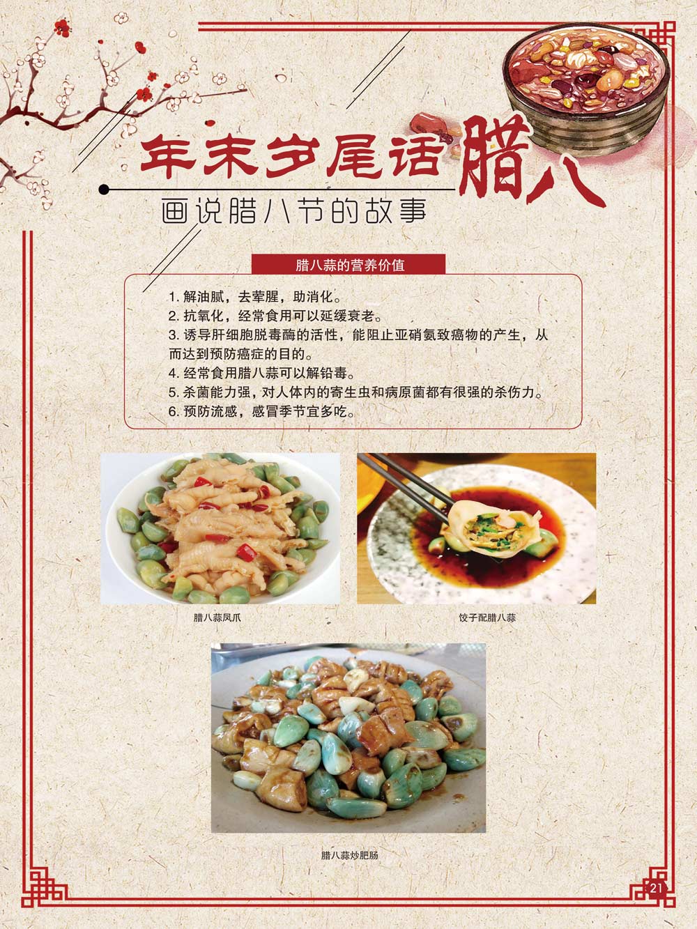 节令文化是我国传统文化的重要组成部分,极具浓郁的中华民族特色。节令作为祖先留给我们最宝贵的民族文化基因,至今依然鲜活地伴随着我们。春节、元宵、清明、端午、中秋、重阳、腊八……每一个传统节日都有其独特的习俗和意蕴。不管时空怎样转变,在全世界中华儿女的心里,传统节令就是让个体生命丰厚,让民族集体意识升华的一个载体和结点。 “腊八”在春节之前:春为岁首,一元复始,万象更新,人们常常会因为春节的特殊隆重而忽略“腊八”,其实“腊八”恰是春节的序幕,是人们辞旧迎新的开始。“腊八”历史悠久,最初没有固定的日期,直至南北朝时才将“腊八”定在每年的农历十二月初八。这一天有很多富有民族特色的风俗,如熬腊八粥、做腊八面、泡腊八蒜等。在节令文化里,腊八节承载着亲情友情的感动和对美好生活的向往。 本展览旨在传播弘扬中国传统的节令文化——腊八节,在深入挖掘和整理腊八节文化成果的同时,结合社会发展,注入时代精神,以简明通俗的语言、图文并茂的形式,把腊八节文化的内涵和底蕴全面展示给读者,为弘扬中华优秀传统文化尽一份绵薄之力。