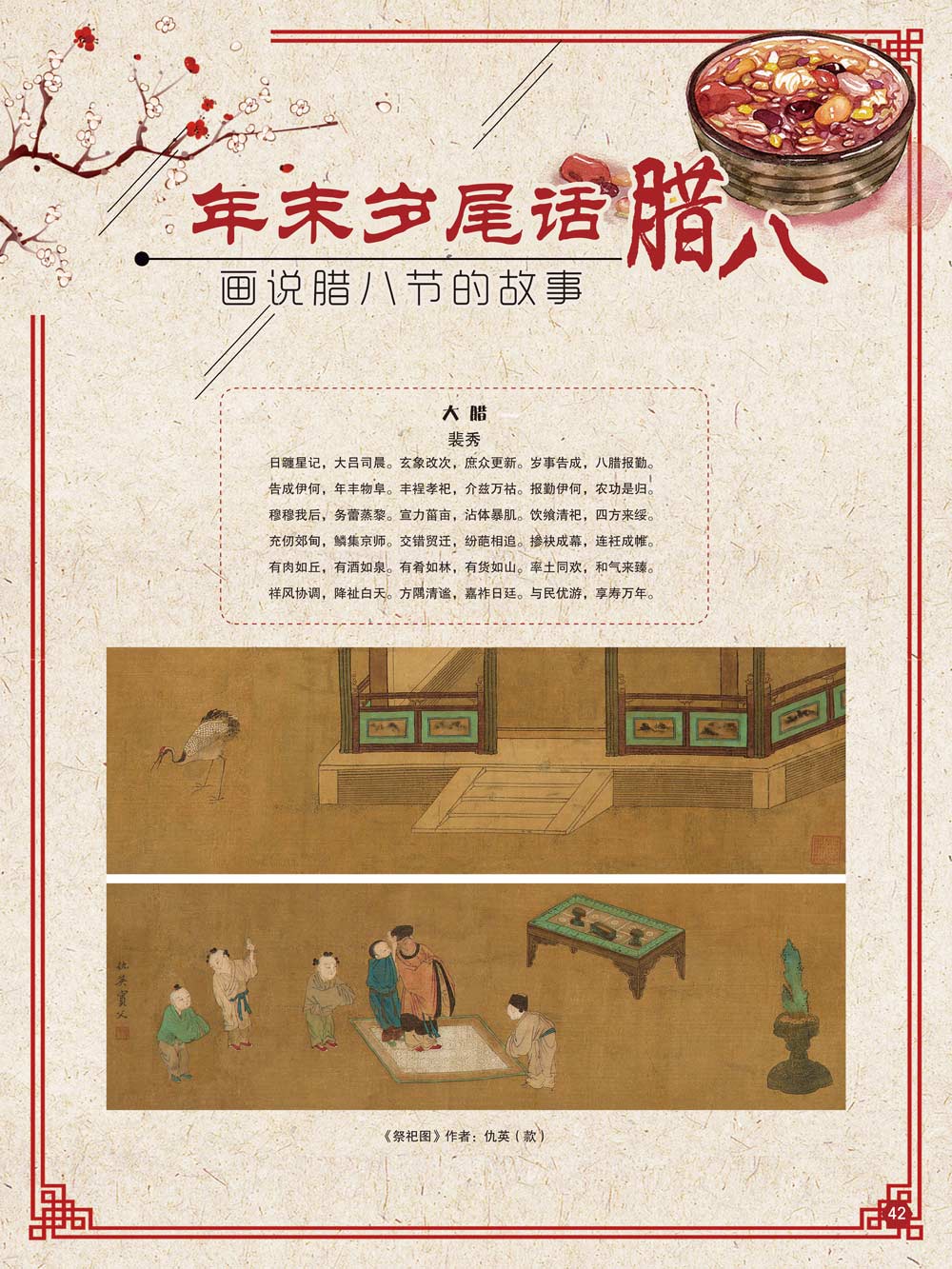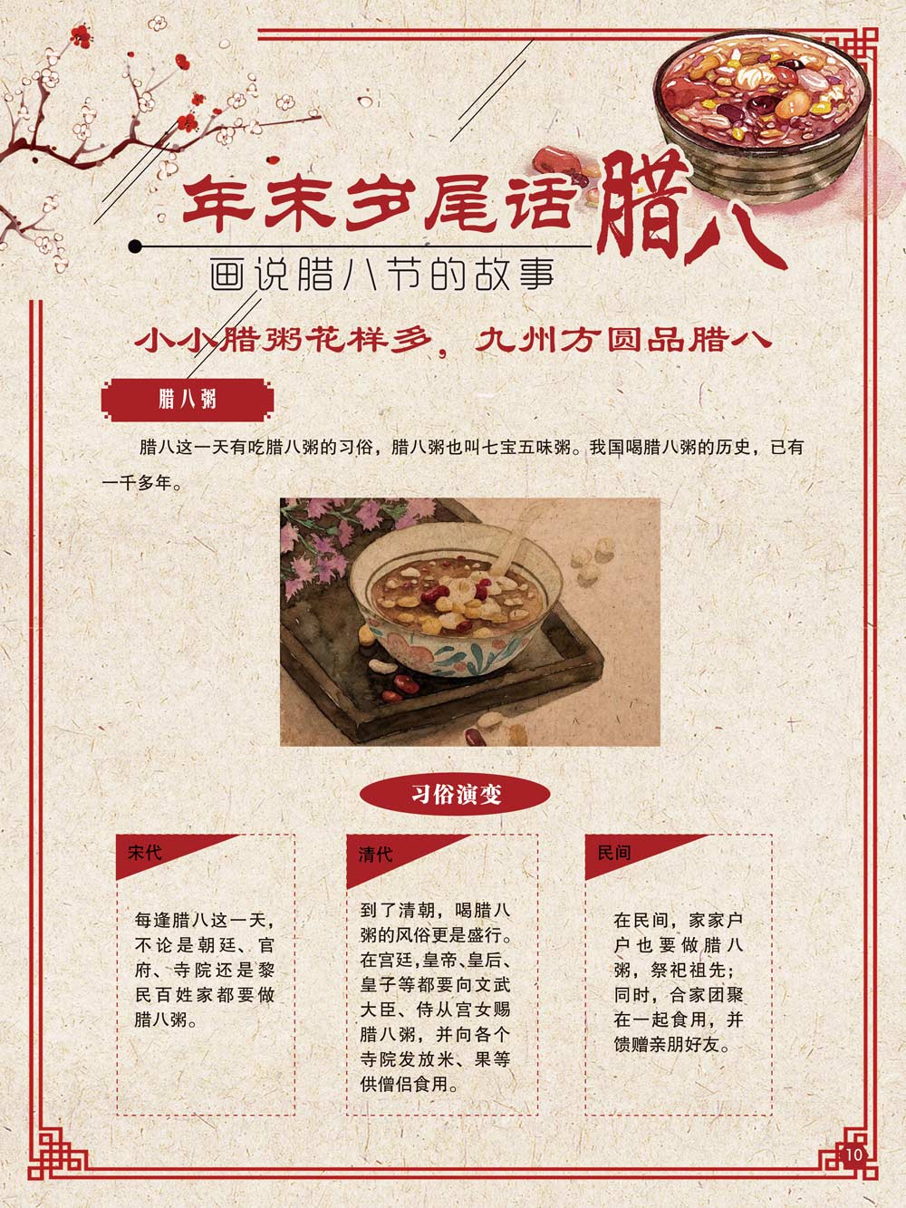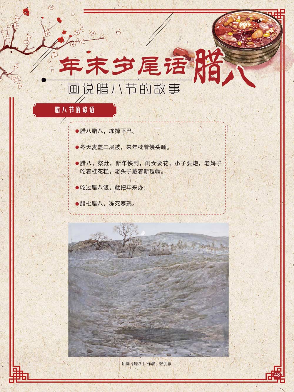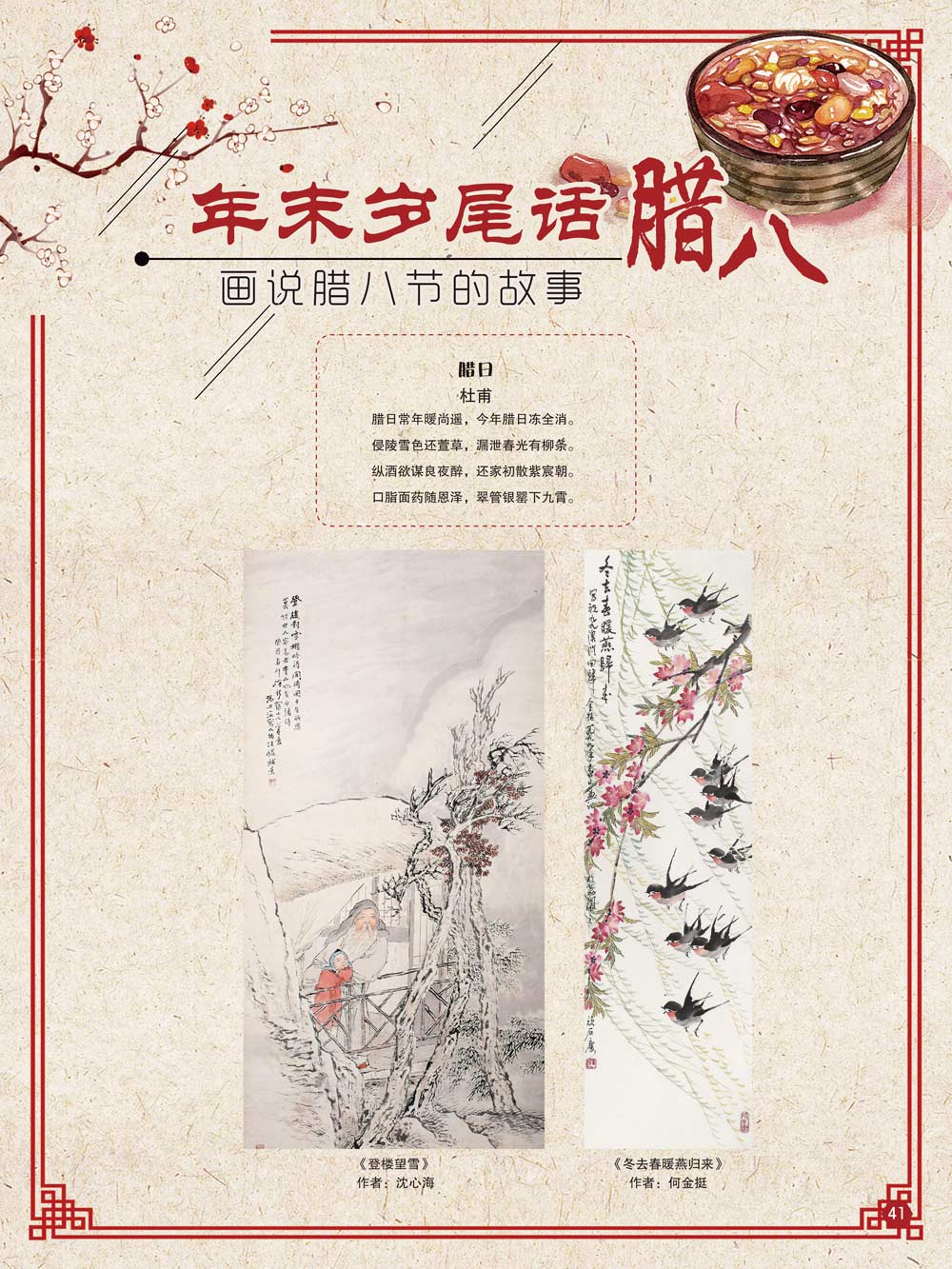 节令文化是我国传统文化的重要组成部分,极具浓郁的中华民族特色。节令作为祖先留给我们最宝贵的民族文化基因,至今依然鲜活地伴随着我们。春节、元宵、清明、端午、中秋、重阳、腊八……每一个传统节日都有其独特的习俗和意蕴。不管时空怎样转变,在全世界中华儿女的心里,传统节令就是让个体生命丰厚,让民族集体意识升华的一个载体和结点。 “腊八”在春节之前:春为岁首,一元复始,万象更新,人们常常会因为春节的特殊隆重而忽略“腊八”,其实“腊八”恰是春节的序幕,是人们辞旧迎新的开始。“腊八”历史悠久,最初没有固定的日期,直至南北朝时才将“腊八”定在每年的农历十二月初八。这一天有很多富有民族特色的风俗,如熬腊八粥、做腊八面、泡腊八蒜等。在节令文化里,腊八节承载着亲情友情的感动和对美好生活的向往。 本展览旨在传播弘扬中国传统的节令文化——腊八节,在深入挖掘和整理腊八节文化成果的同时,结合社会发展,注入时代精神,以简明通俗的语言、图文并茂的形式,把腊八节文化的内涵和底蕴全面展示给读者,为弘扬中华优秀传统文化尽一份绵薄之力。