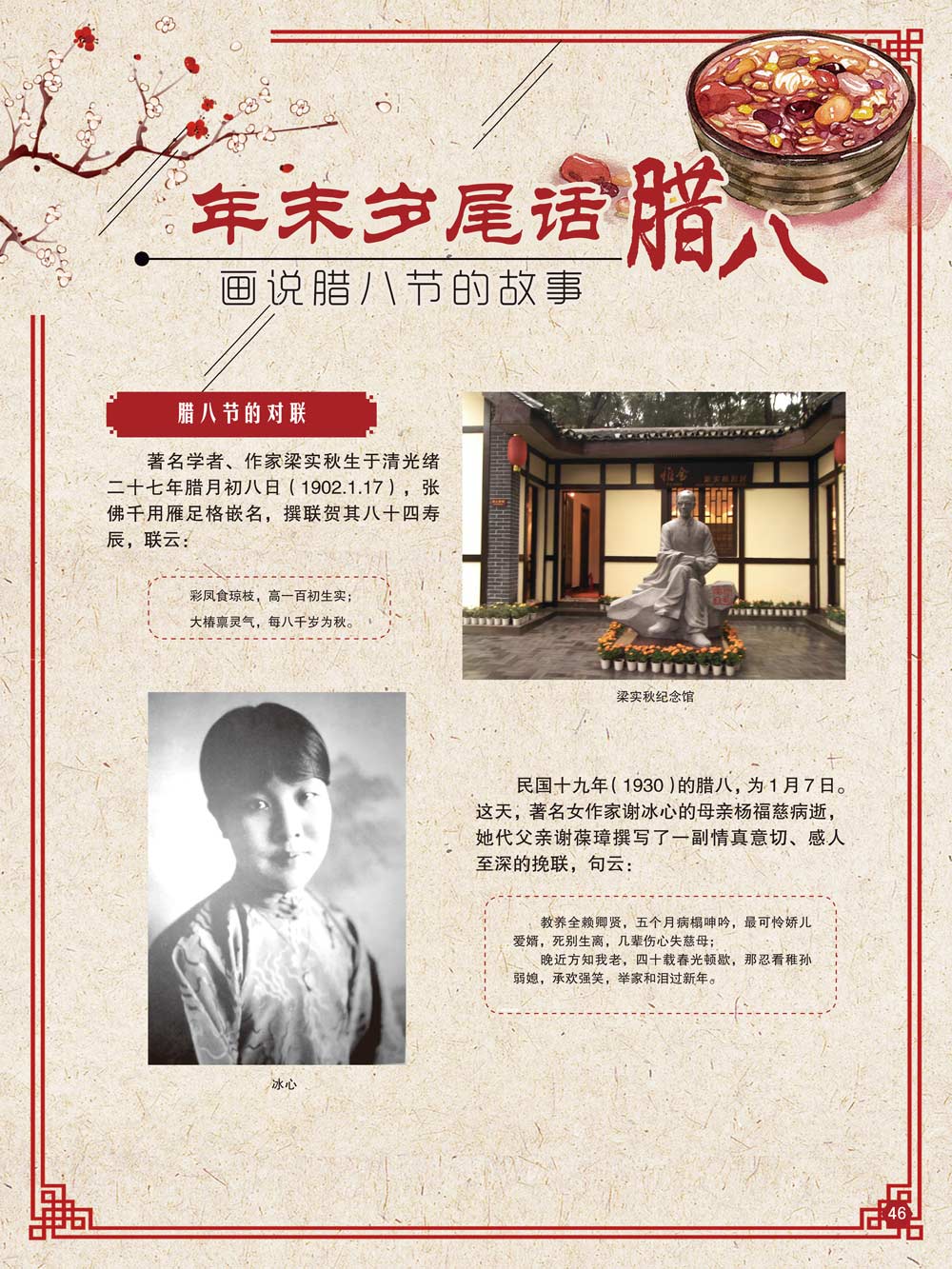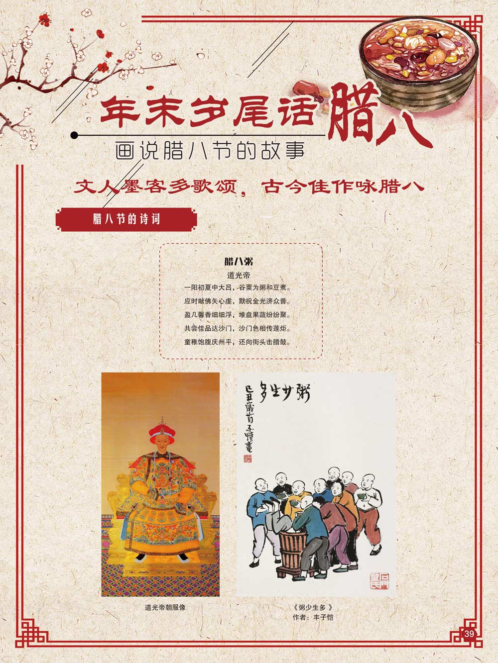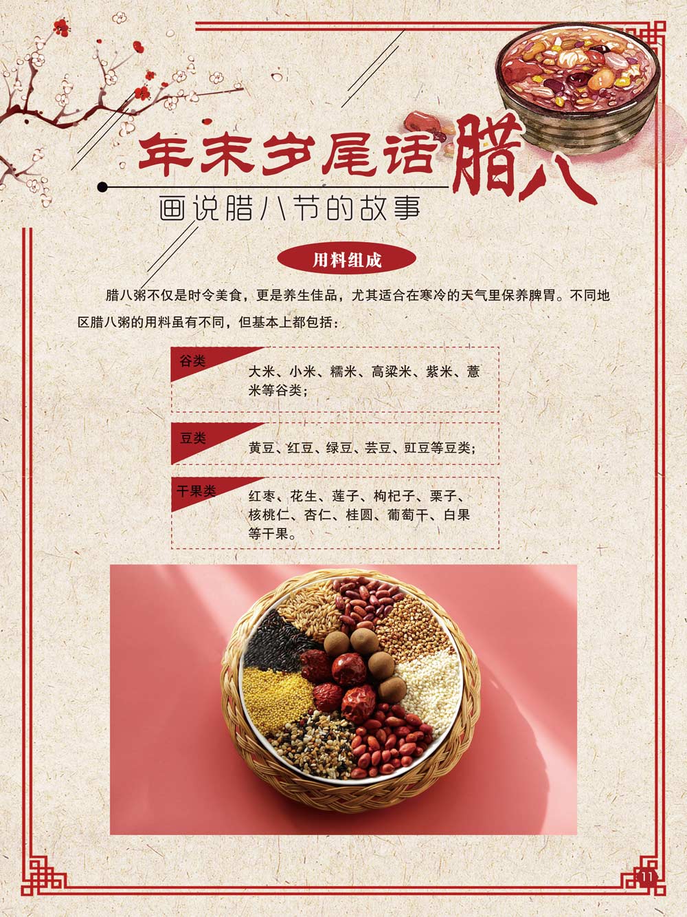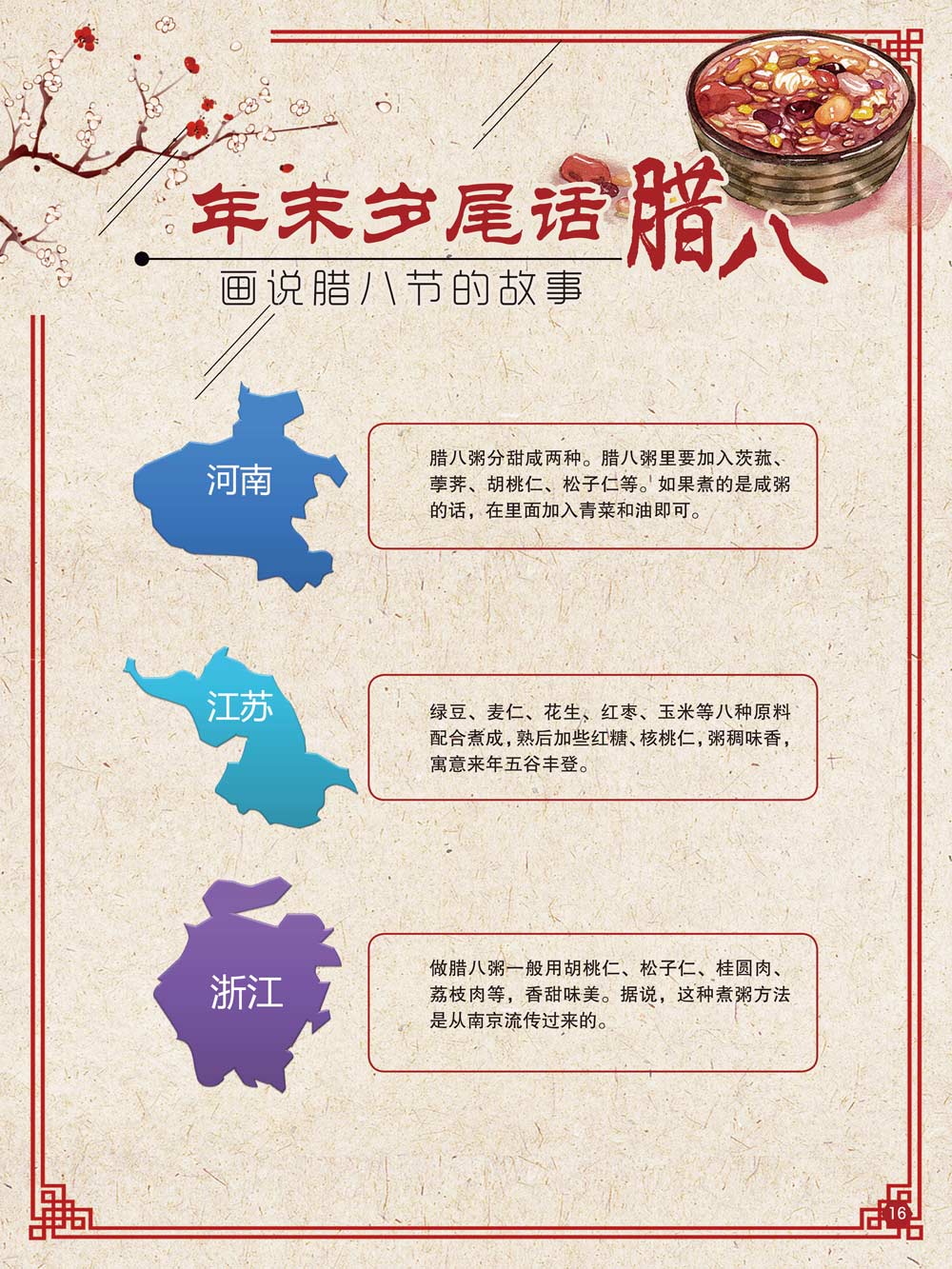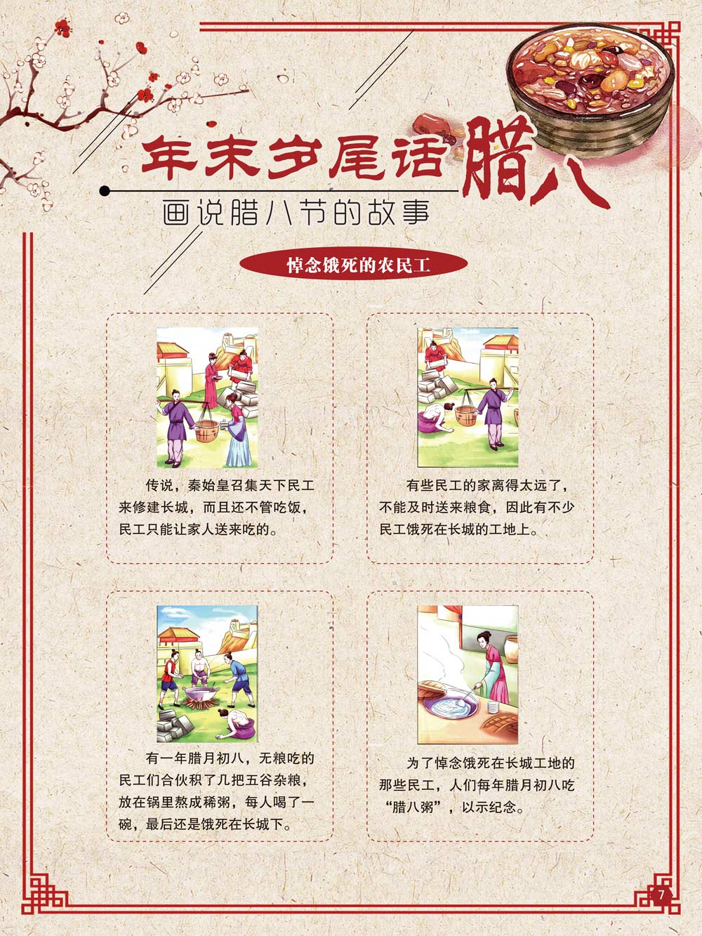 节令文化是我国传统文化的重要组成部分,极具浓郁的中华民族特色。节令作为祖先留给我们最宝贵的民族文化基因,至今依然鲜活地伴随着我们。春节、元宵、清明、端午、中秋、重阳、腊八……每一个传统节日都有其独特的习俗和意蕴。不管时空怎样转变,在全世界中华儿女的心里,传统节令就是让个体生命丰厚,让民族集体意识升华的一个载体和结点。 “腊八”在春节之前:春为岁首,一元复始,万象更新,人们常常会因为春节的特殊隆重而忽略“腊八”,其实“腊八”恰是春节的序幕,是人们辞旧迎新的开始。“腊八”历史悠久,最初没有固定的日期,直至南北朝时才将“腊八”定在每年的农历十二月初八。这一天有很多富有民族特色的风俗,如熬腊八粥、做腊八面、泡腊八蒜等。在节令文化里,腊八节承载着亲情友情的感动和对美好生活的向往。 本展览旨在传播弘扬中国传统的节令文化——腊八节,在深入挖掘和整理腊八节文化成果的同时,结合社会发展,注入时代精神,以简明通俗的语言、图文并茂的形式,把腊八节文化的内涵和底蕴全面展示给读者,为弘扬中华优秀传统文化尽一份绵薄之力。