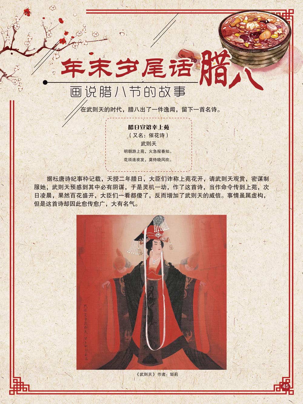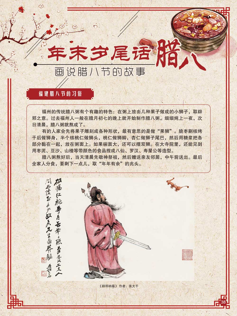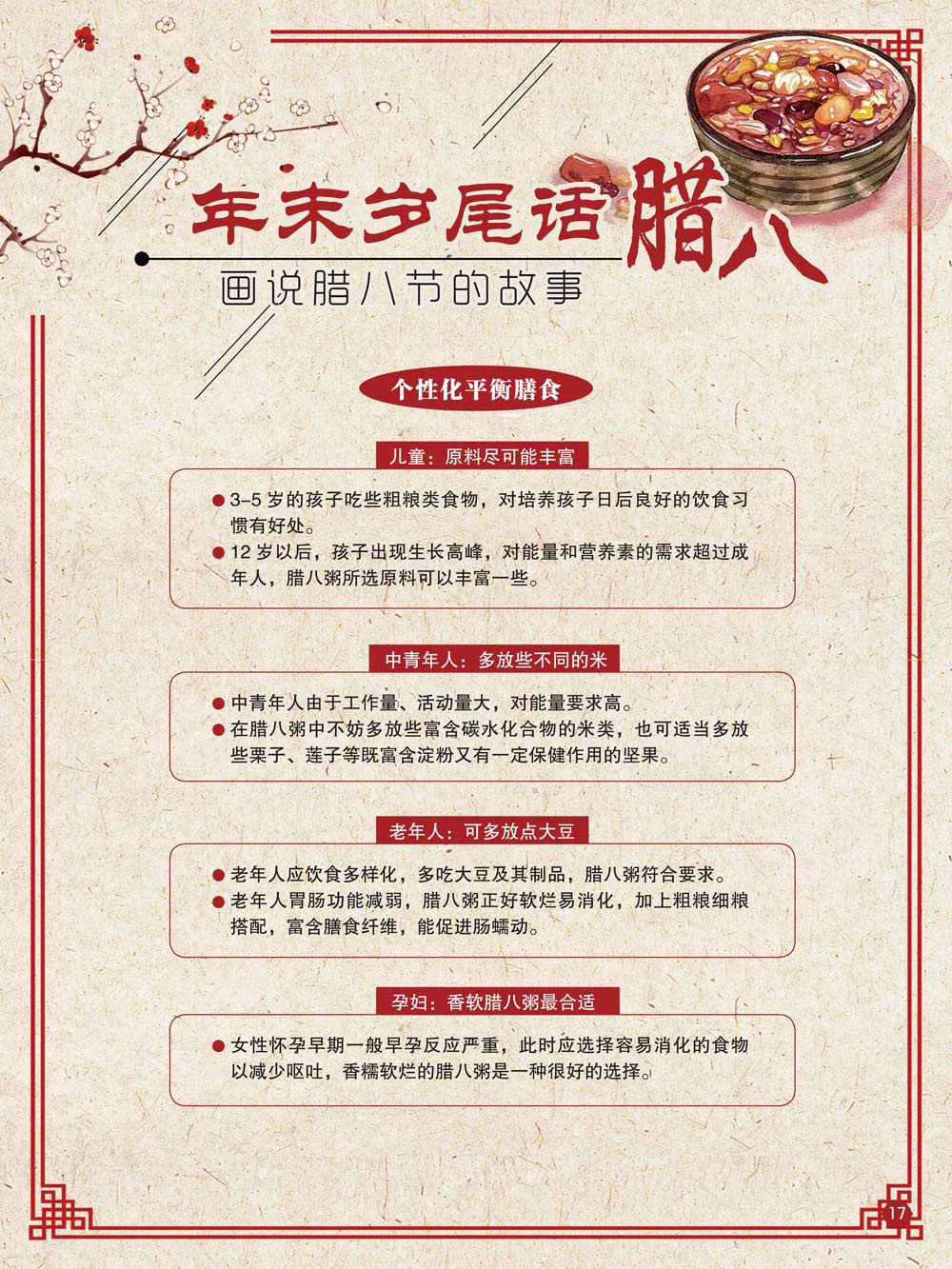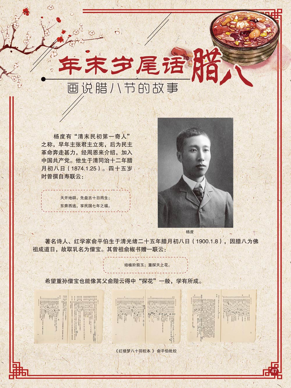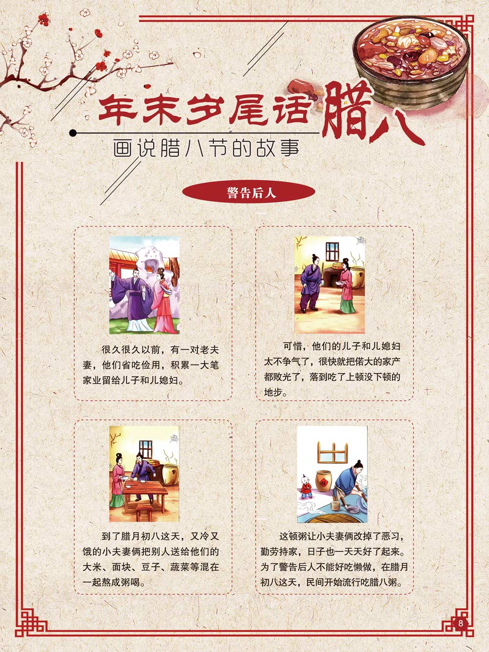 节令文化是我国传统文化的重要组成部分,极具浓郁的中华民族特色。节令作为祖先留给我们最宝贵的民族文化基因,至今依然鲜活地伴随着我们。春节、元宵、清明、端午、中秋、重阳、腊八……每一个传统节日都有其独特的习俗和意蕴。不管时空怎样转变,在全世界中华儿女的心里,传统节令就是让个体生命丰厚,让民族集体意识升华的一个载体和结点。 “腊八”在春节之前:春为岁首,一元复始,万象更新,人们常常会因为春节的特殊隆重而忽略“腊八”,其实“腊八”恰是春节的序幕,是人们辞旧迎新的开始。“腊八”历史悠久,最初没有固定的日期,直至南北朝时才将“腊八”定在每年的农历十二月初八。这一天有很多富有民族特色的风俗,如熬腊八粥、做腊八面、泡腊八蒜等。在节令文化里,腊八节承载着亲情友情的感动和对美好生活的向往。 本展览旨在传播弘扬中国传统的节令文化——腊八节,在深入挖掘和整理腊八节文化成果的同时,结合社会发展,注入时代精神,以简明通俗的语言、图文并茂的形式,把腊八节文化的内涵和底蕴全面展示给读者,为弘扬中华优秀传统文化尽一份绵薄之力。