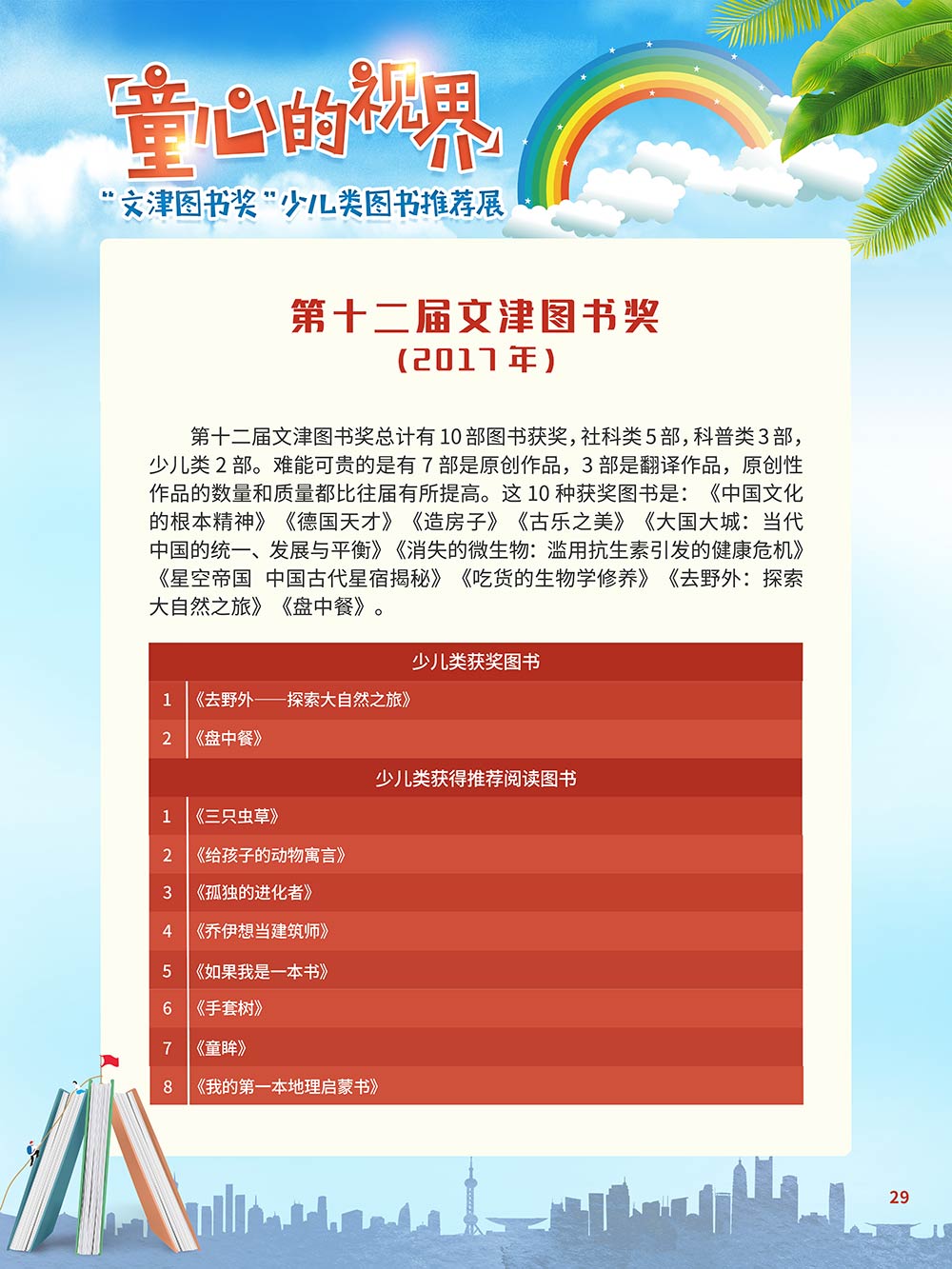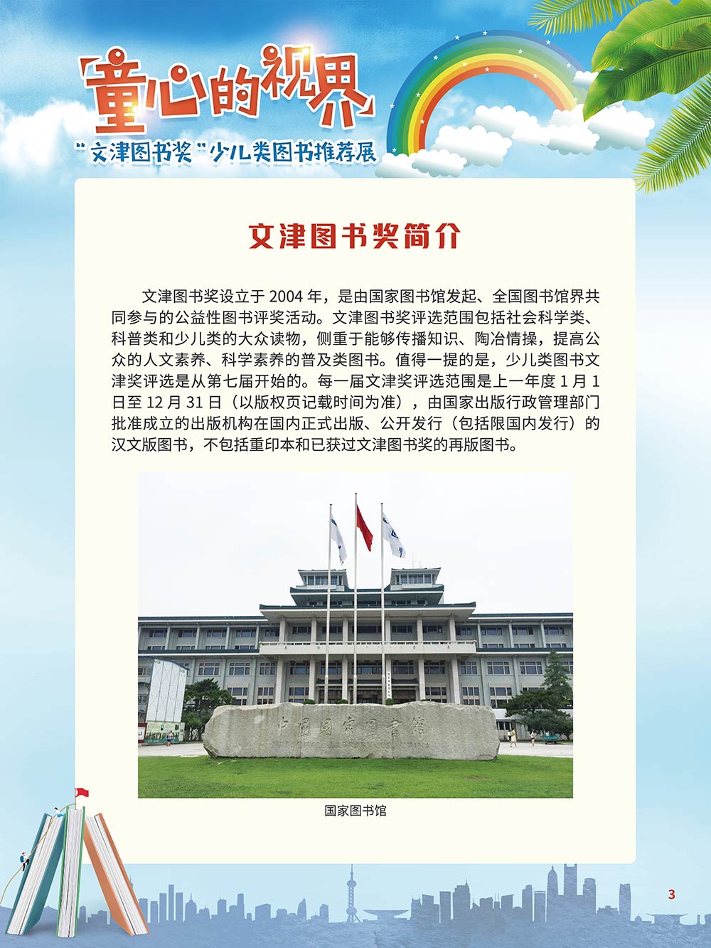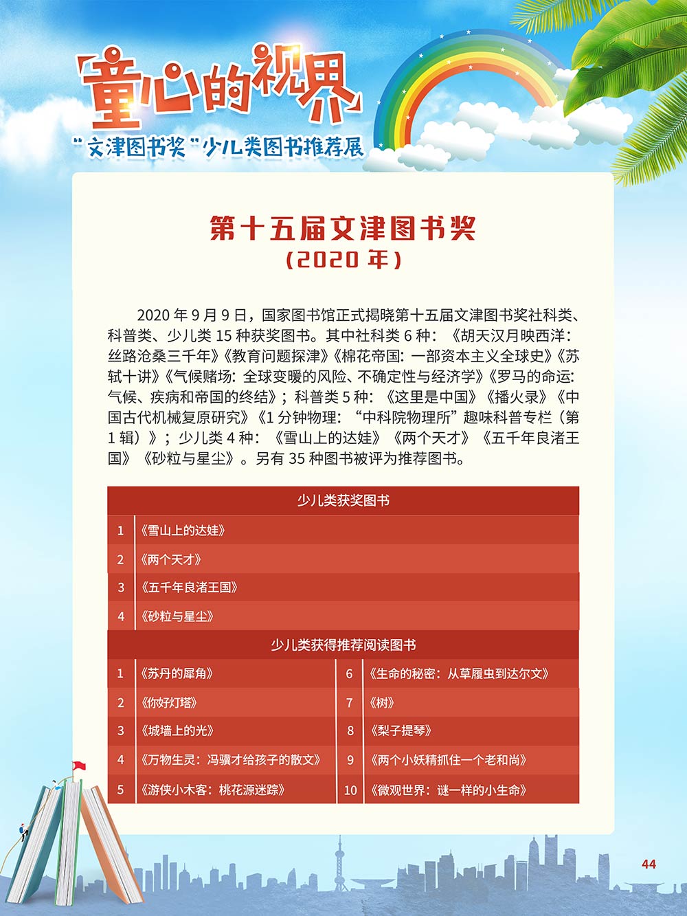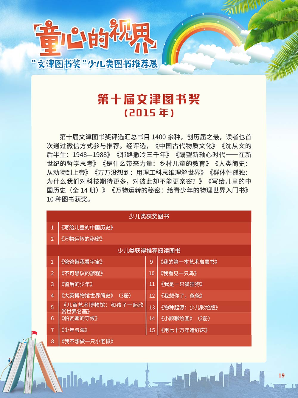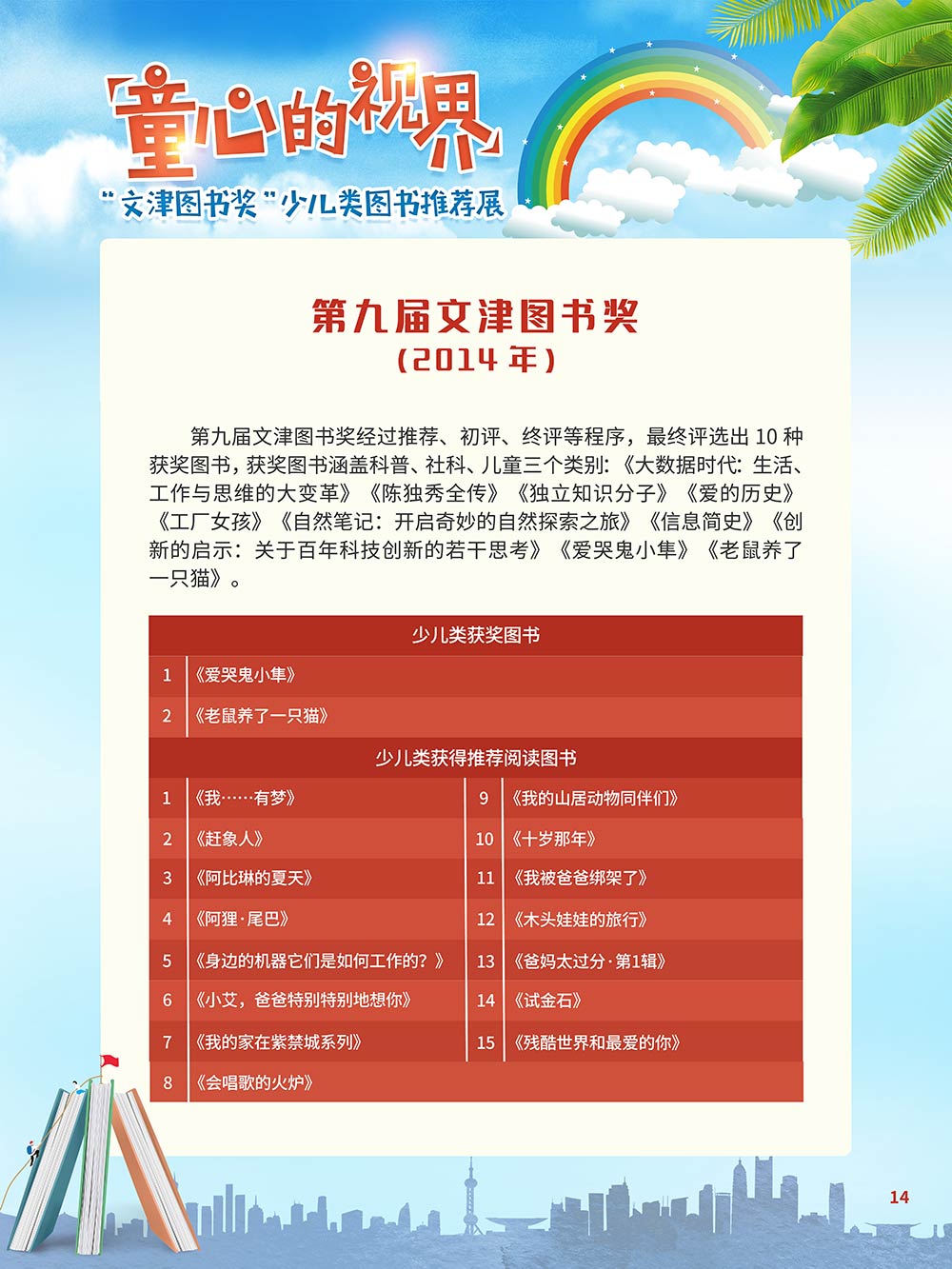 随着生活水平的日益提高,青少年儿童的阅读则更需要人们的引导和关注。特别是在信息爆炸的今天,如何为青少年儿童提供他们感兴趣的,有利于身心健康的、有利于知识增长的书籍,这是一个重要的问题。文津图书奖从2010年第七届开始,每年都会有少儿类图书评选,以及少儿类推荐阅读书籍,这无异于是为少年儿年儿童提供了宝贵的阅读书单。这些书的作者带着童心,以少年儿童的视角创作出来的书籍,更符合少年儿童的阅读和理解,是少年儿童理想的知识宝库。 在全民阅读浪潮席卷全国的今天,少年儿童阅读逐渐成为老师和家长们关注的话题。在儿童节到来之际,我们特别策划了《童心的视界——“文津图书奖”少儿类图书推荐展》,用图文并茂的方式展出第七届“文津图书奖”以来获奖的,或获得推荐阅读的少儿类书籍。优秀的孩子离不开阅读,希望通过这些“文津”好书,能打开孩子们的视野,能在书中领悟大千世界的美妙,能够看到更为广阔的世界,激发孩子们的阅读兴趣,从而享受到阅读的快乐、生活的快乐,争做新时代的好少年!