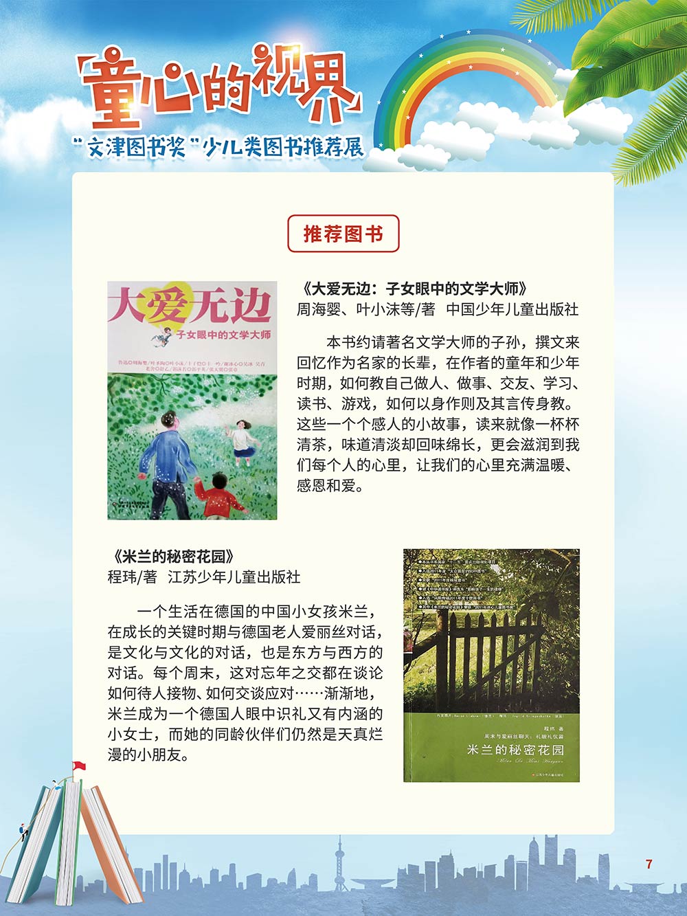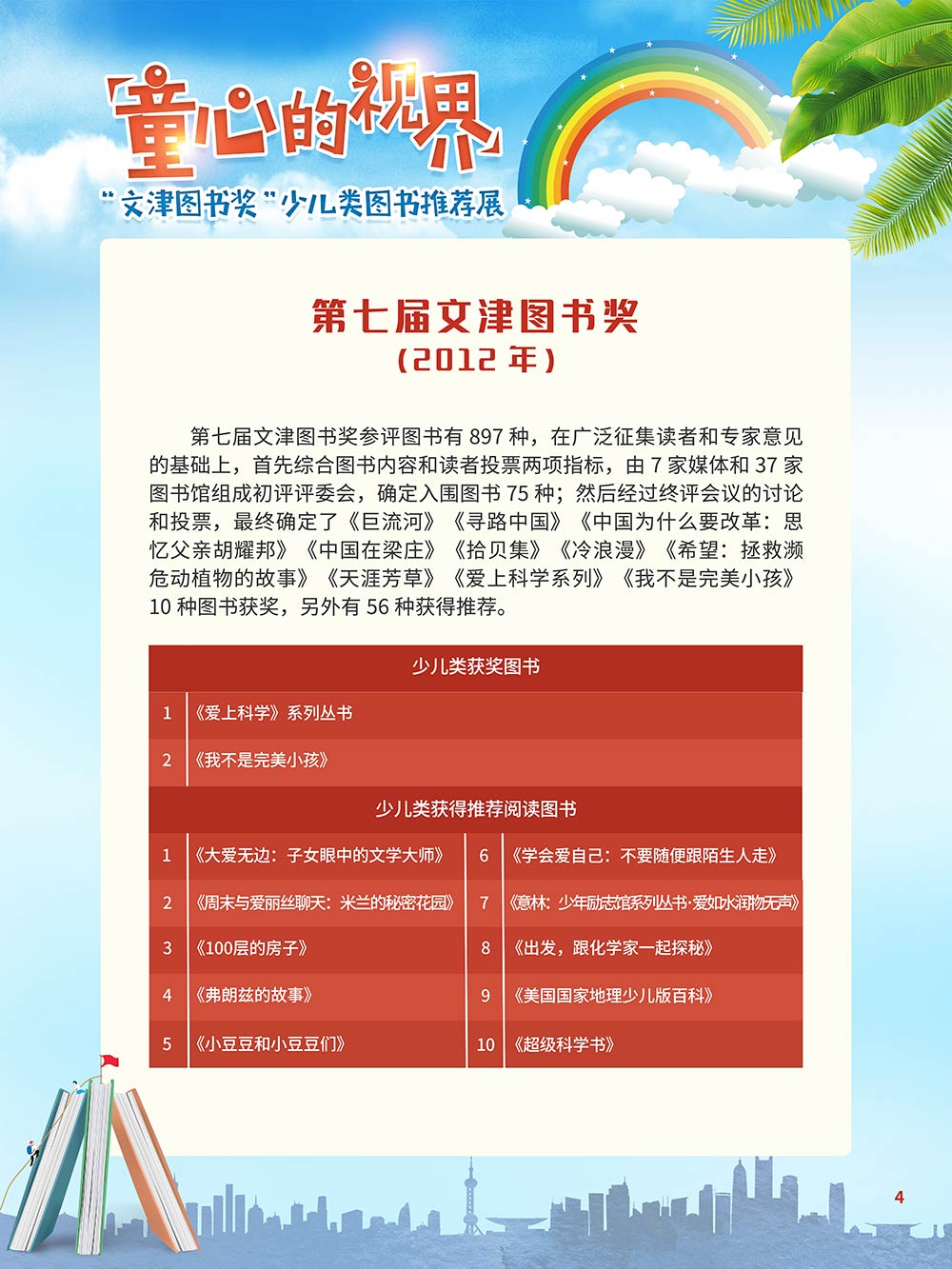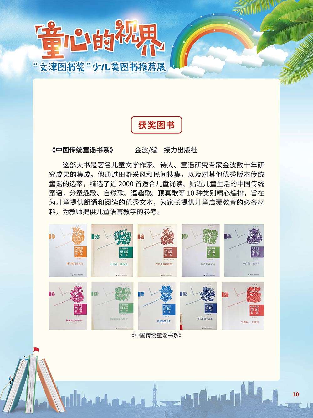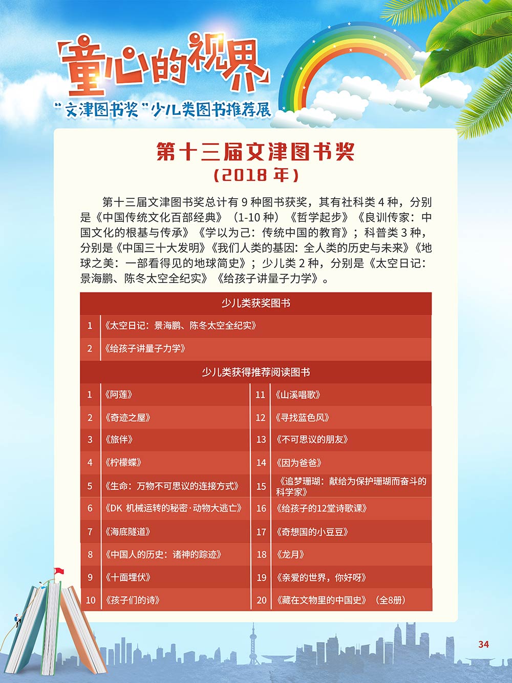 随着生活水平的日益提高,青少年儿童的阅读则更需要人们的引导和关注。特别是在信息爆炸的今天,如何为青少年儿童提供他们感兴趣的,有利于身心健康的、有利于知识增长的书籍,这是一个重要的问题。文津图书奖从2010年第七届开始,每年都会有少儿类图书评选,以及少儿类推荐阅读书籍,这无异于是为少年儿年儿童提供了宝贵的阅读书单。这些书的作者带着童心,以少年儿童的视角创作出来的书籍,更符合少年儿童的阅读和理解,是少年儿童理想的知识宝库。 在全民阅读浪潮席卷全国的今天,少年儿童阅读逐渐成为老师和家长们关注的话题。在儿童节到来之际,我们特别策划了《童心的视界——“文津图书奖”少儿类图书推荐展》,用图文并茂的方式展出第七届“文津图书奖”以来获奖的,或获得推荐阅读的少儿类书籍。优秀的孩子离不开阅读,希望通过这些“文津”好书,能打开孩子们的视野,能在书中领悟大千世界的美妙,能够看到更为广阔的世界,激发孩子们的阅读兴趣,从而享受到阅读的快乐、生活的快乐,争做新时代的好少年!