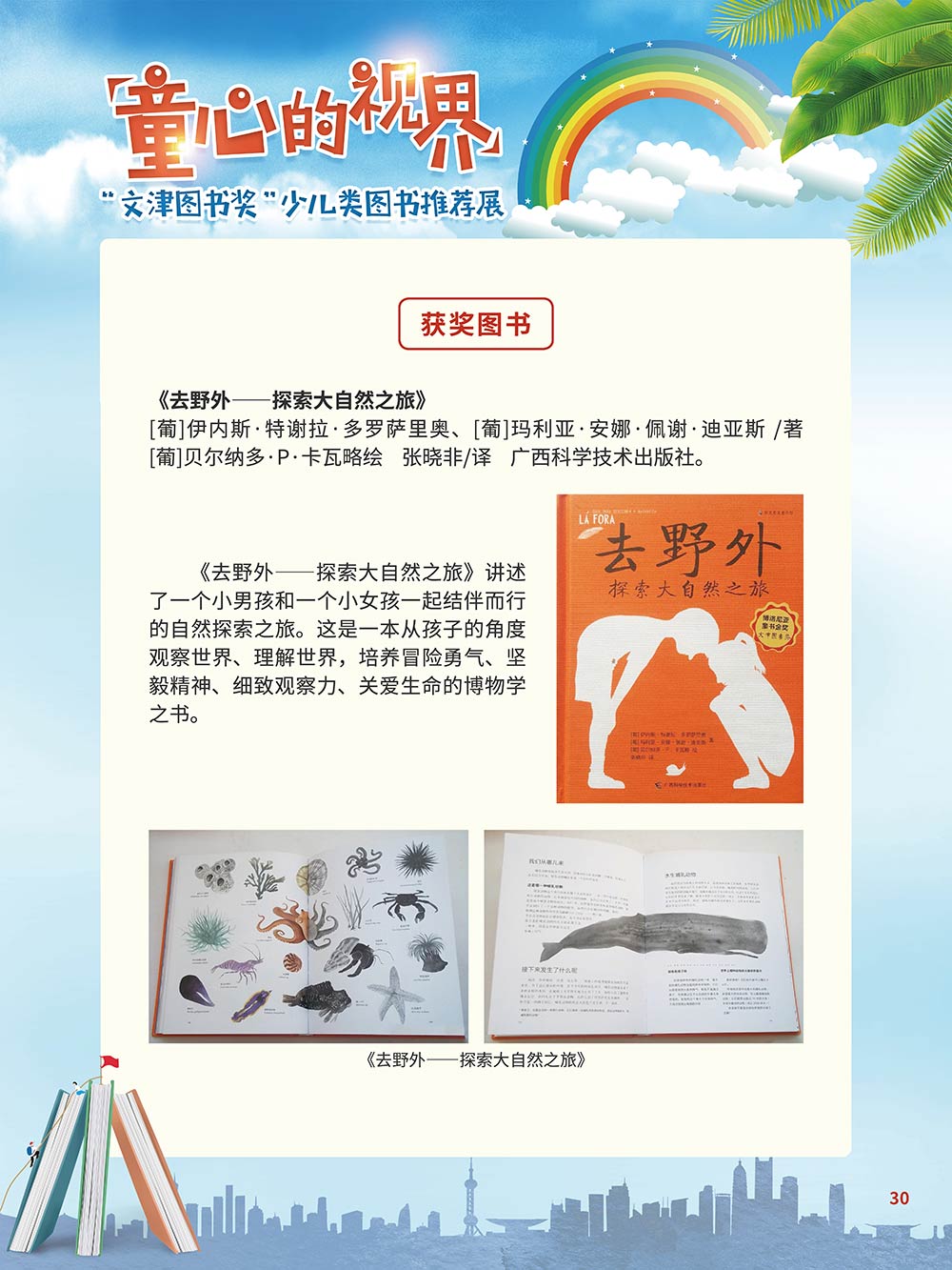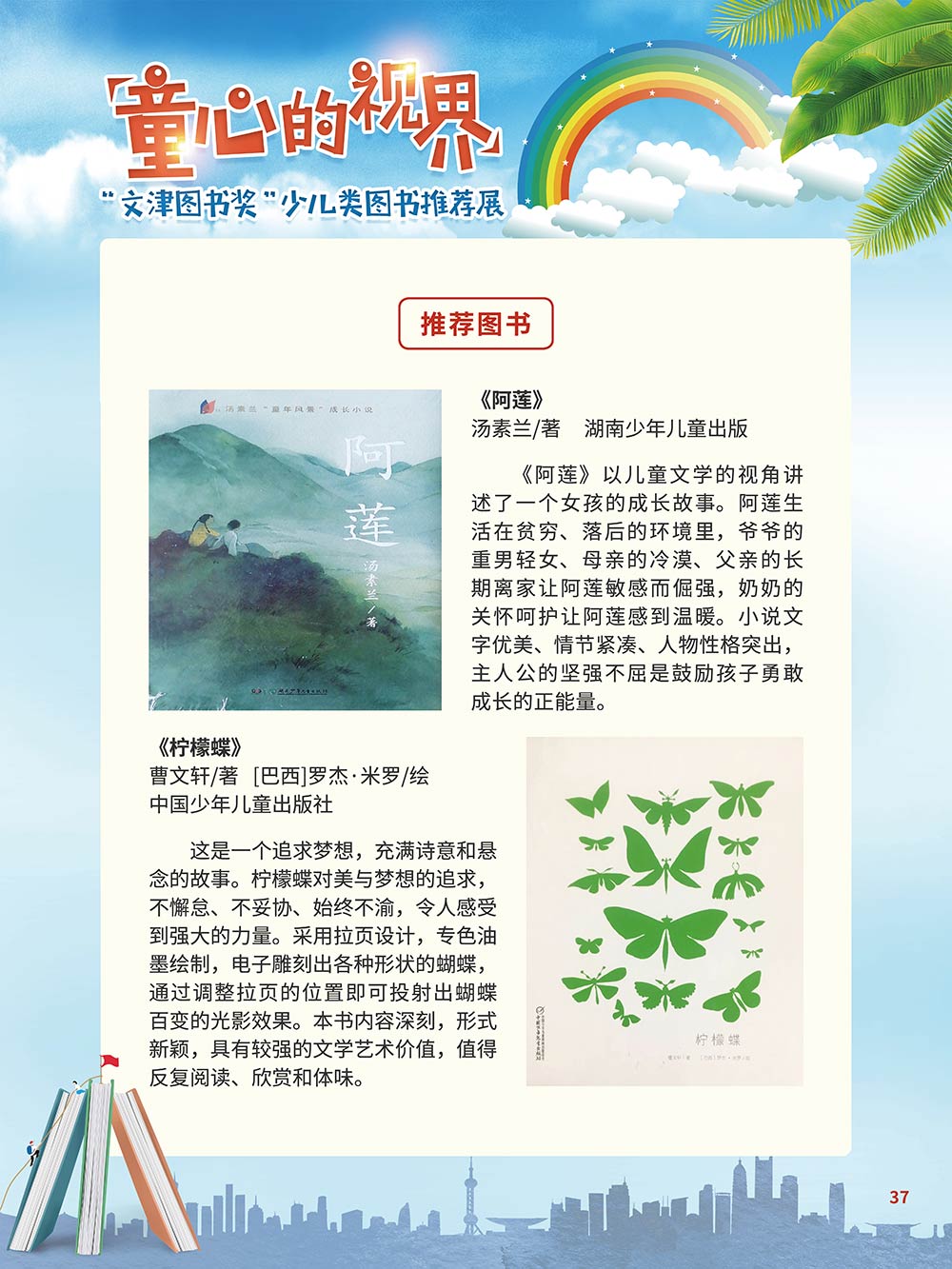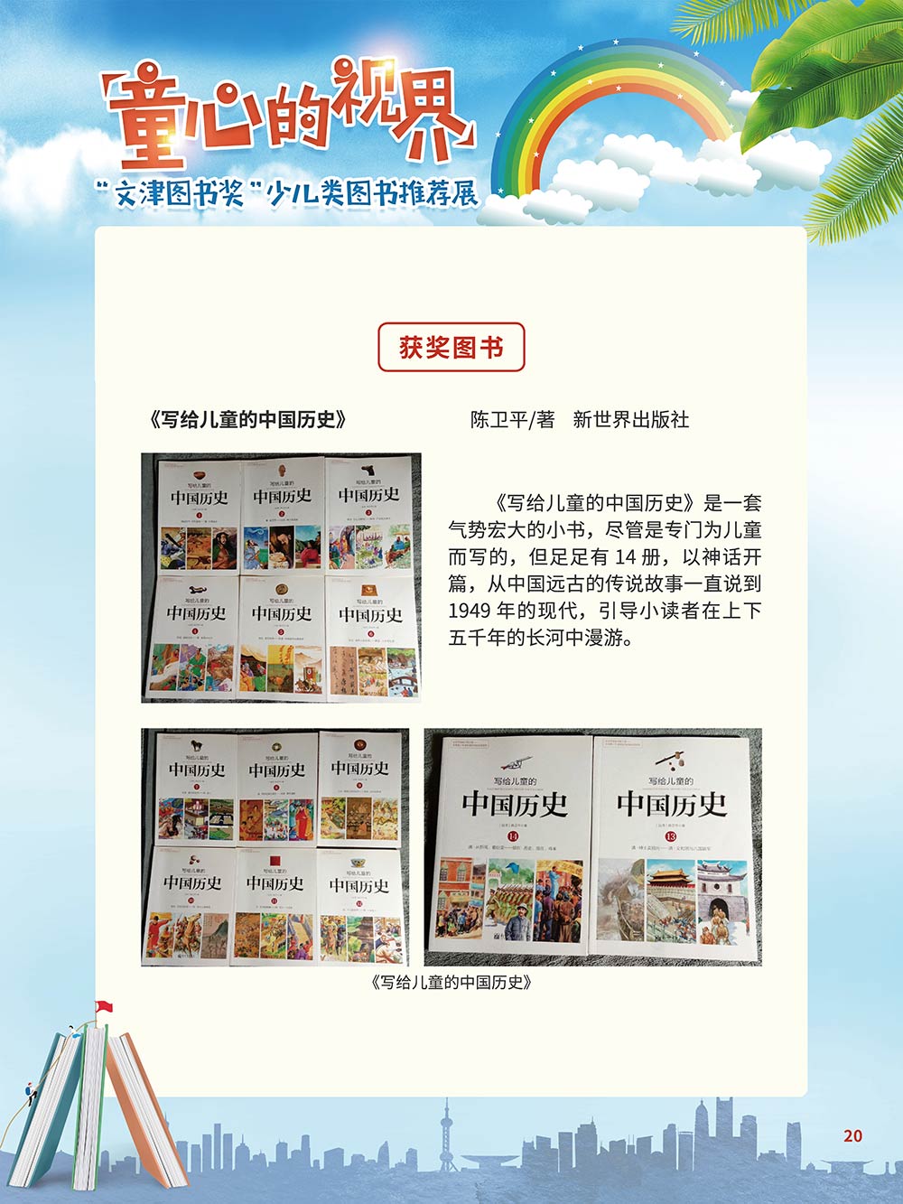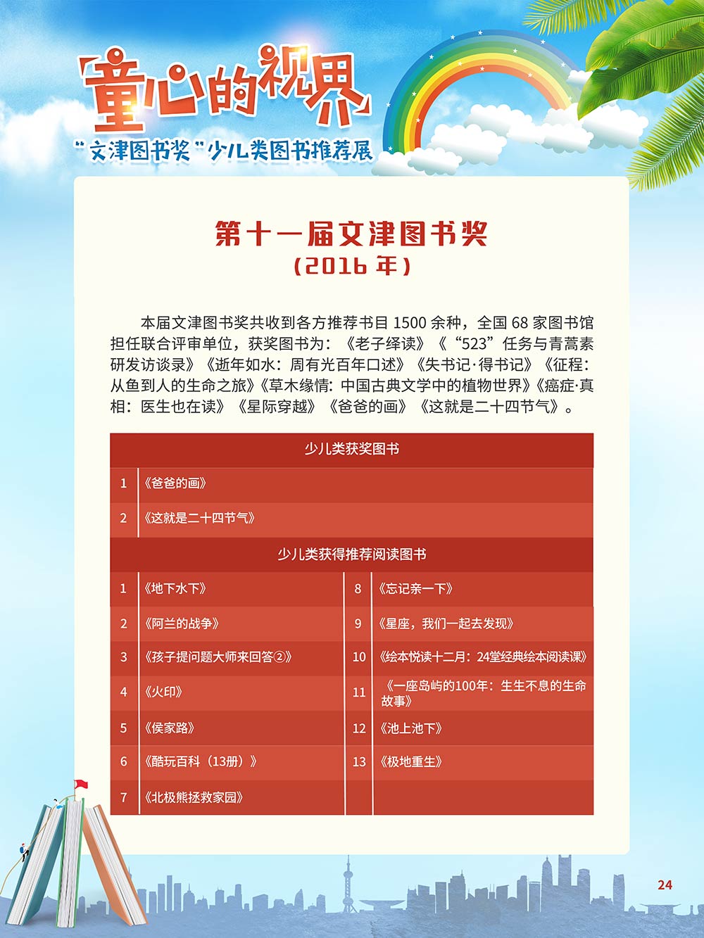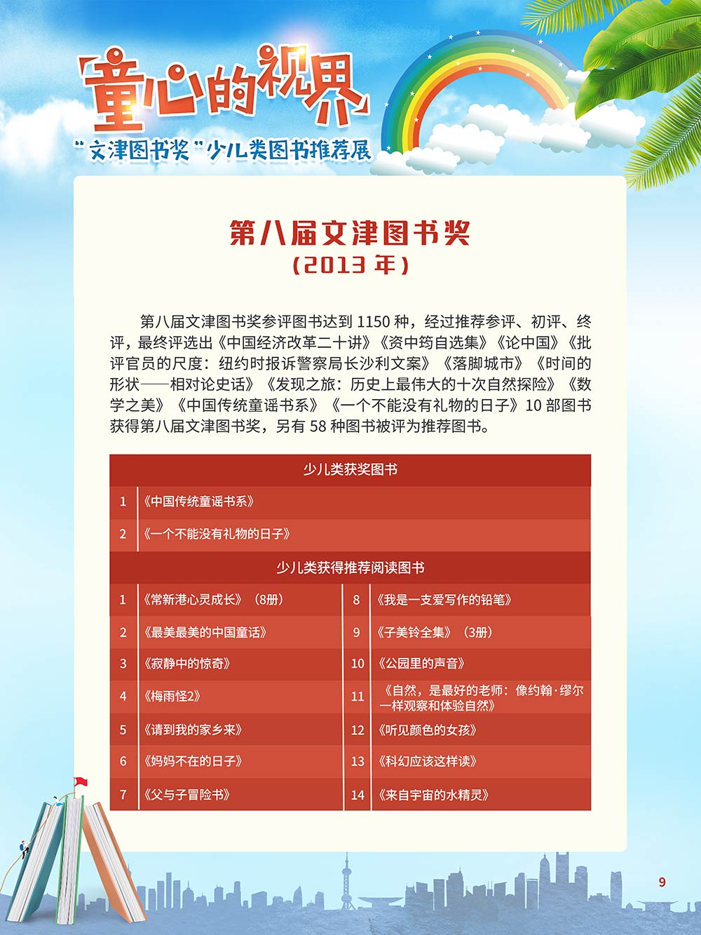 随着生活水平的日益提高,青少年儿童的阅读则更需要人们的引导和关注。特别是在信息爆炸的今天,如何为青少年儿童提供他们感兴趣的,有利于身心健康的、有利于知识增长的书籍,这是一个重要的问题。文津图书奖从2010年第七届开始,每年都会有少儿类图书评选,以及少儿类推荐阅读书籍,这无异于是为少年儿年儿童提供了宝贵的阅读书单。这些书的作者带着童心,以少年儿童的视角创作出来的书籍,更符合少年儿童的阅读和理解,是少年儿童理想的知识宝库。 在全民阅读浪潮席卷全国的今天,少年儿童阅读逐渐成为老师和家长们关注的话题。在儿童节到来之际,我们特别策划了《童心的视界——“文津图书奖”少儿类图书推荐展》,用图文并茂的方式展出第七届“文津图书奖”以来获奖的,或获得推荐阅读的少儿类书籍。优秀的孩子离不开阅读,希望通过这些“文津”好书,能打开孩子们的视野,能在书中领悟大千世界的美妙,能够看到更为广阔的世界,激发孩子们的阅读兴趣,从而享受到阅读的快乐、生活的快乐,争做新时代的好少年!