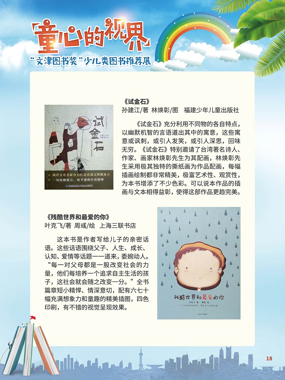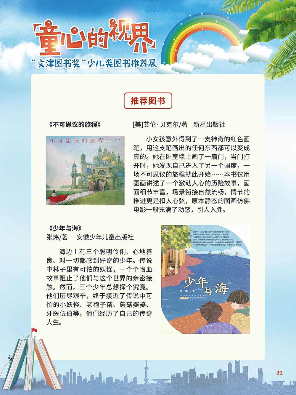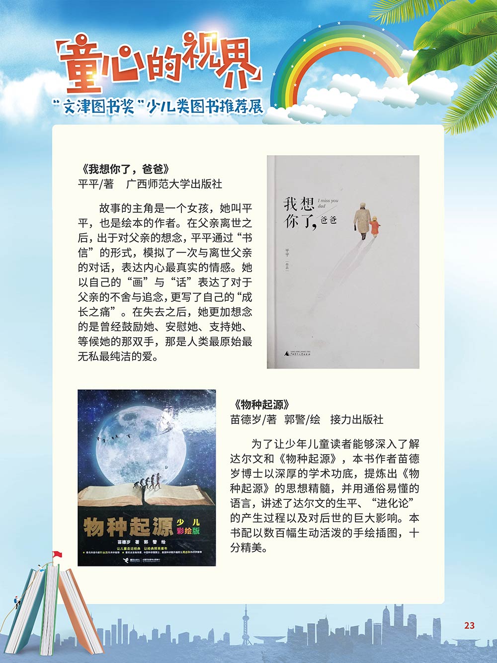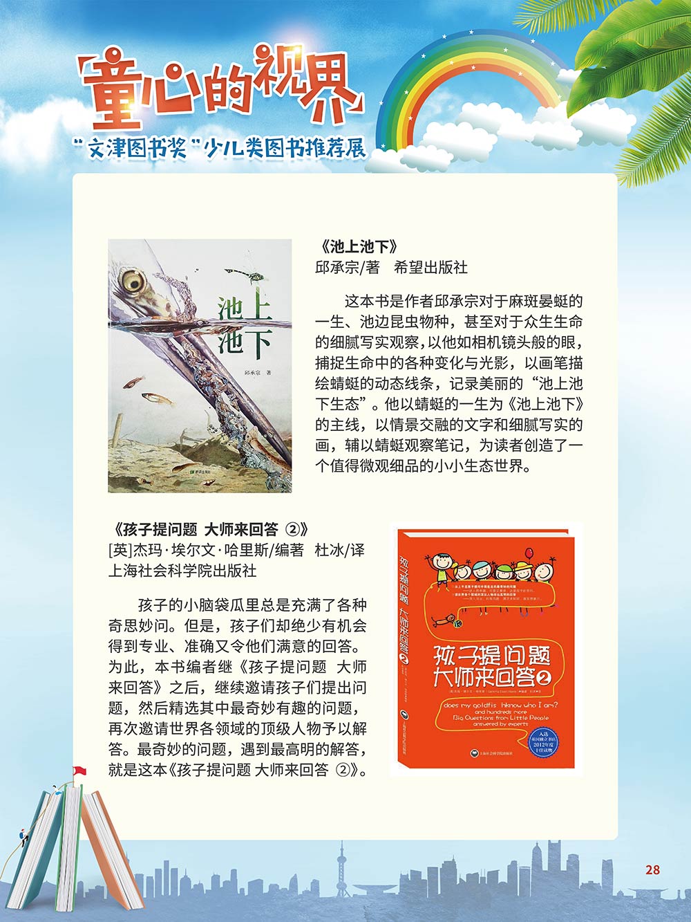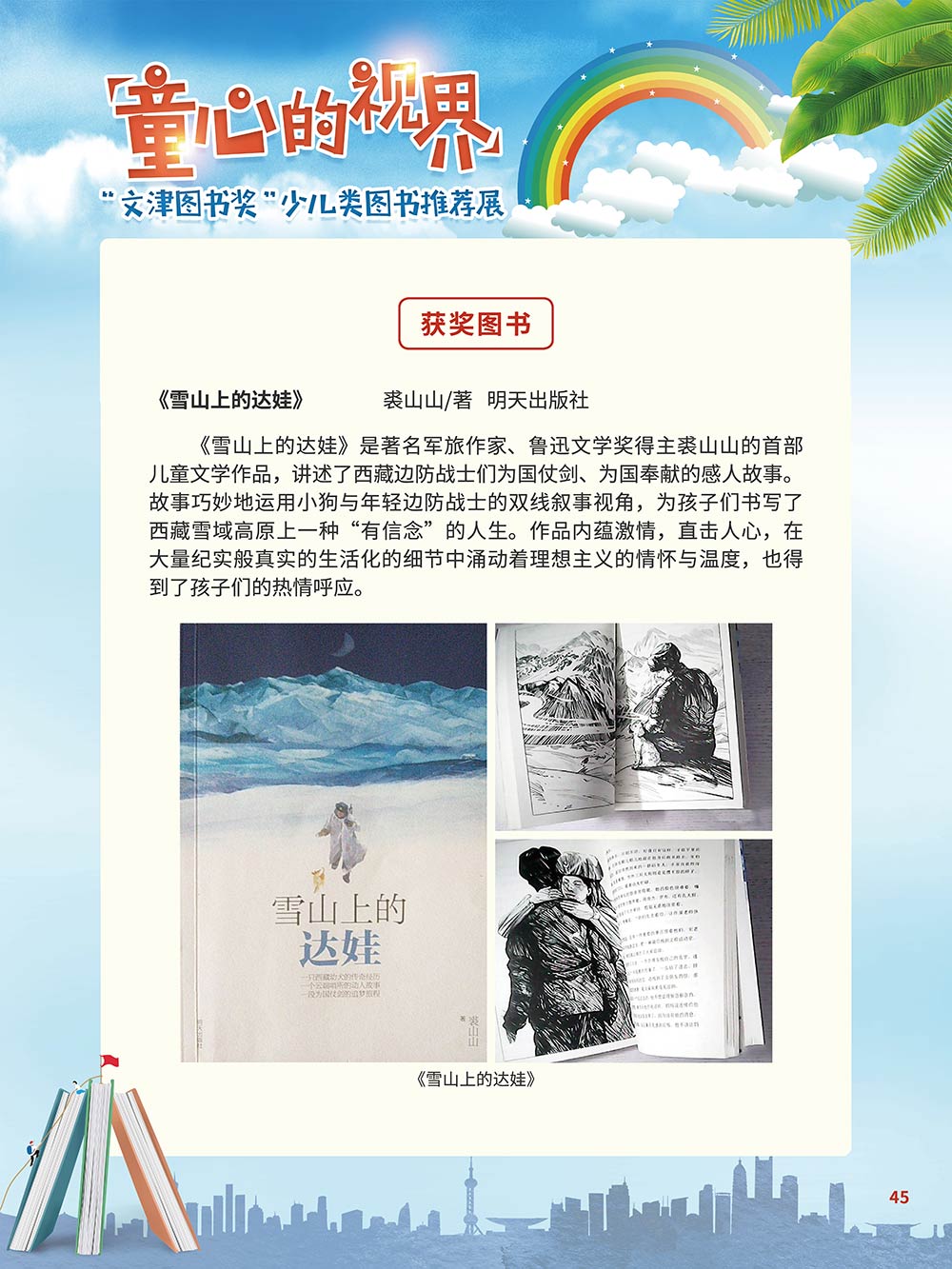 随着生活水平的日益提高,青少年儿童的阅读则更需要人们的引导和关注。特别是在信息爆炸的今天,如何为青少年儿童提供他们感兴趣的,有利于身心健康的、有利于知识增长的书籍,这是一个重要的问题。文津图书奖从2010年第七届开始,每年都会有少儿类图书评选,以及少儿类推荐阅读书籍,这无异于是为少年儿年儿童提供了宝贵的阅读书单。这些书的作者带着童心,以少年儿童的视角创作出来的书籍,更符合少年儿童的阅读和理解,是少年儿童理想的知识宝库。 在全民阅读浪潮席卷全国的今天,少年儿童阅读逐渐成为老师和家长们关注的话题。在儿童节到来之际,我们特别策划了《童心的视界——“文津图书奖”少儿类图书推荐展》,用图文并茂的方式展出第七届“文津图书奖”以来获奖的,或获得推荐阅读的少儿类书籍。优秀的孩子离不开阅读,希望通过这些“文津”好书,能打开孩子们的视野,能在书中领悟大千世界的美妙,能够看到更为广阔的世界,激发孩子们的阅读兴趣,从而享受到阅读的快乐、生活的快乐,争做新时代的好少年!