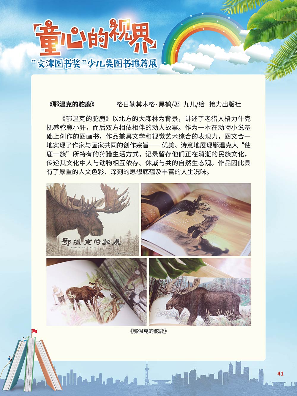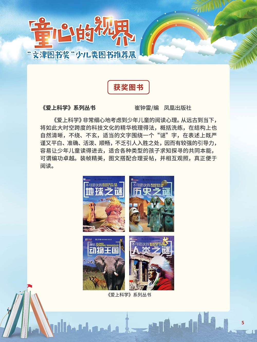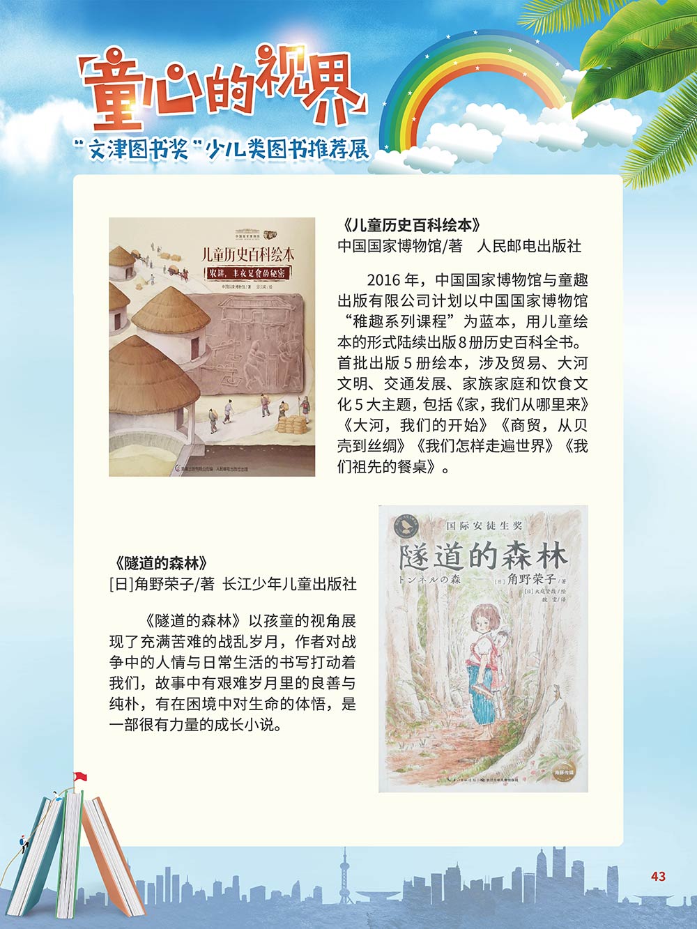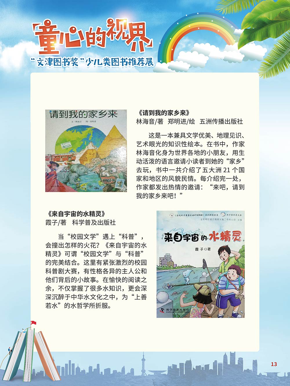 随着生活水平的日益提高,青少年儿童的阅读则更需要人们的引导和关注。特别是在信息爆炸的今天,如何为青少年儿童提供他们感兴趣的,有利于身心健康的、有利于知识增长的书籍,这是一个重要的问题。文津图书奖从2010年第七届开始,每年都会有少儿类图书评选,以及少儿类推荐阅读书籍,这无异于是为少年儿年儿童提供了宝贵的阅读书单。这些书的作者带着童心,以少年儿童的视角创作出来的书籍,更符合少年儿童的阅读和理解,是少年儿童理想的知识宝库。 在全民阅读浪潮席卷全国的今天,少年儿童阅读逐渐成为老师和家长们关注的话题。在儿童节到来之际,我们特别策划了《童心的视界——“文津图书奖”少儿类图书推荐展》,用图文并茂的方式展出第七届“文津图书奖”以来获奖的,或获得推荐阅读的少儿类书籍。优秀的孩子离不开阅读,希望通过这些“文津”好书,能打开孩子们的视野,能在书中领悟大千世界的美妙,能够看到更为广阔的世界,激发孩子们的阅读兴趣,从而享受到阅读的快乐、生活的快乐,争做新时代的好少年!