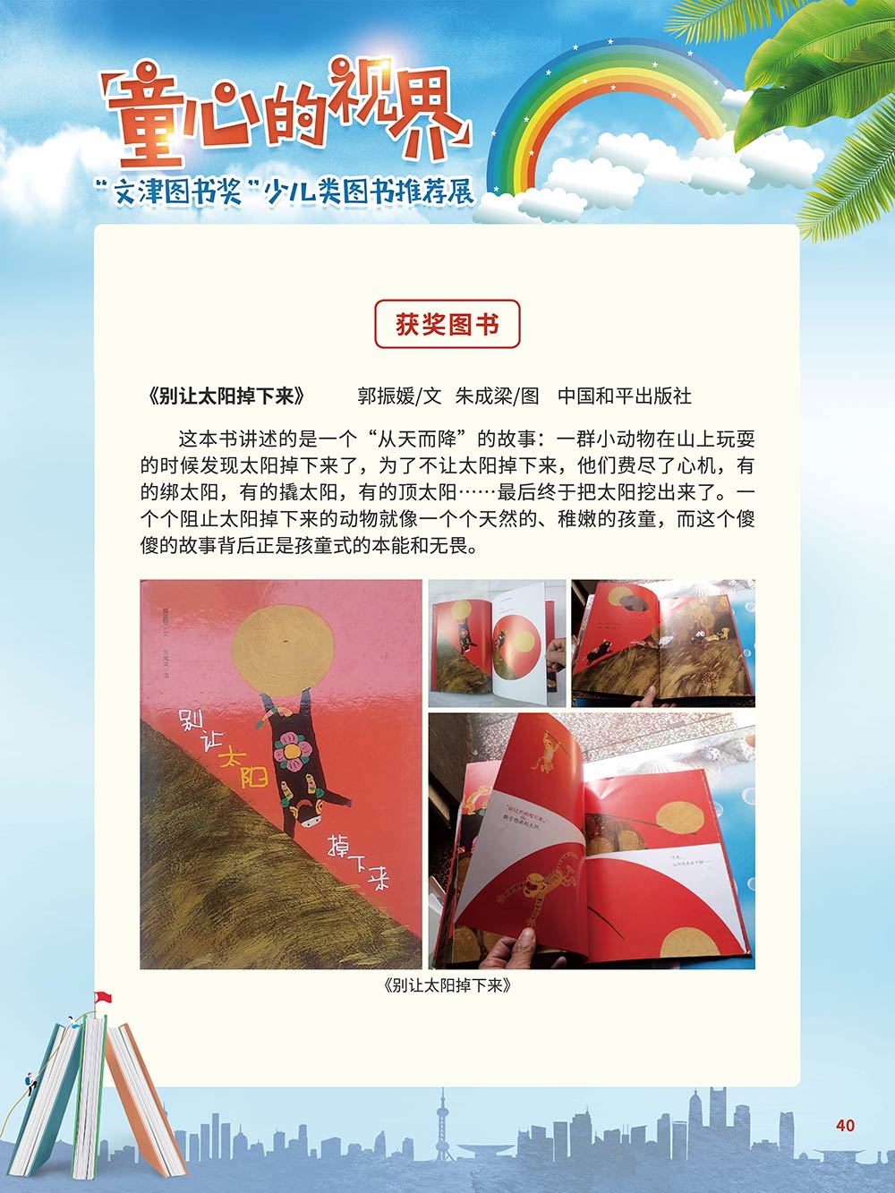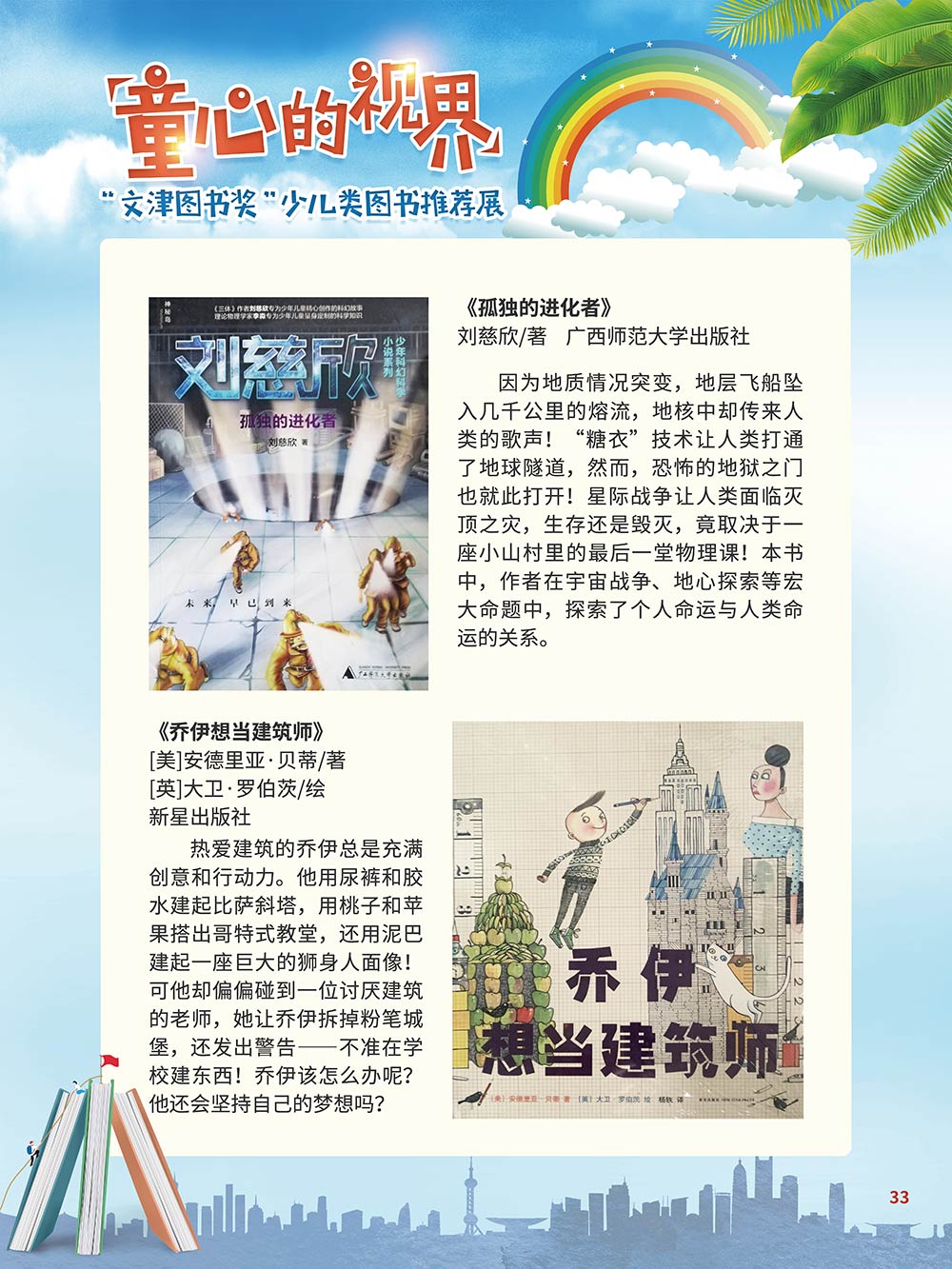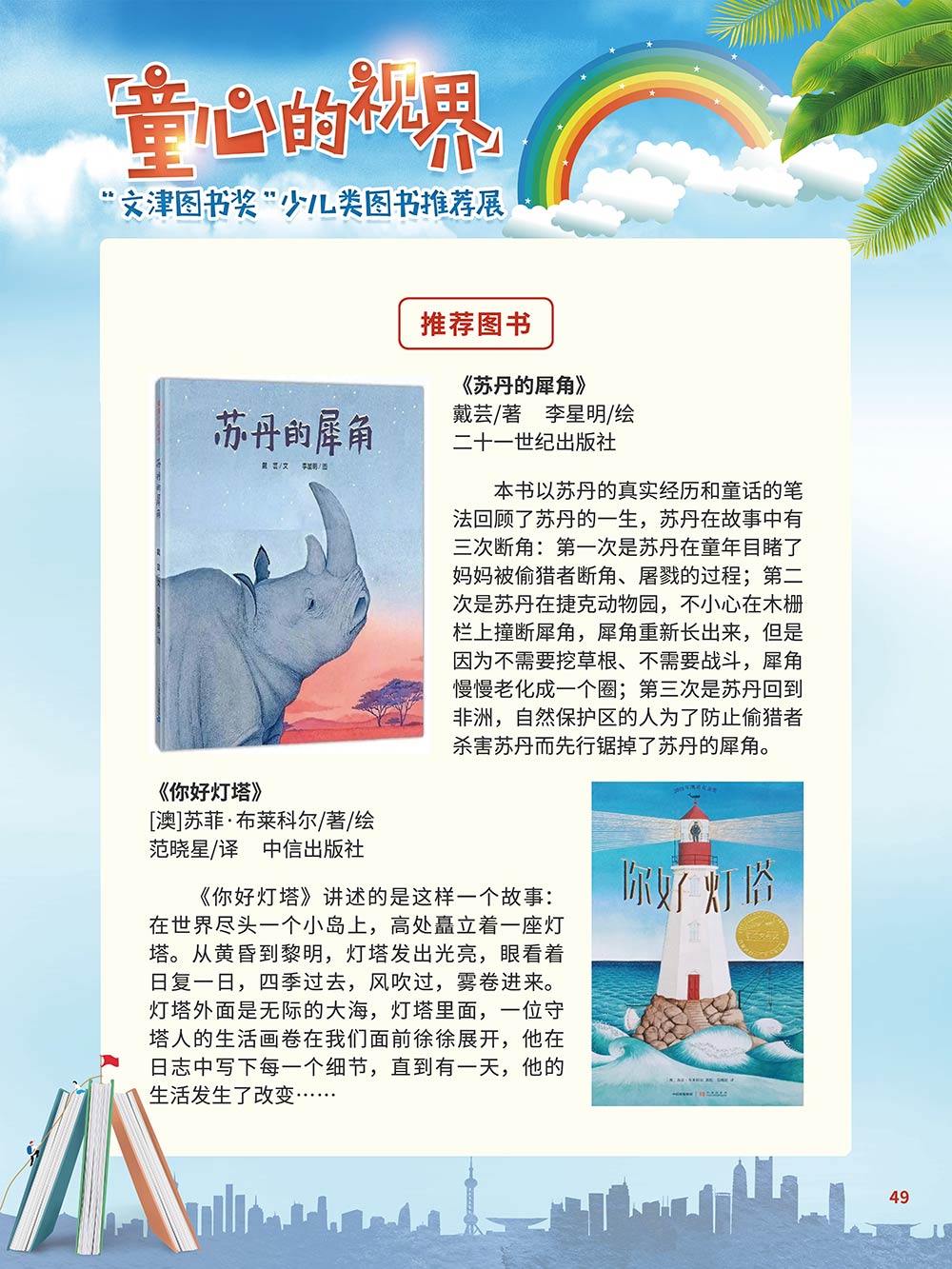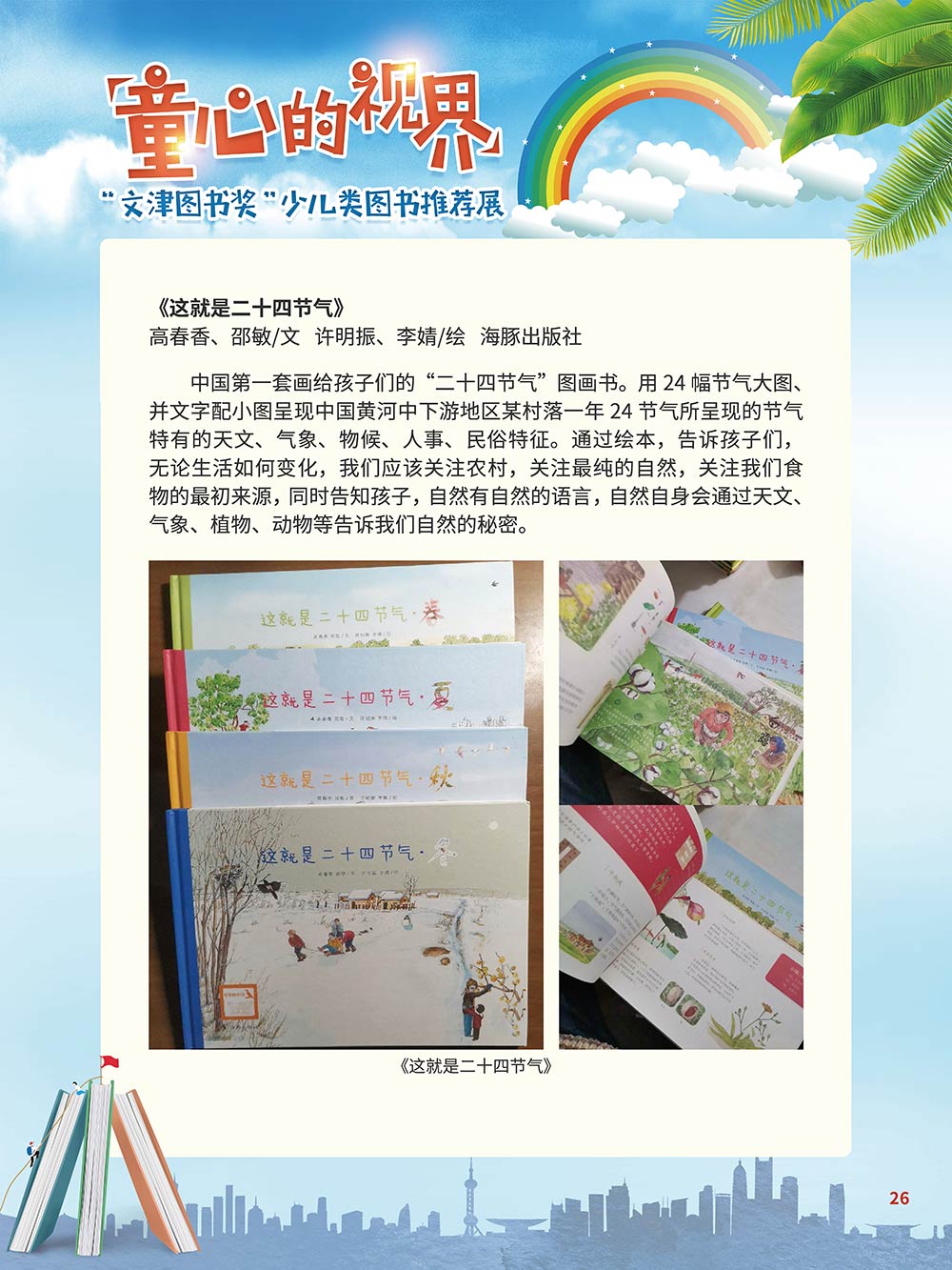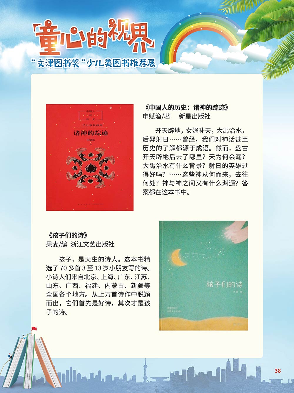 随着生活水平的日益提高,青少年儿童的阅读则更需要人们的引导和关注。特别是在信息爆炸的今天,如何为青少年儿童提供他们感兴趣的,有利于身心健康的、有利于知识增长的书籍,这是一个重要的问题。文津图书奖从2010年第七届开始,每年都会有少儿类图书评选,以及少儿类推荐阅读书籍,这无异于是为少年儿年儿童提供了宝贵的阅读书单。这些书的作者带着童心,以少年儿童的视角创作出来的书籍,更符合少年儿童的阅读和理解,是少年儿童理想的知识宝库。 在全民阅读浪潮席卷全国的今天,少年儿童阅读逐渐成为老师和家长们关注的话题。在儿童节到来之际,我们特别策划了《童心的视界——“文津图书奖”少儿类图书推荐展》,用图文并茂的方式展出第七届“文津图书奖”以来获奖的,或获得推荐阅读的少儿类书籍。优秀的孩子离不开阅读,希望通过这些“文津”好书,能打开孩子们的视野,能在书中领悟大千世界的美妙,能够看到更为广阔的世界,激发孩子们的阅读兴趣,从而享受到阅读的快乐、生活的快乐,争做新时代的好少年!