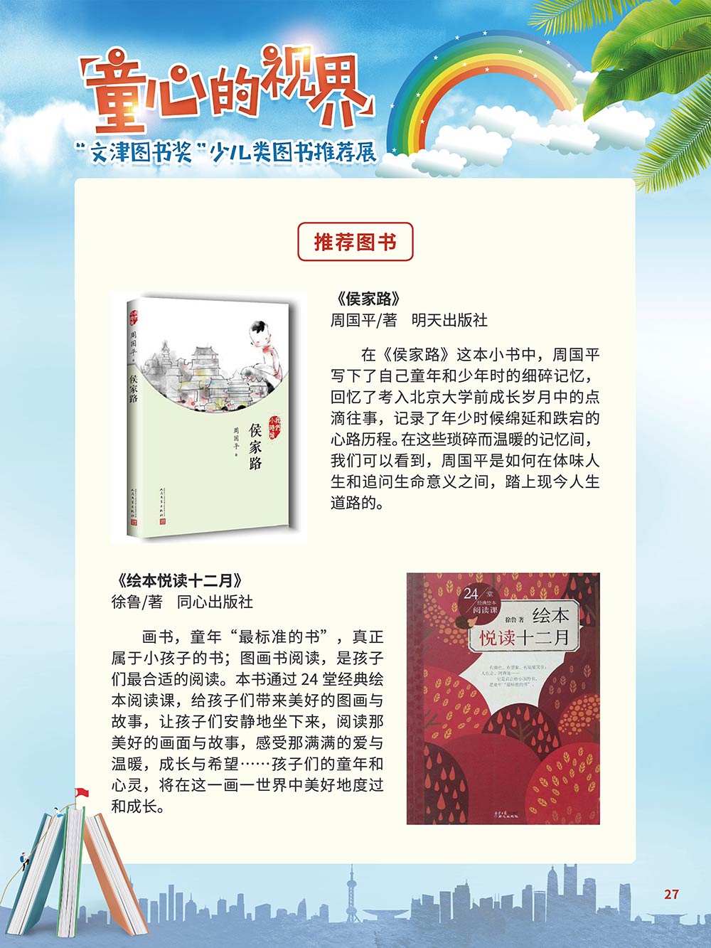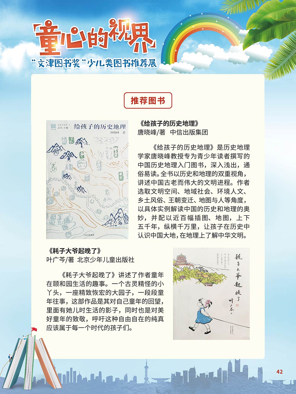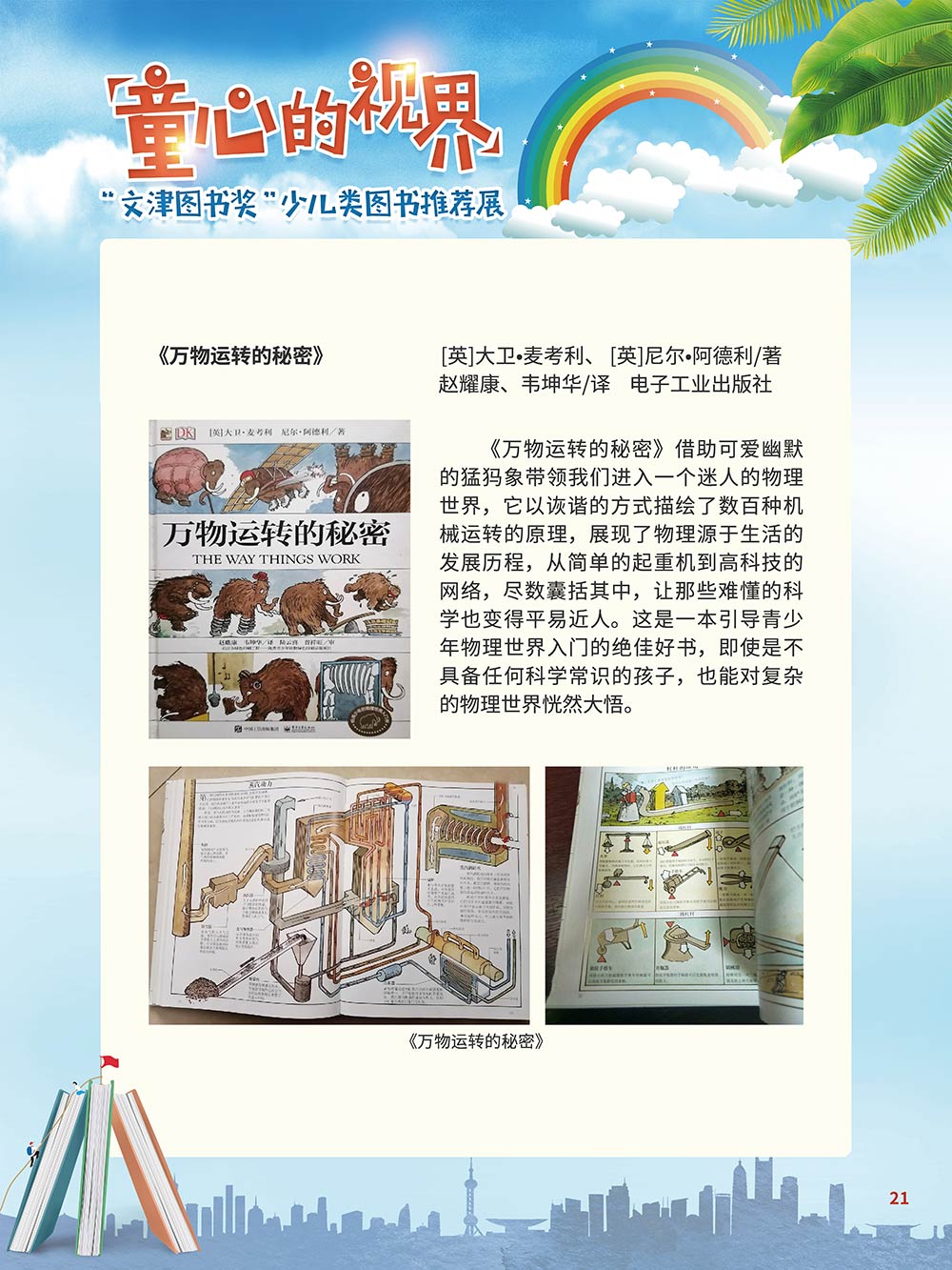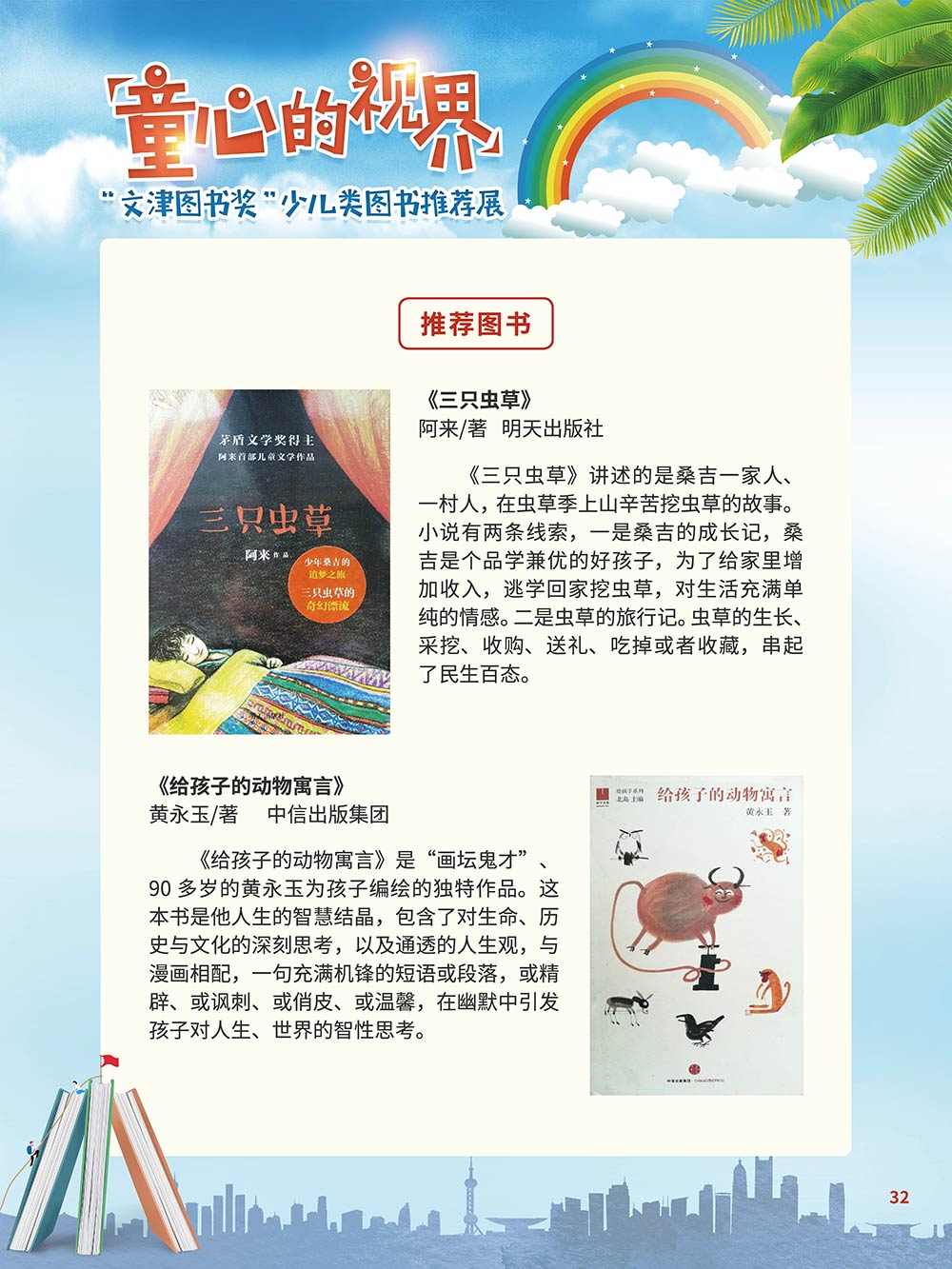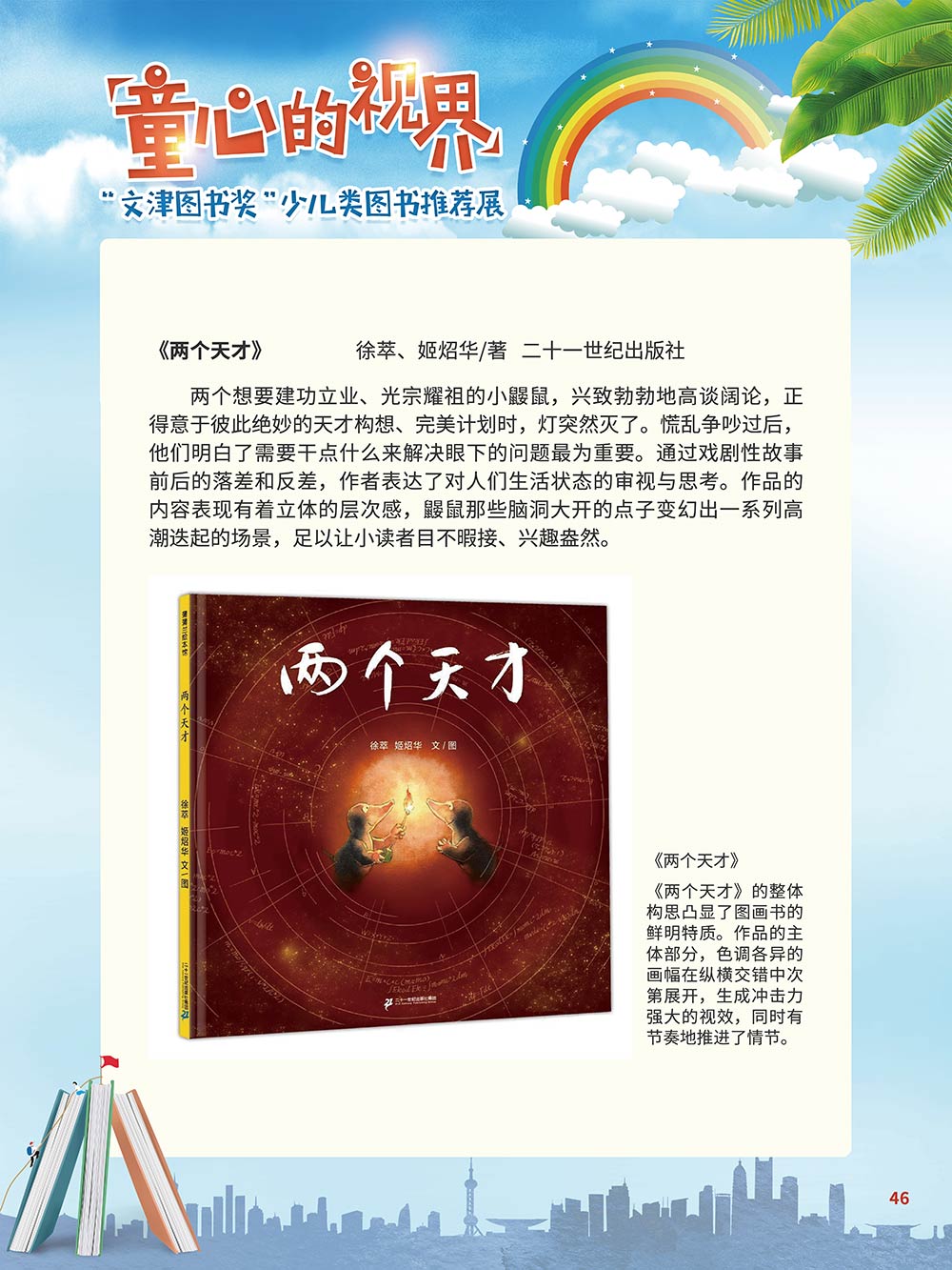随着生活水平的日益提高,青少年儿童的阅读则更需要人们的引导和关注。特别是在信息爆炸的今天,如何为青少年儿童提供他们感兴趣的,有利于身心健康的、有利于知识增长的书籍,这是一个重要的问题。文津图书奖从2010年第七届开始,每年都会有少儿类图书评选,以及少儿类推荐阅读书籍,这无异于是为少年儿年儿童提供了宝贵的阅读书单。这些书的作者带着童心,以少年儿童的视角创作出来的书籍,更符合少年儿童的阅读和理解,是少年儿童理想的知识宝库。 在全民阅读浪潮席卷全国的今天,少年儿童阅读逐渐成为老师和家长们关注的话题。在儿童节到来之际,我们特别策划了《童心的视界——“文津图书奖”少儿类图书推荐展》,用图文并茂的方式展出第七届“文津图书奖”以来获奖的,或获得推荐阅读的少儿类书籍。优秀的孩子离不开阅读,希望通过这些“文津”好书,能打开孩子们的视野,能在书中领悟大千世界的美妙,能够看到更为广阔的世界,激发孩子们的阅读兴趣,从而享受到阅读的快乐、生活的快乐,争做新时代的好少年!