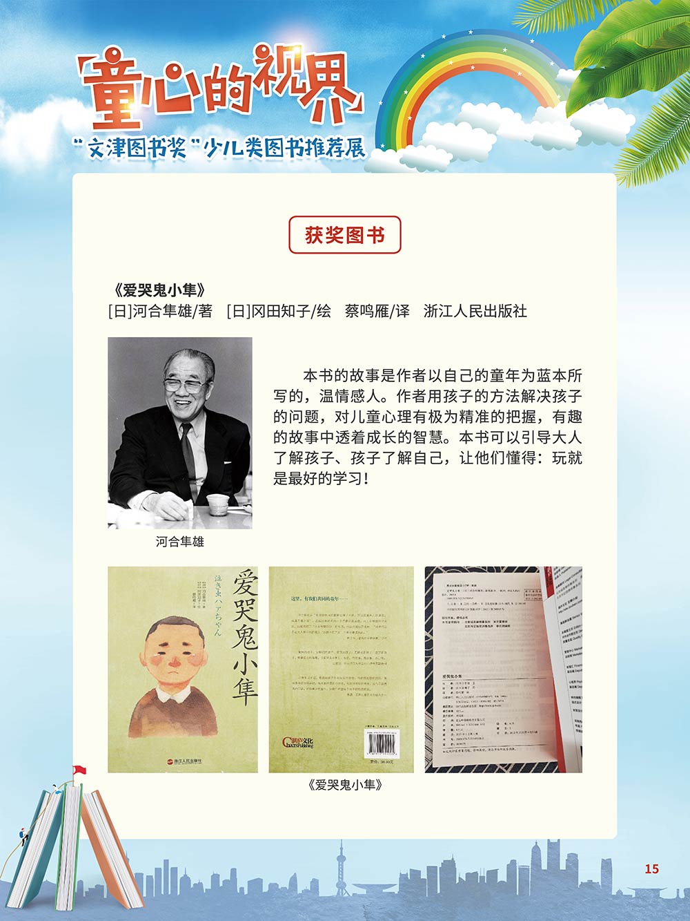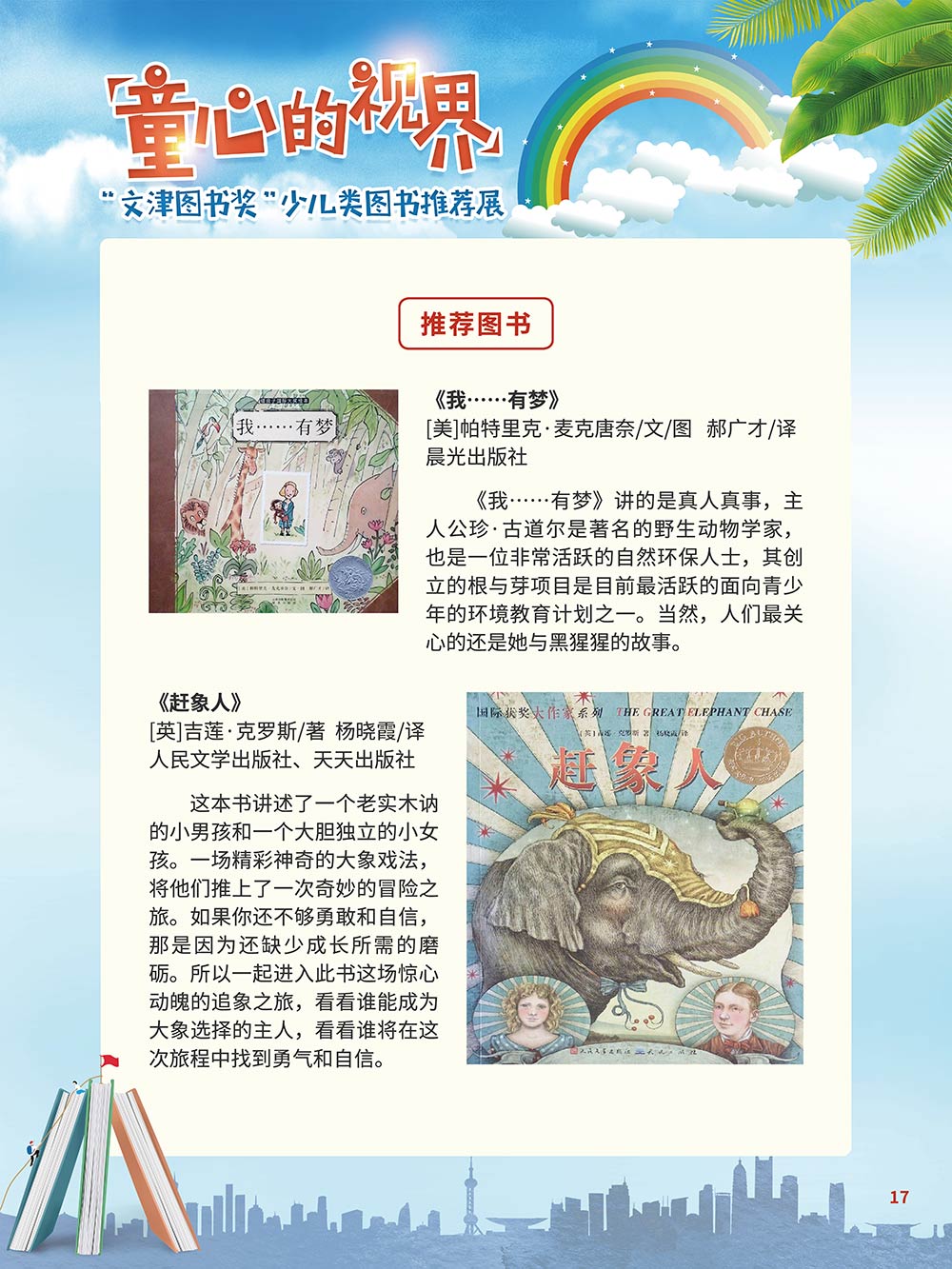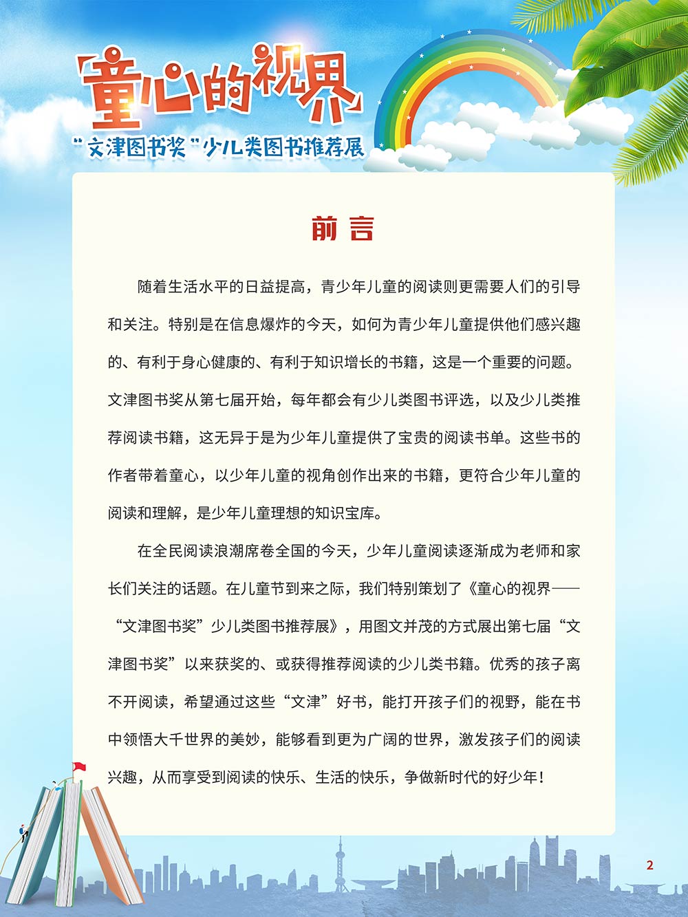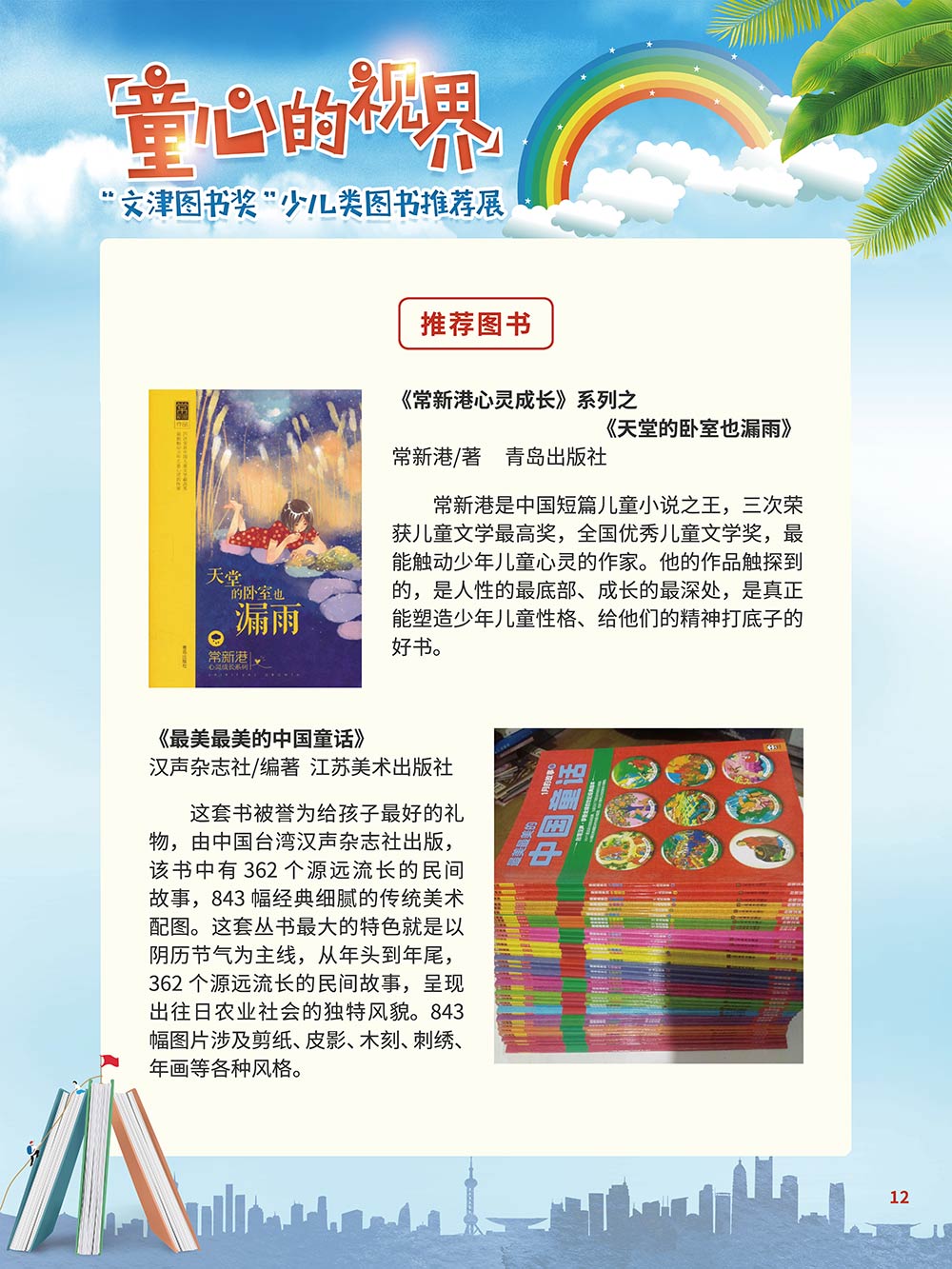 随着生活水平的日益提高,青少年儿童的阅读则更需要人们的引导和关注。特别是在信息爆炸的今天,如何为青少年儿童提供他们感兴趣的,有利于身心健康的、有利于知识增长的书籍,这是一个重要的问题。文津图书奖从2010年第七届开始,每年都会有少儿类图书评选,以及少儿类推荐阅读书籍,这无异于是为少年儿年儿童提供了宝贵的阅读书单。这些书的作者带着童心,以少年儿童的视角创作出来的书籍,更符合少年儿童的阅读和理解,是少年儿童理想的知识宝库。 在全民阅读浪潮席卷全国的今天,少年儿童阅读逐渐成为老师和家长们关注的话题。在儿童节到来之际,我们特别策划了《童心的视界——“文津图书奖”少儿类图书推荐展》,用图文并茂的方式展出第七届“文津图书奖”以来获奖的,或获得推荐阅读的少儿类书籍。优秀的孩子离不开阅读,希望通过这些“文津”好书,能打开孩子们的视野,能在书中领悟大千世界的美妙,能够看到更为广阔的世界,激发孩子们的阅读兴趣,从而享受到阅读的快乐、生活的快乐,争做新时代的好少年!