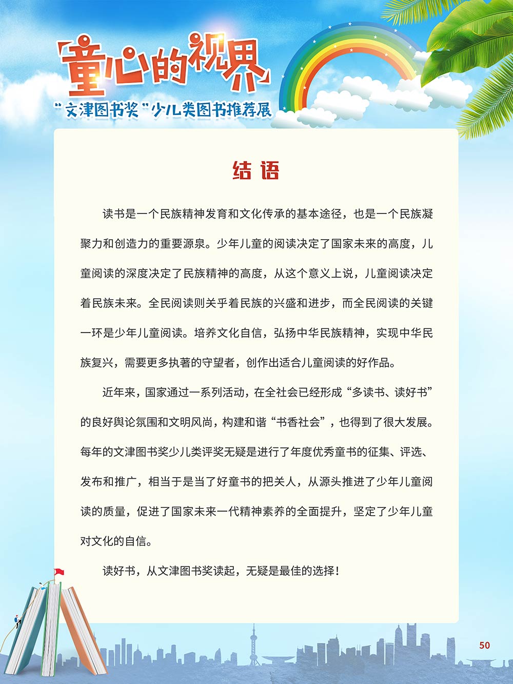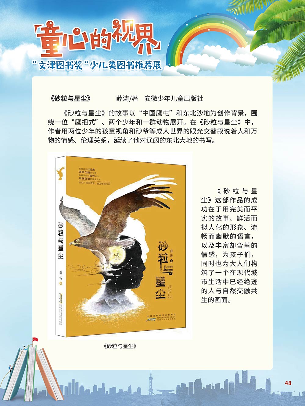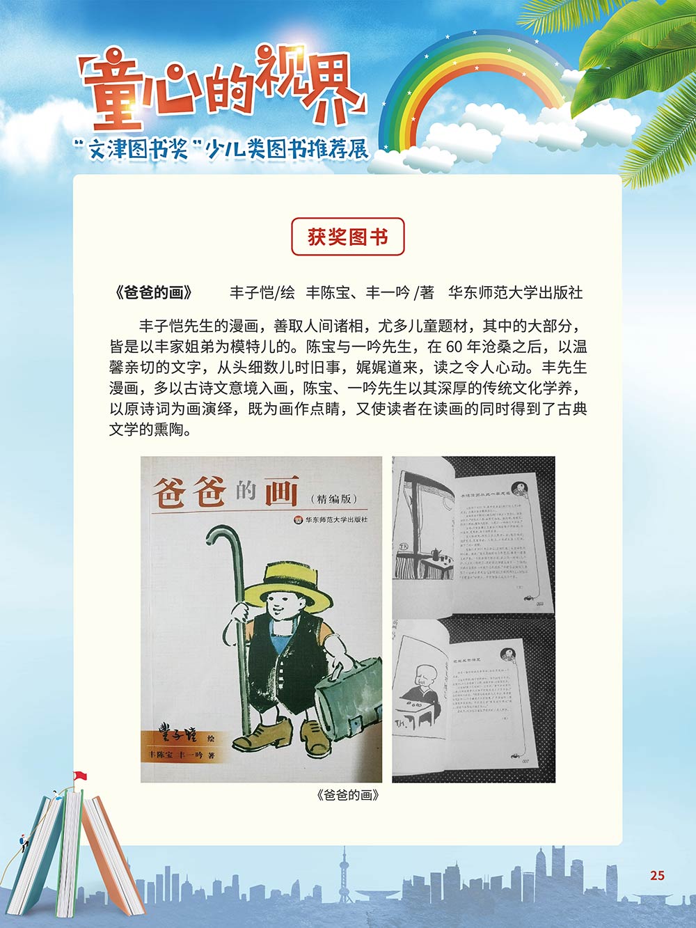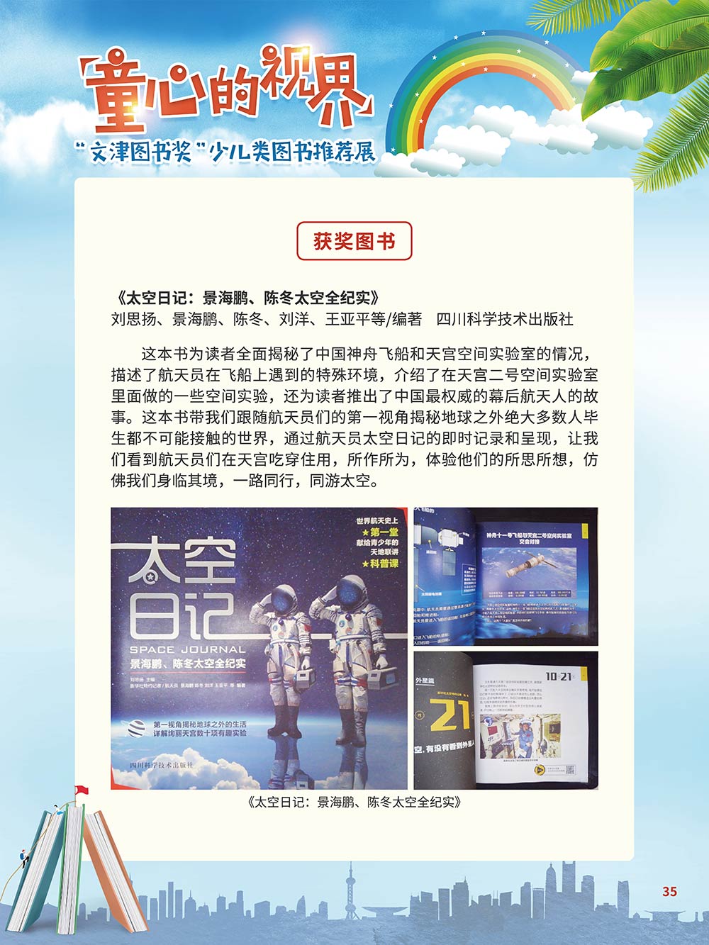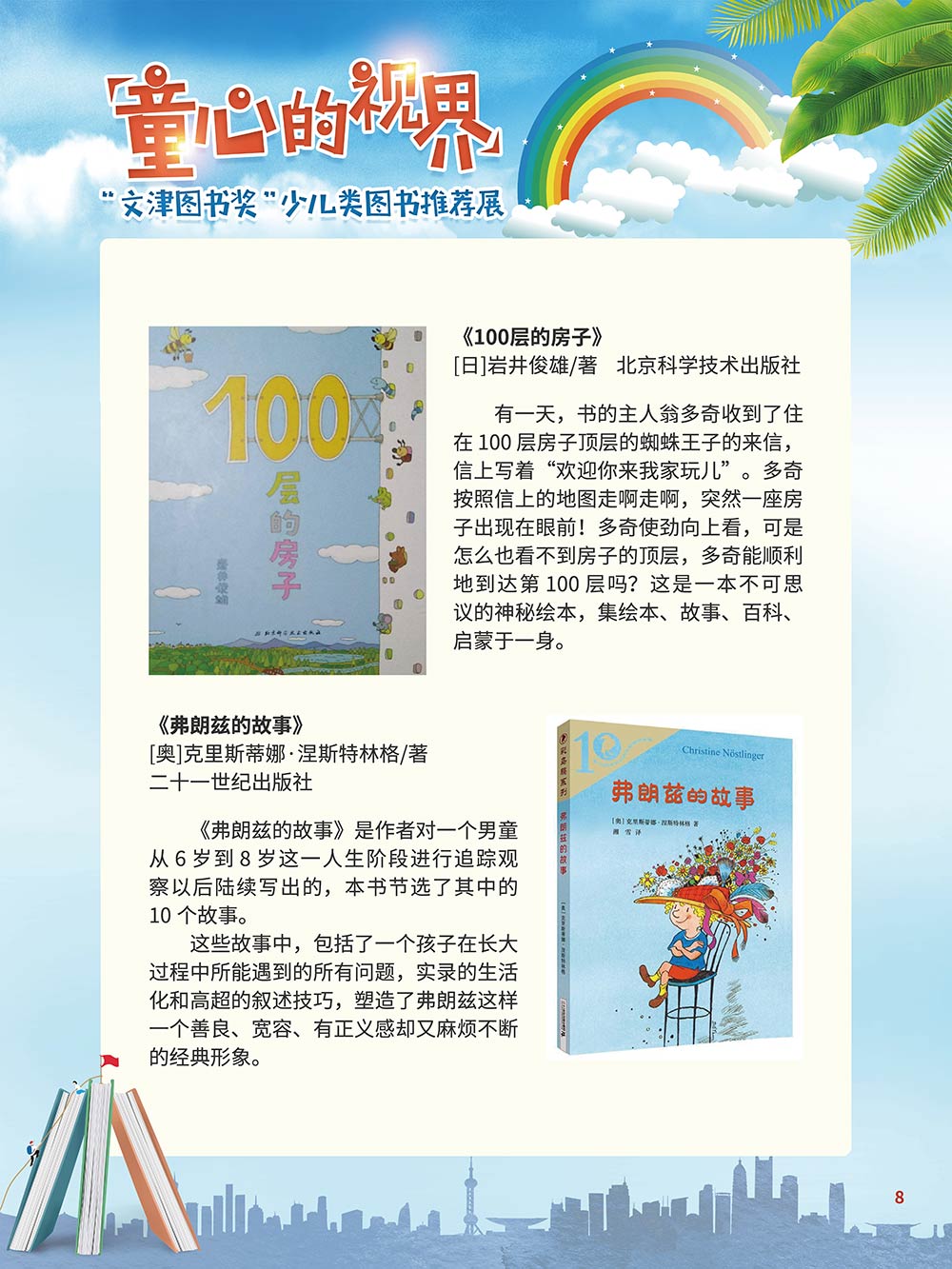 随着生活水平的日益提高,青少年儿童的阅读则更需要人们的引导和关注。特别是在信息爆炸的今天,如何为青少年儿童提供他们感兴趣的,有利于身心健康的、有利于知识增长的书籍,这是一个重要的问题。文津图书奖从2010年第七届开始,每年都会有少儿类图书评选,以及少儿类推荐阅读书籍,这无异于是为少年儿年儿童提供了宝贵的阅读书单。这些书的作者带着童心,以少年儿童的视角创作出来的书籍,更符合少年儿童的阅读和理解,是少年儿童理想的知识宝库。 在全民阅读浪潮席卷全国的今天,少年儿童阅读逐渐成为老师和家长们关注的话题。在儿童节到来之际,我们特别策划了《童心的视界——“文津图书奖”少儿类图书推荐展》,用图文并茂的方式展出第七届“文津图书奖”以来获奖的,或获得推荐阅读的少儿类书籍。优秀的孩子离不开阅读,希望通过这些“文津”好书,能打开孩子们的视野,能在书中领悟大千世界的美妙,能够看到更为广阔的世界,激发孩子们的阅读兴趣,从而享受到阅读的快乐、生活的快乐,争做新时代的好少年!