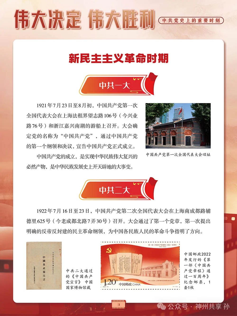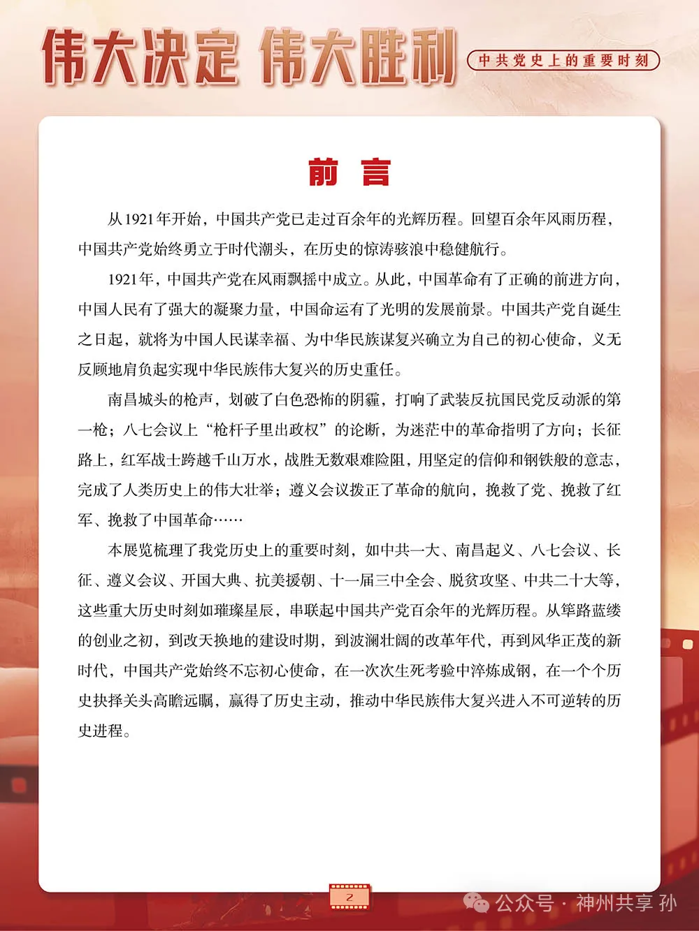 内容简介 1921年,中国共产党在风雨飘摇中成立。从此,中国革命有了正确的前进方向,中国人民有了强大的凝聚力量,中国命运有了光明的发展前景。中国共产党自诞生之日起,就将为中国人民谋幸福、为中华民族谋复兴确立为自己的初心使命,义无反顾地肩负起实现中华民族伟大复兴的历史重任。 本展览梳理了我党历史上的重要时刻,如中共一大、南昌起义、八七会议、长征、遵义会议、开国大典、抗美援朝、十一届三中全会、脱贫攻坚、中共二十大等,这些重大历史时刻如璀璨星辰,串联起中国共产党百余年的光辉历程。从筚路蓝缕的创业之初,到改天换地的建设时期,到波澜壮阔的改革年代,再到风华正茂的新时代,中国共产党始终不忘初心使命,在一次次生死考验中淬炼成钢,在一个个历史抉择关头高瞻远瞩,赢得了历史主动,推动中华民族伟大复兴进入不可逆转的历史进程。 点击链接“https://www.720yun.com/vr/427jtdwaru0?sessionid=1150129370”观看“伟大决定 伟大胜利——中共党史上的重要时刻”AI智慧云展厅