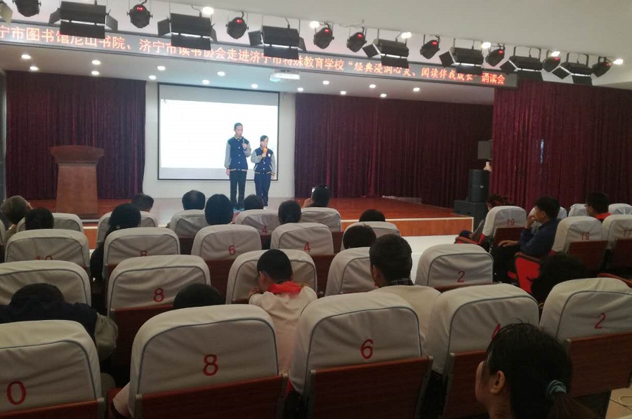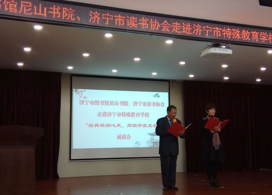 4月18日下午,为迎接第23个世界读书日,促进全民阅读,济宁市图书馆尼山书院联合济宁市广播电视播音主持协会、济宁市读书协会、济宁市一又企划咨询公司特别策划了一场“经典浸润心灵、阅读伴我成长——走进济宁市特殊教育学校”朗诵会。