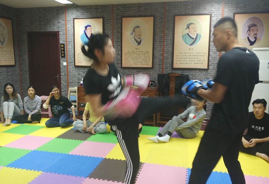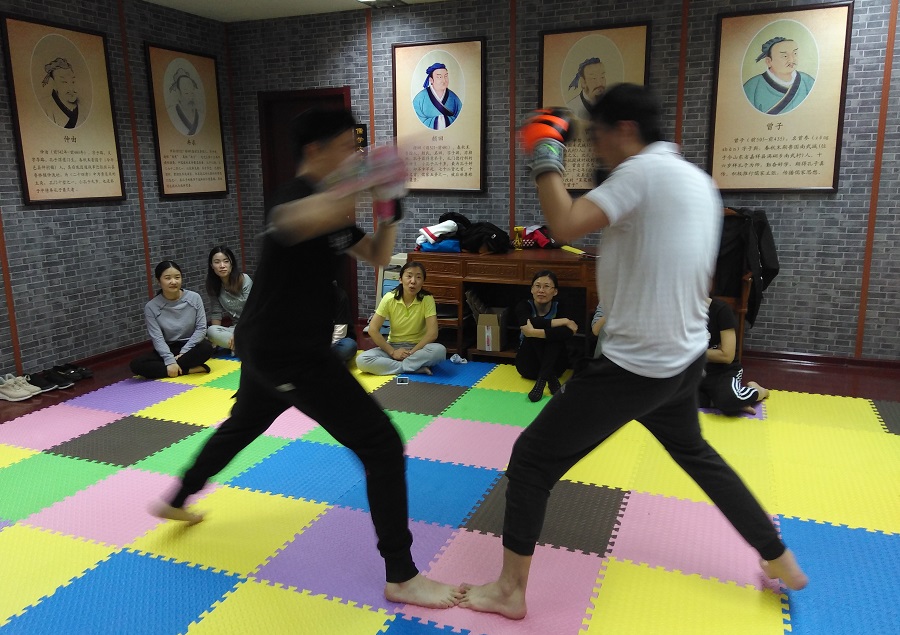 武术教练孙琪老师带领大家进行课前热身后,根据教学计划带领大家先复习了上节课的学习内容,然后又细致的对今天新学的招式进行讲解和示范。在学员们两两PK的过程中,孙教练并对每个学员的动作进行了一对一的指导。学员们投入练习,尽可能的把动作做到位,热情高涨,兴致盎然!