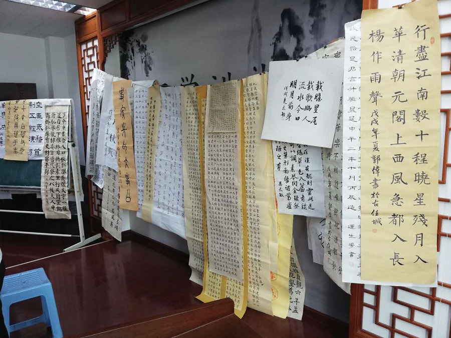 按照上节课的要求,大家都带了自己在家创作的新作品三幅,并主动挂在展示墙上供老师和同学们点评。很明显,在刘培露副院长的指导下,经过前六次课一遍遍的临习和创作,同学们的作品已经实现了质的飞跃。