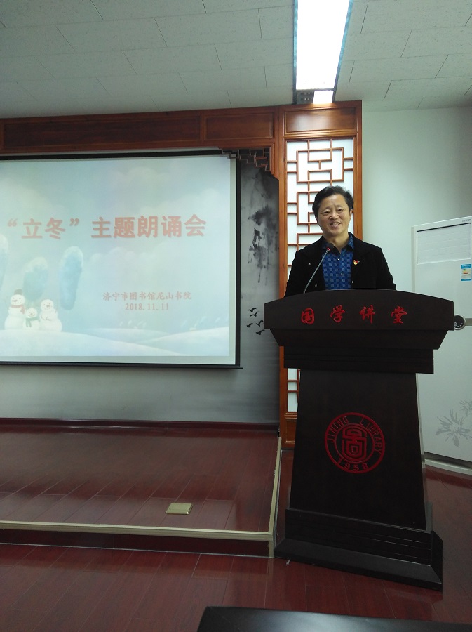 11月11日上午,由济宁市图书馆尼山书院联合济宁市仙营街道公益服务中心、济宁市读书协会举办的“立冬”主题朗诵会圆满成功。此次朗诵会特别邀请济宁市读书协会会长郭玉先生担任评委嘉宾,郭会长对此次朗诵会给与高度评价,对现场朗诵的15位选手表示肯定并逐一进行点评。选手们一致表示,朗诵会意义非凡,将继续努力,争取下次有更好的表现!