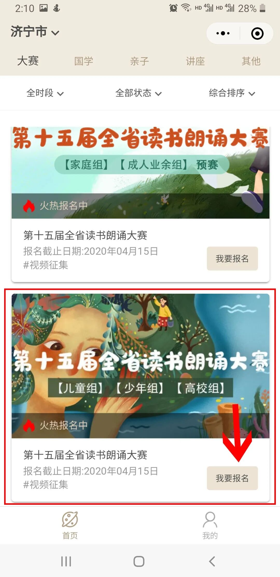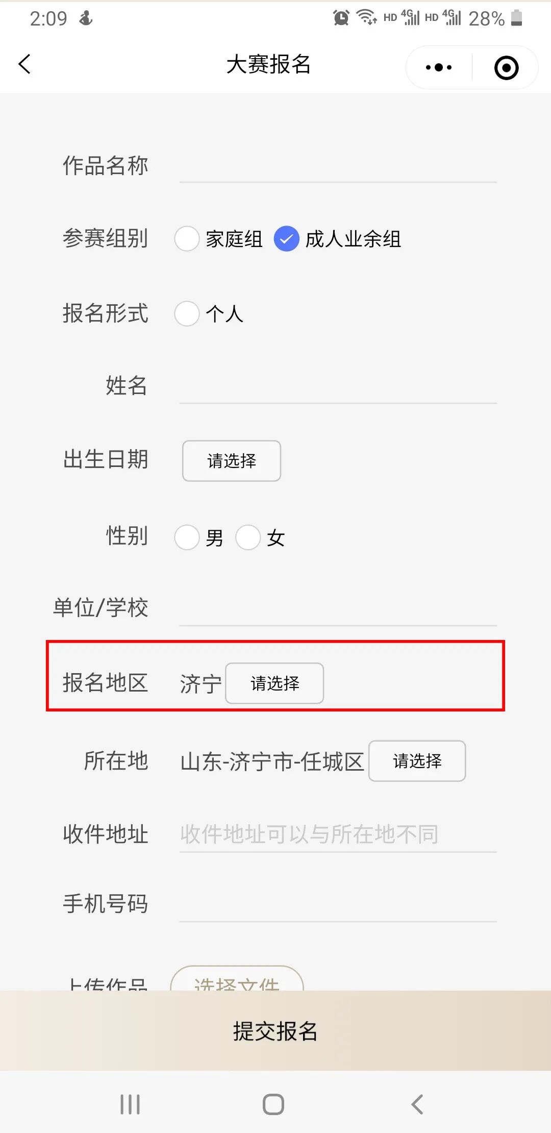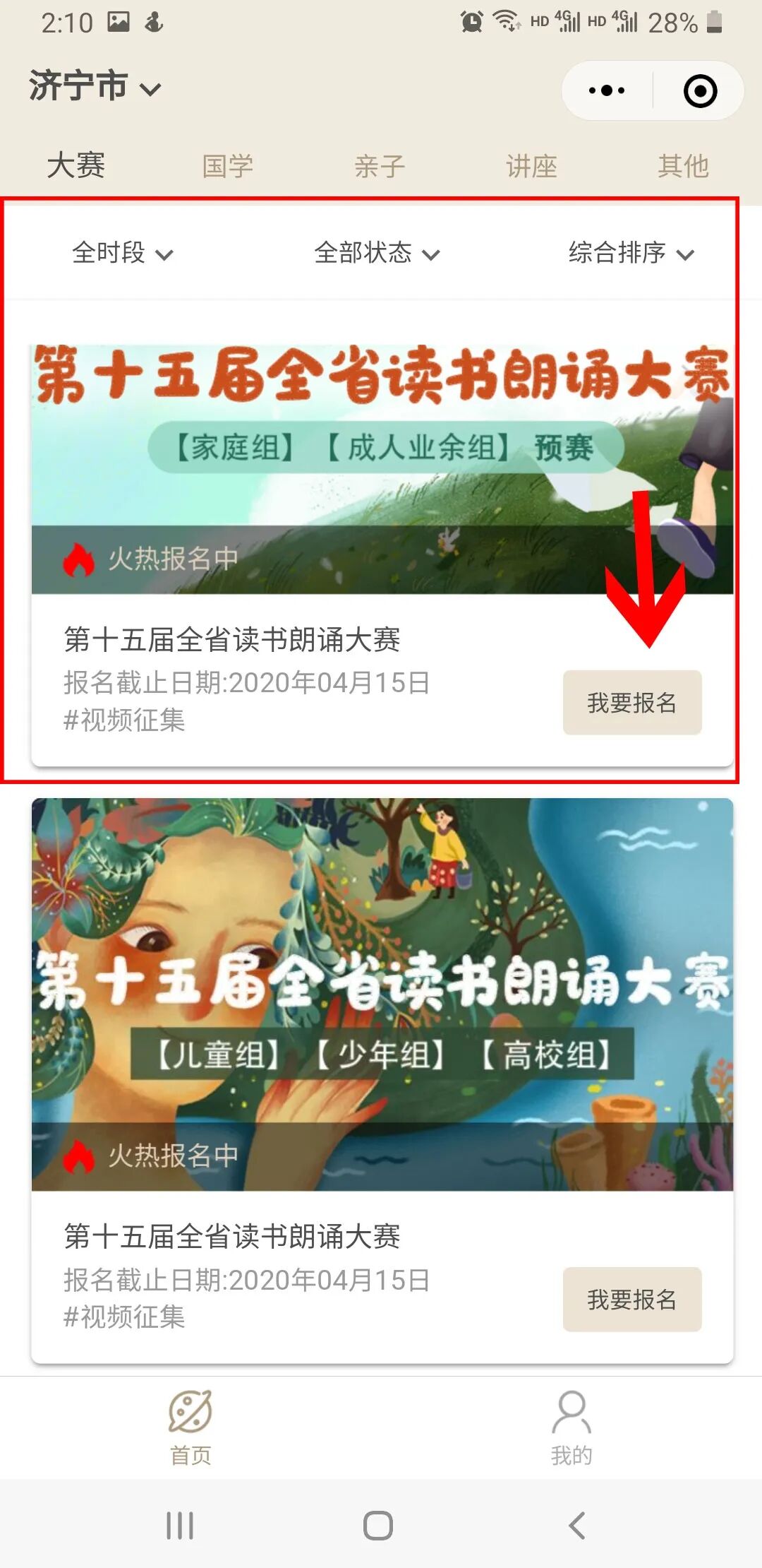 成人业余组和家庭组参赛选手直接通过“山东公共文化云”(http://www.wenmind.com)端口按要求上传参赛视频,市图书馆负责组织成人业余组和家庭组两个组别初赛的线上打分,并择优选拔参加全省总决赛,决赛由省组委会组织评选。请选手务必选择“济宁地区”。