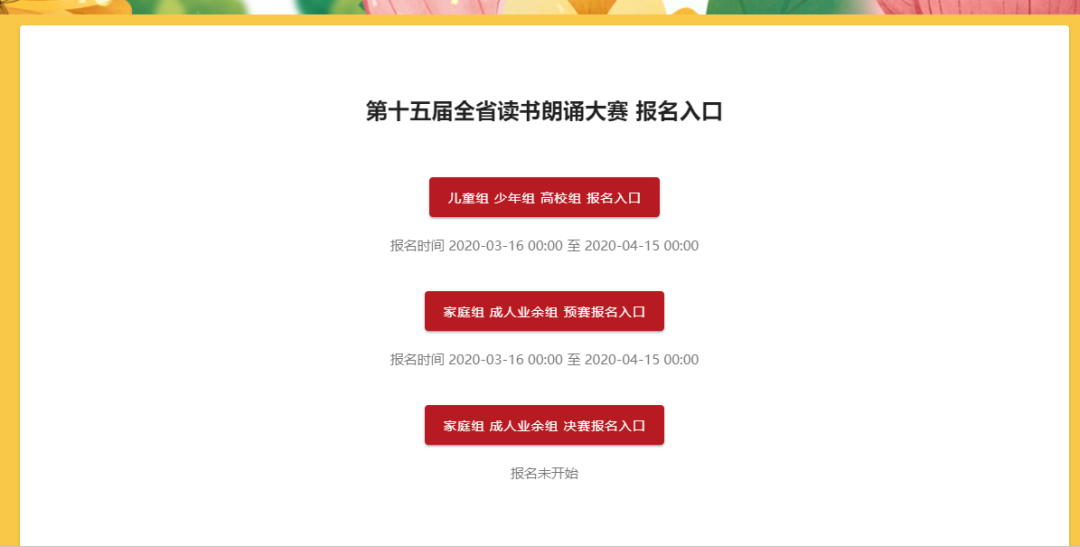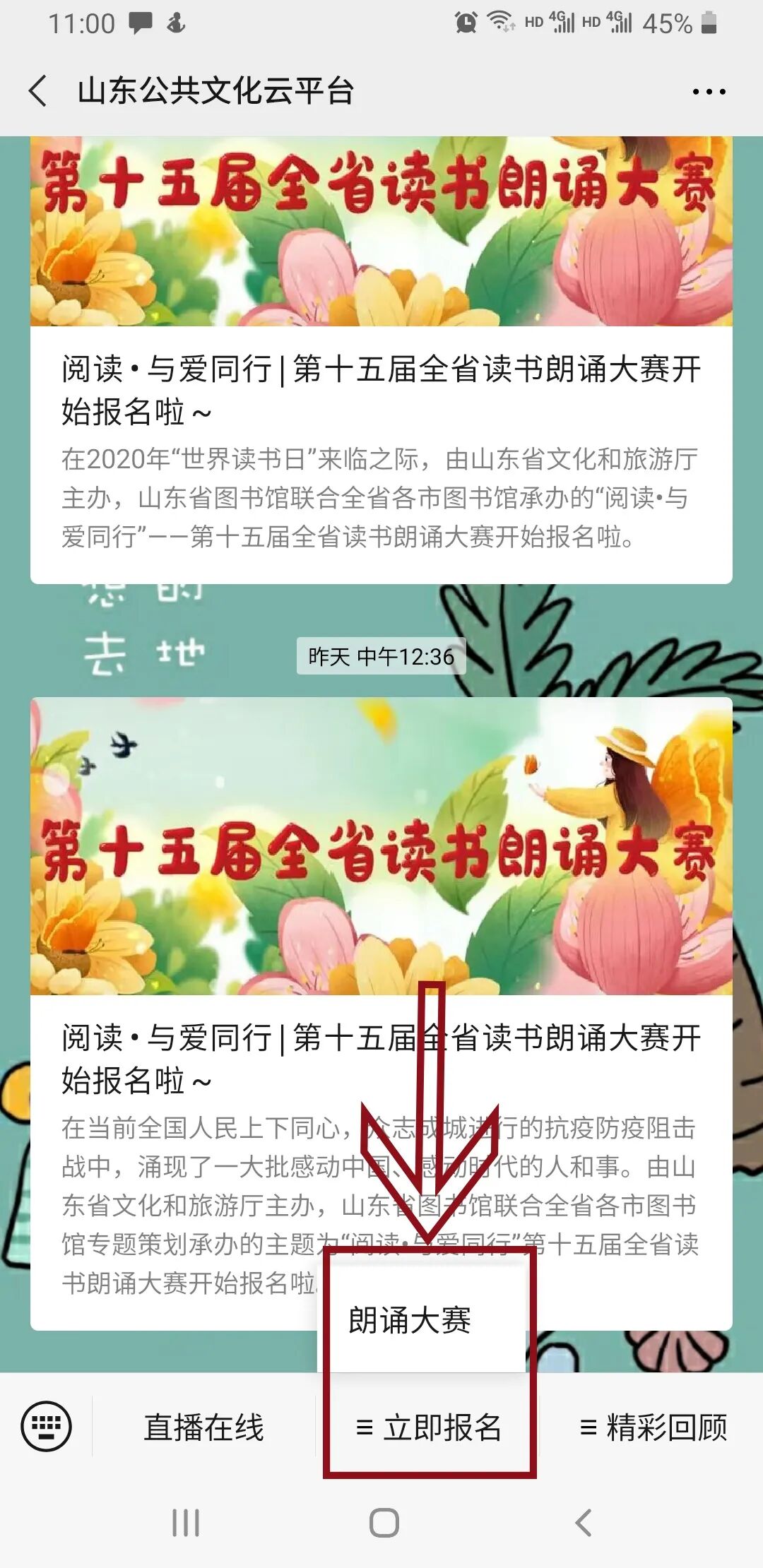 进入【山东公共文化云】官网——点击【专题】——点击【第十五届全省读书朗诵大赛】点击右上角“注册”按钮,输入手机号-手机验证码-密码,并勾选《山东公共文化云用户服务条款》完成注册,注册成功后自动弹出登录弹窗,登录成功后即可参与活动报名。
