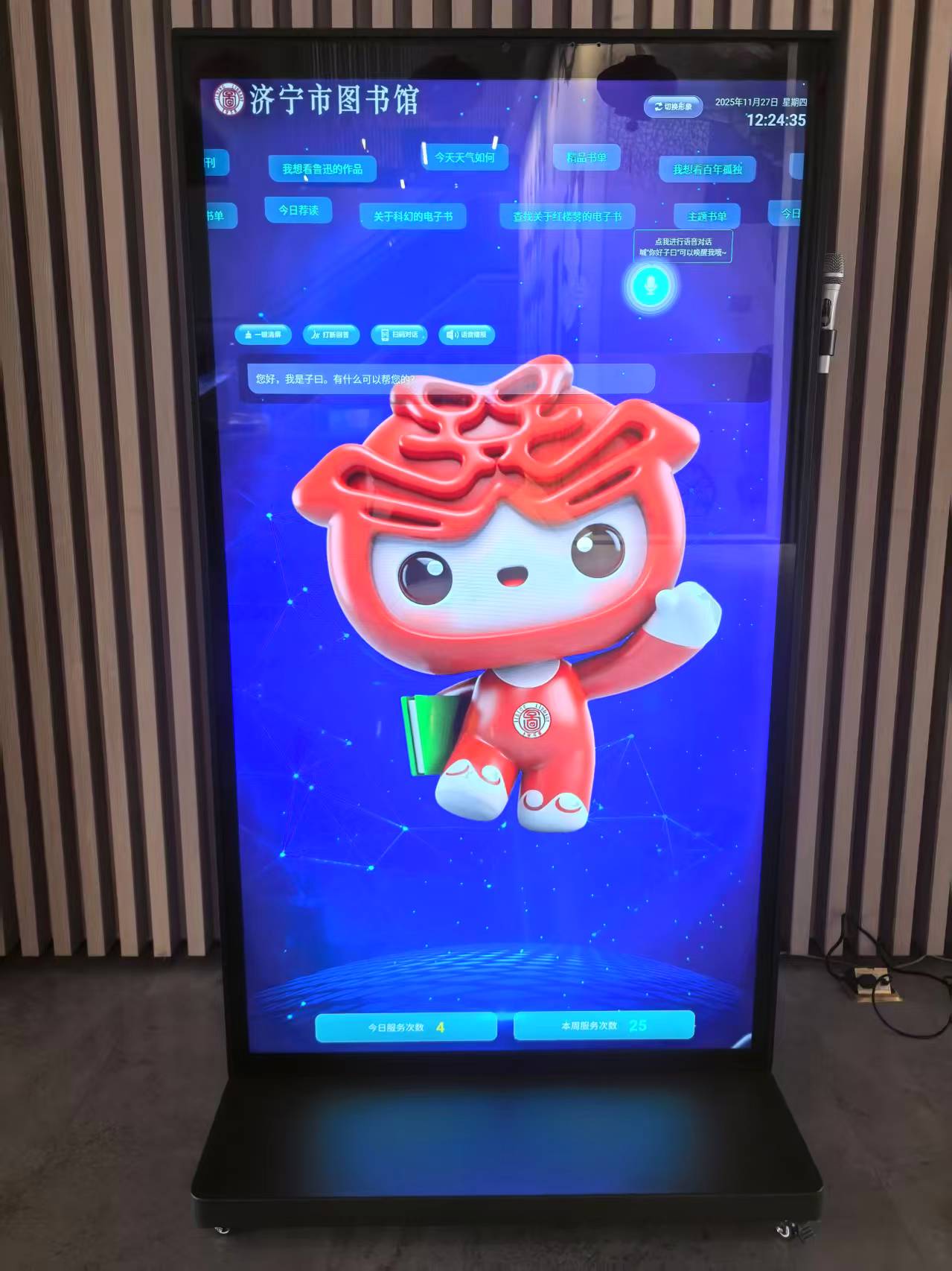 子曰交互屏在济宁市图书馆二楼大厅服务台自助检索查询区,欢迎您到馆互动体验。