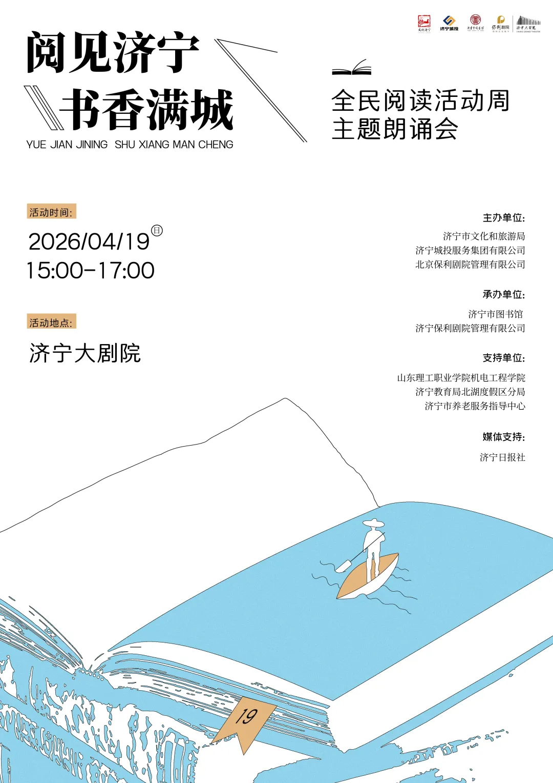 【活动时间】2026年4月19日(周日)15:00 【活动地点】济宁大剧院 【活动时长】90分钟 【活动预约】 长按识别二维码1 元预约参加 PART01.济宁市全民阅读联盟 成立仪式 为全面引领全民阅读新风尚,厚植城市阅读文化根基,以书香为“核”,以“阅读推广”为桥,携手共建:“济宁市全民阅读联盟”,为“全民阅读”的种子,厚植一方沃土,静待满城花开,让书香的力量浸润万家。 PART02. 保利朗诵艺术团展演暨青少儿朗读共创课堂 让经典文字,在声音中重获生命力 朗诵团的孩子们带着对文字的敬畏与热爱,将经典篇章、红色记忆化作声声诵读,让书本里枯燥的文字,变成有温度、有画面、有情感的舞台作品。 在这里,您能听到看到文字背后的力量,能真切感受青少儿朗读艺术的魅力——原来阅读可以如此纯真动人,原来声音能让经典跨越时空,直抵人心。 朗读共创课堂 全民参与点亮阅读之光 这不是一场单向的观赏, 而是一次邀请您一起参与的体验课堂; 本次活动的核心,是青少儿朗读共创课堂 ——这是对传统阅读推广的全新升级, 更是“全民阅读”理念的生动实践! 这不是一次普通的课堂, 而是一场打破边界、双向奔赴的朗读共创课堂。 告别“老师讲、学生听”的单向模式, 共创课堂以“共创、共学、共诵”为核心, 面向全年龄段开放参与: 孙良博士现场引领, 拆解朗读技巧、点拨表达逻辑, 让孩子敢开口、会表达、爱朗读; 家长与孩子并肩参与、市民与少年同心共读, 在互动中碰撞思想、在共鸣中传递热爱。 在朗读中交流、在朗读中成长, 让阅读从“个人行为”变为“我们一起共创”, 双向的共创与成长——这就是:共创课堂 有声的互动与共鸣。 济宁大剧院保利朗诵艺术团艺术总监 孙良博士 中国传媒大学播音学博士; 国家级普通话水平测试员; 现任——山东青年政治学院播音主持系副教授、 口语传播研究所主任; 国家关心下一代委员会公共表达研究中心学术委员; 中华文化促进会朗读专业委员会理事; 山东省语言艺术专家委员会研究员; 山东省朗诵艺术家协会理事; 山东省演讲学会理事 剧场百人齐诵《长征》: 用集体之声,致敬信仰 当书香汇聚,当声音共鸣, 现场最震撼的时刻是剧场百人齐诵《长征》。 不分年龄、不分职业、不分身份, 全济宁的读书爱好者齐聚剧场, 以声传情、以诵传志。 因阅读相聚,因朗读同心, 在齐声诵读中, 感受《长征》的磅礴力量, 致敬革命先辈的初心信仰, 更在阅读中汲取奋进力量, 让红色基因与阅读习惯一同扎根心底。 无论你是热爱阅读的成年人, 还是渴望表达的青少年; 无论你是想带孩子感受朗读魅力, 还是想自己重拾阅读热爱, 我们都诚挚邀请你: 走进济宁大剧院,赴一场书香之约, 【主办单位】 济宁市文化和旅游局 济宁城投服务集团有限公司 北京保利剧院管理有限公司 【承办单位】 济宁市图书馆 济宁保利剧院管理有限公司 【支持单位】 山东理工职业学院机电工程学院 济宁教育局北湖度假区分局 济宁市养老服务指导中心 济宁市小记者团 【媒体支持】 济宁日报社