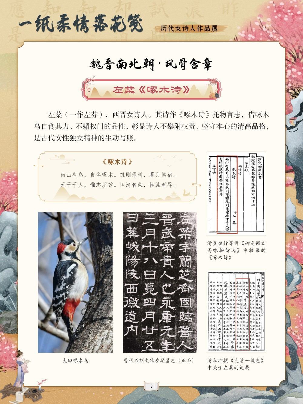 中华优秀传统文化是中华民族的精神命脉,是涵养社会主义核心价值观的重要源泉。在中国文学的璀璨星河中,历代女诗人以独特的生命体验与文学才情,为这条精神命脉注入了温润而坚韧的力量。她们挣脱时代的束缚,以诗为言、以笔为心,将闺阁情思、家国之念与觉醒之志凝于笔墨,书写了中华文脉中不可替代的璀璨华章。 从庄姜“燕燕于飞”的质朴吟唱到薛涛“虚心能自持”的清雅风骨,从李清照“生当作人杰”的铿锵誓言到秋瑾“休言女子非英物”的豪情壮志,每一首诗作都是一段生命轨迹的写照。这些文字或浅吟闺阁闲情,或抒发家国忧思,或呐喊觉醒之志,共同构筑起女性精神世界的璀璨图景。回溯千年诗心,致敬巾帼才情。 值此妇女节来临之际,我们特别策划了“一纸柔情落花笺——历代女诗人作品展”,邀您在“燕燕于飞”的古调与“致橡树”的新声中,读懂她们的才情与坚守,感受中华女性文学的深厚底蕴,让这份流淌千年的诗意,成为滋养当下心灵、坚定文化自信的不竭力量。 展览地点:济宁市图书馆二楼大厅 展览时间:即日起至3月31日